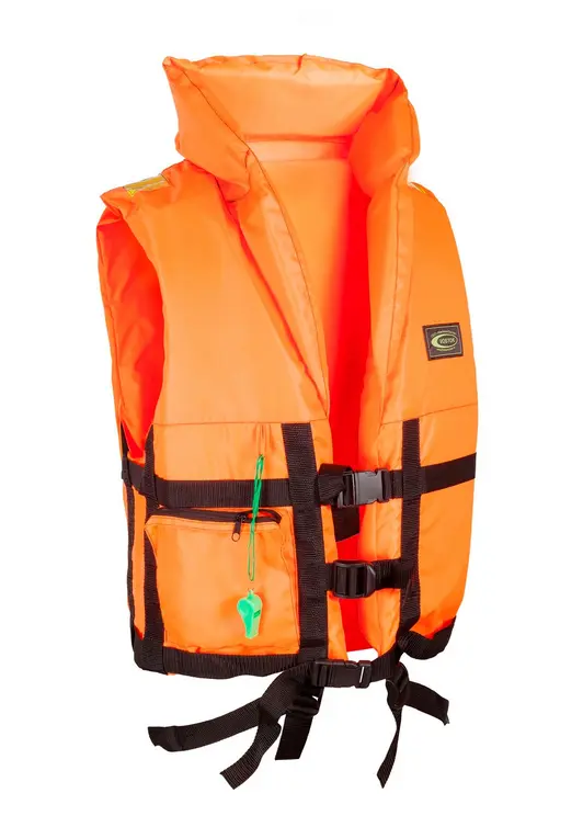 Спасательный жилет из ткани сигнального цвета со светоотражающими полосами (для легкого обнаружения в темноте). Наполнитель пенополиэтилен в несколько слоев, что позволяет поддерживать человека на плаву в бессознательном состоянии долгое время.