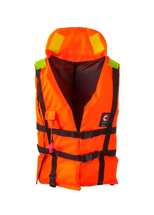 Спасательный жилет COMFORT PILOT — это жилет сигнального ярко оранжевого цвета с универсальной подгонкой размера по фигуре, рассчитан для пользователей весом от 80 до 120 кг.