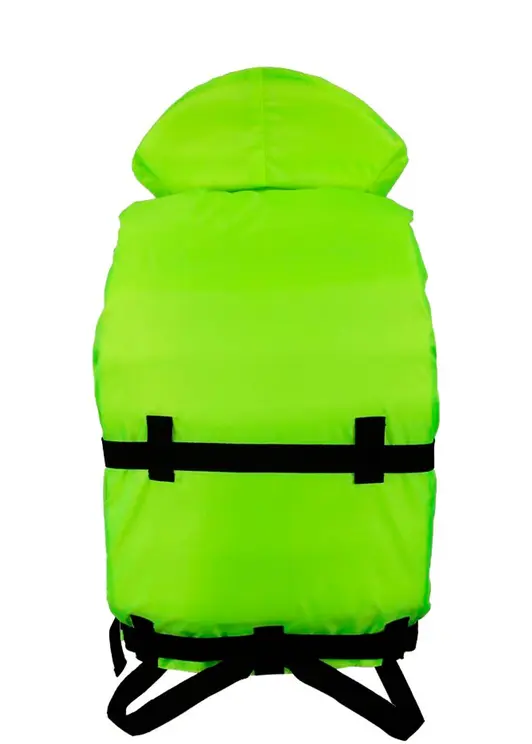 Для поддержания головы над водой у жилета имеется удобный подголовник (воротник) с сигнальными полосами, которые обеспечивают видимость местонахождения человека в темное время суток. Жилет имеет два больших кармана с клапанами и нагрудный кармашек, в котором находится сигнальный свисток. Для надежного удержания человека при падении в воду у жилета предусмотрены регулируемые стропы на поясе и груди, а также паховые ремни. Надежная тракторная молния и поясные ремни с застежками надежно фиксируют спасательный жилет на Вашем теле.