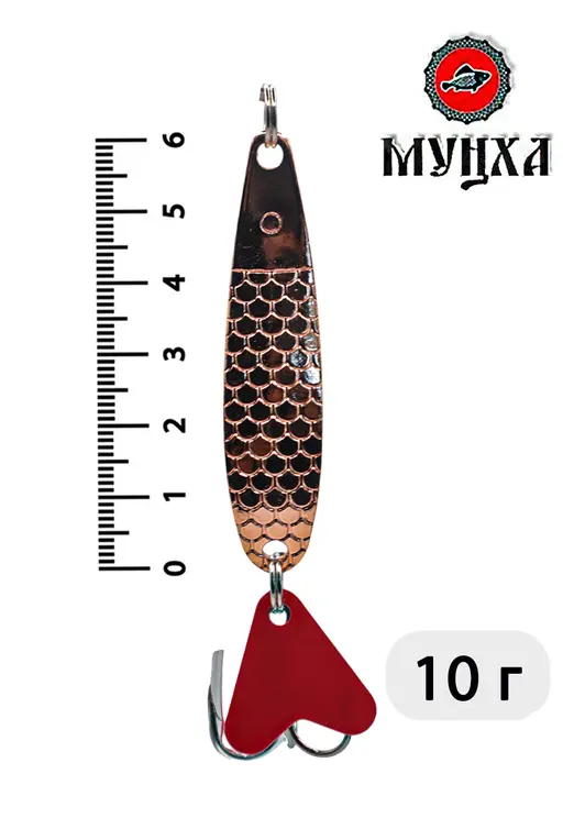 Колеблющаяся блесна «Мунха» размера 20# весом 10 грамм в медном исполнении — эффективная приманка для ловли хищной рыбы. Характерная форма и оптимальный вес обеспечивают привлекательную игру при любой скорости проводки. Золотистое покрытие привлекает внимание хищника, особенно в условиях слабой освещённости.