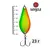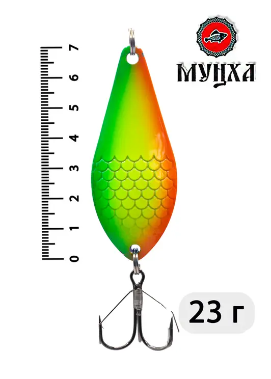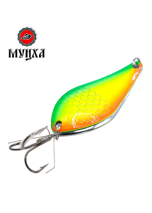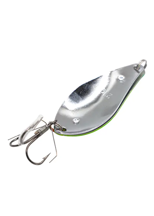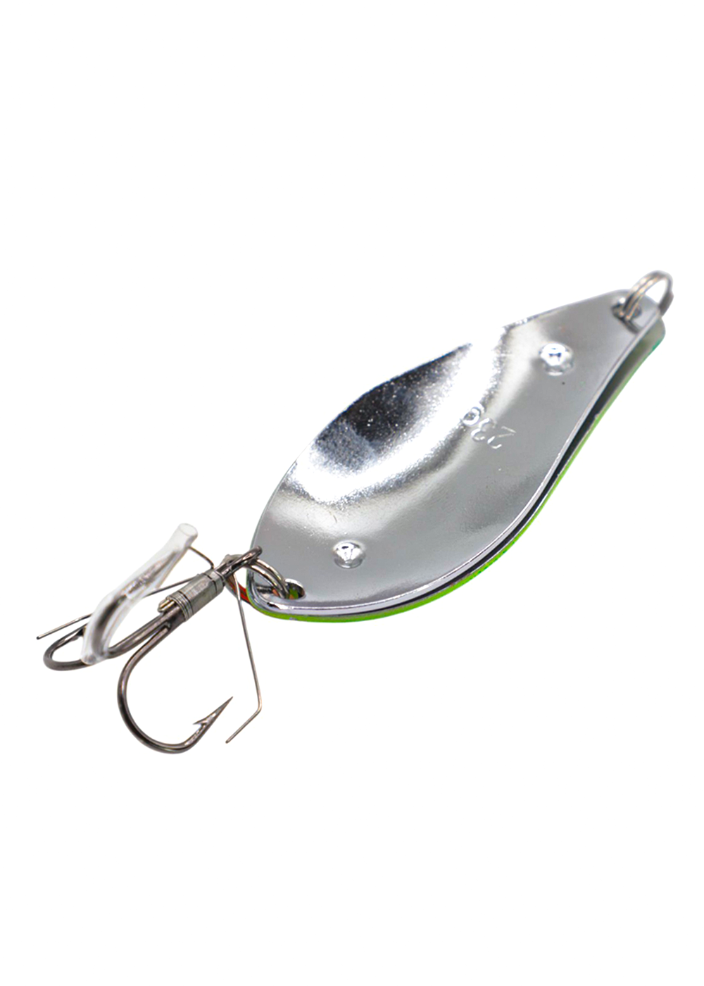 Приманка изготовлена из высококачественного металла с надёжным защитным покрытием, которое обеспечивает долговечность и защиту от коррозии. Сочетание флуоресцентного и серебристого цветов делает блесну особенно заметной в воде при любой освещённости, эффективно привлекая внимание хищника.
