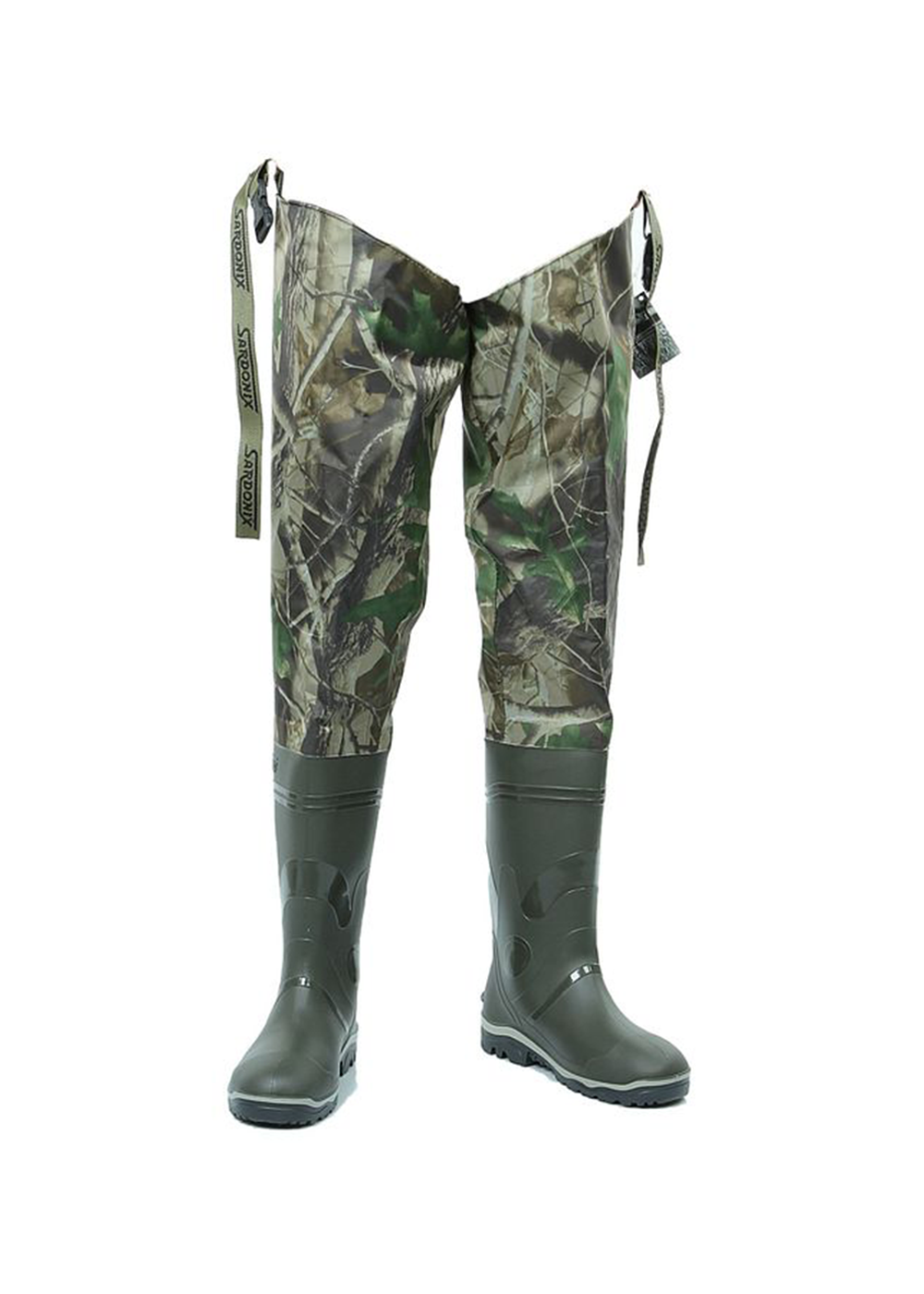 Рыбацкие сапоги «Калипсо» 167-03 — высокие болотные сапоги до бёдер из комбинации ПВХ и нейлона, где нижняя часть изготовлена методом трёхкомпонентного литья из ПВХ, а верхняя представляет собой водоотталкивающую нейлоновую надставку. Область колена защищена специальным наколенником из винитола и поролона для усиленной защиты от механических повреждений. Модель оснащена фиксирующим ремешком для крепления к одежде или ремню, имеет температурный режим эксплуатации от -10°C до +30°C и обеспечивает полную защиту от воды при передвижении по подтопленным участкам. Идеальное решение для рыбалки и активного отдыха на природе.