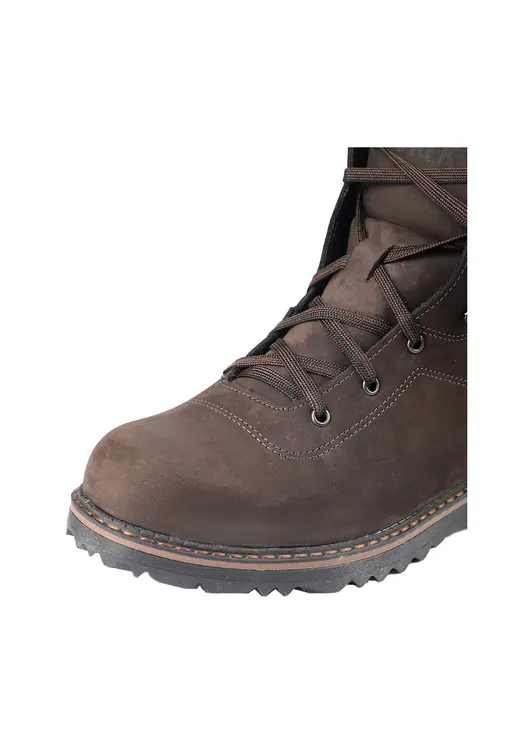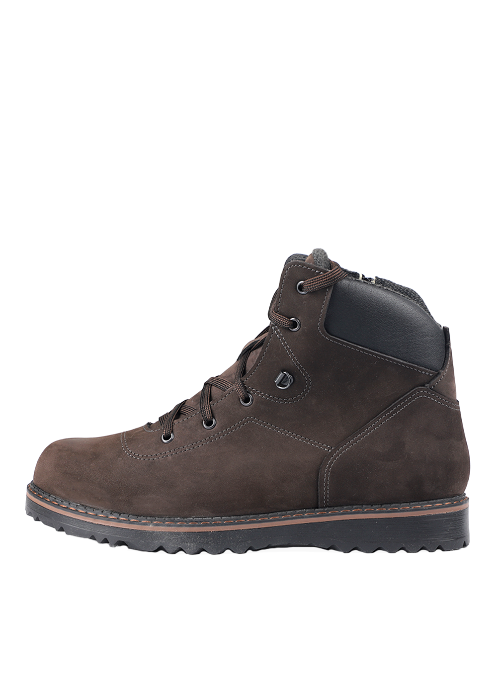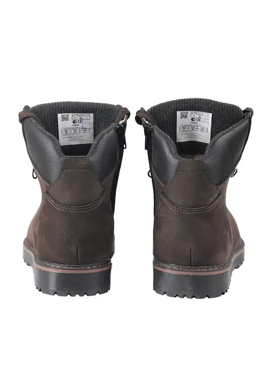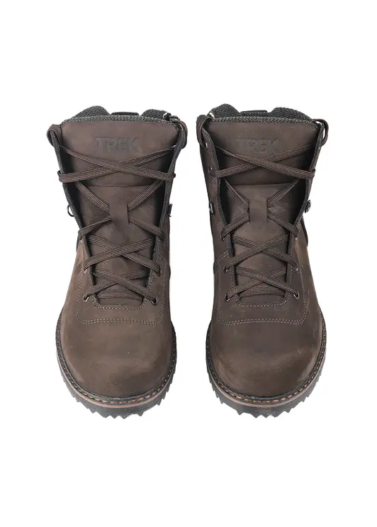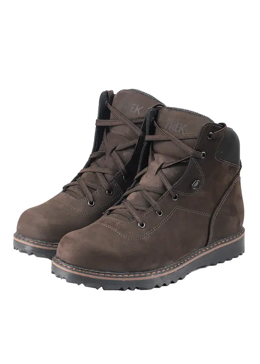 Ботинки TREK Мотовилиха коричневого цвета — практичная зимняя модель с верхом из качественного нубука и утеплённой подкладкой из шерстяного меха (смесь овечьей шерсти с синтетическими волокнами), обеспечивающей тепло до −30°C. Оснащены удобной системой фиксации: классической шнуровкой в сочетании с молнией для быстрого надевания. Подошва из термоэластопласта гарантирует хорошее сцепление с различными поверхностями. Продуманная конструкция и водоотталкивающая пропитка обеспечивают защиту от влаги, хотя рекомендуется дополнительная обработка специальными средствами для продления срока службы. Подходят для городской эксплуатации и активного отдыха в зимний период.