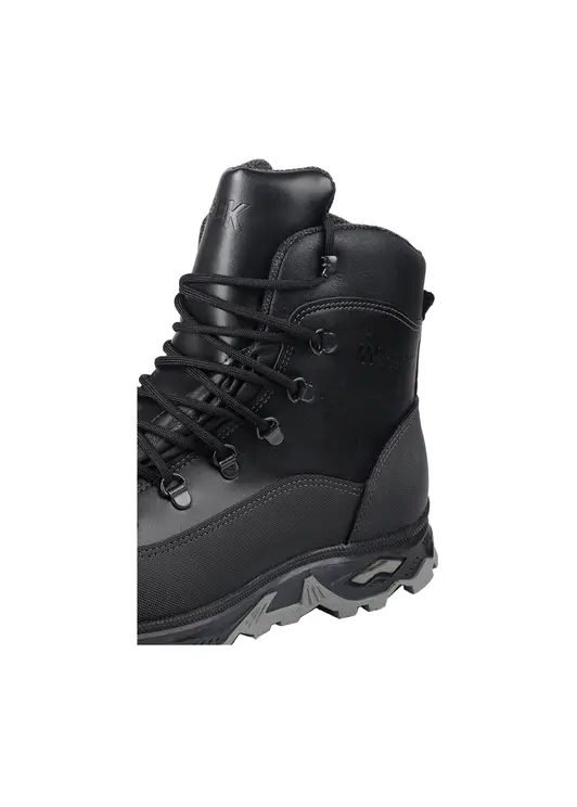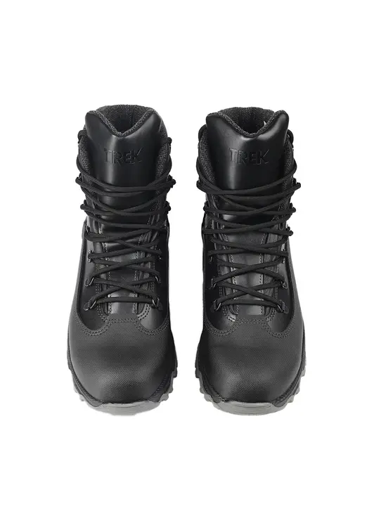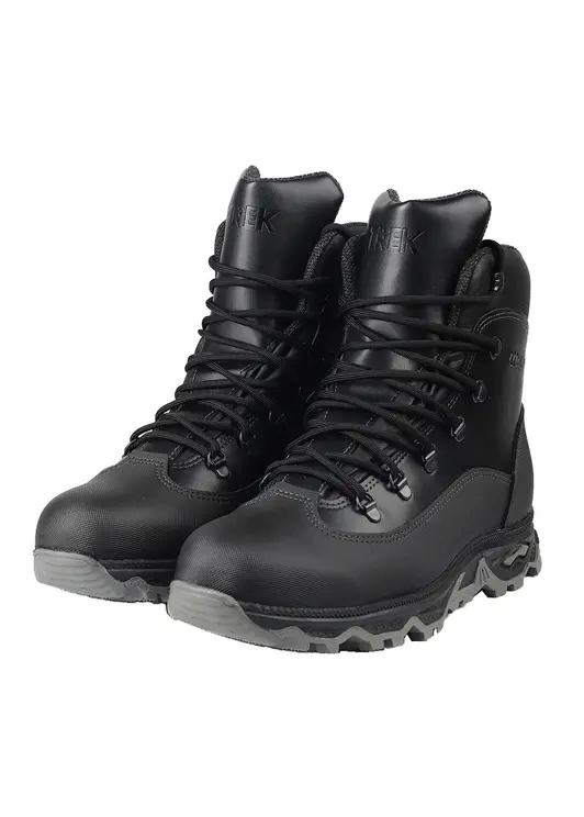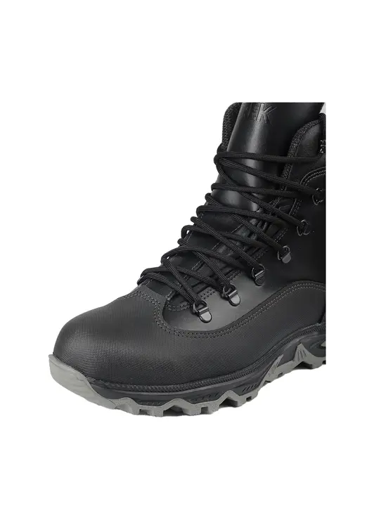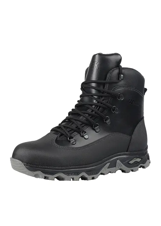 Ботинки TREK Turist26 Anti-P чёрного цвета с шерстяным мехом — надёжная зимняя обувь для активного использования при температуре от −10°C до −30°C. Модель выполнена из натуральной кожи с подкладкой из шерстяного меха для максимального тепла и комфорта. Оснащена интегрированной антипрокольной кевларовой стелькой (ИАКС), выдерживающей нагрузку до 1200 Н, что защищает от проколов острыми предметами. Подошва из термоэластопласта обеспечивает отличное сцепление с поверхностью и сохраняет свои свойства при низких температурах. Высокий берц надёжно фиксирует голеностоп, а продуманная конструкция защищает от попадания снега и влаги. Идеальны для туризма, охоты и активного отдыха в холодное время года.
