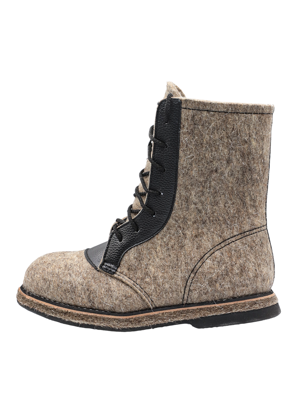 Войлочные берцы БВМ001 светло-коричневого цвета — тёплая и лёгкая зимняя обувь с натуральным утеплителем. Верх выполнен из качественного обувного войлока с кожаными вставками в зоне шнуровки для защиты от деформации. Подошва комбинированная: войлочная основа с морозостойким ЭВА-покрытием обеспечивает отличное сцепление и амортизацию при ходьбе.
