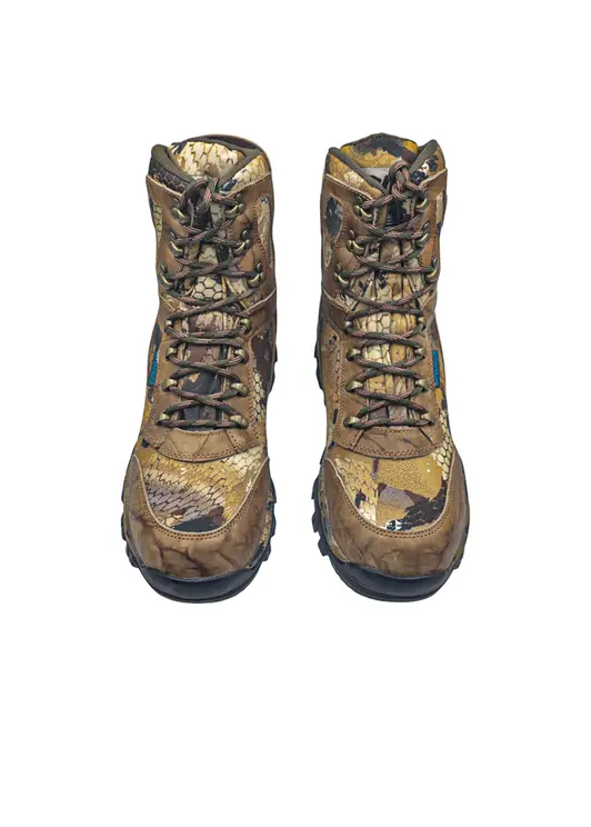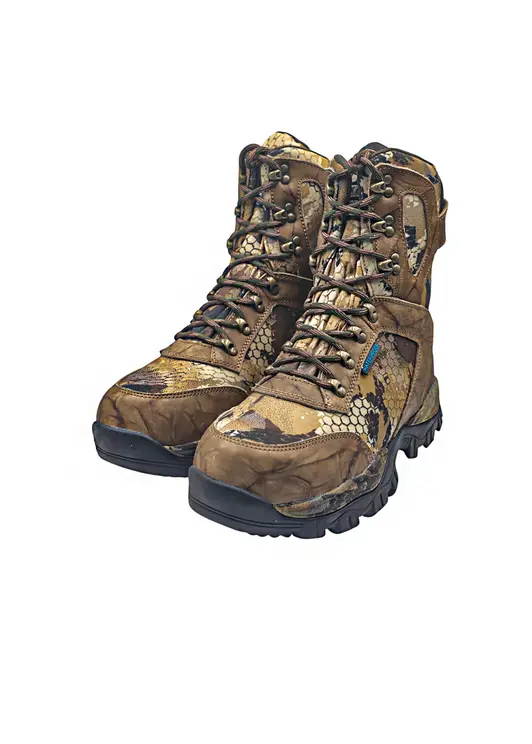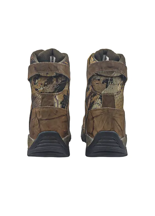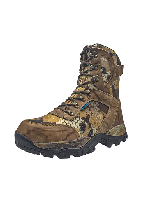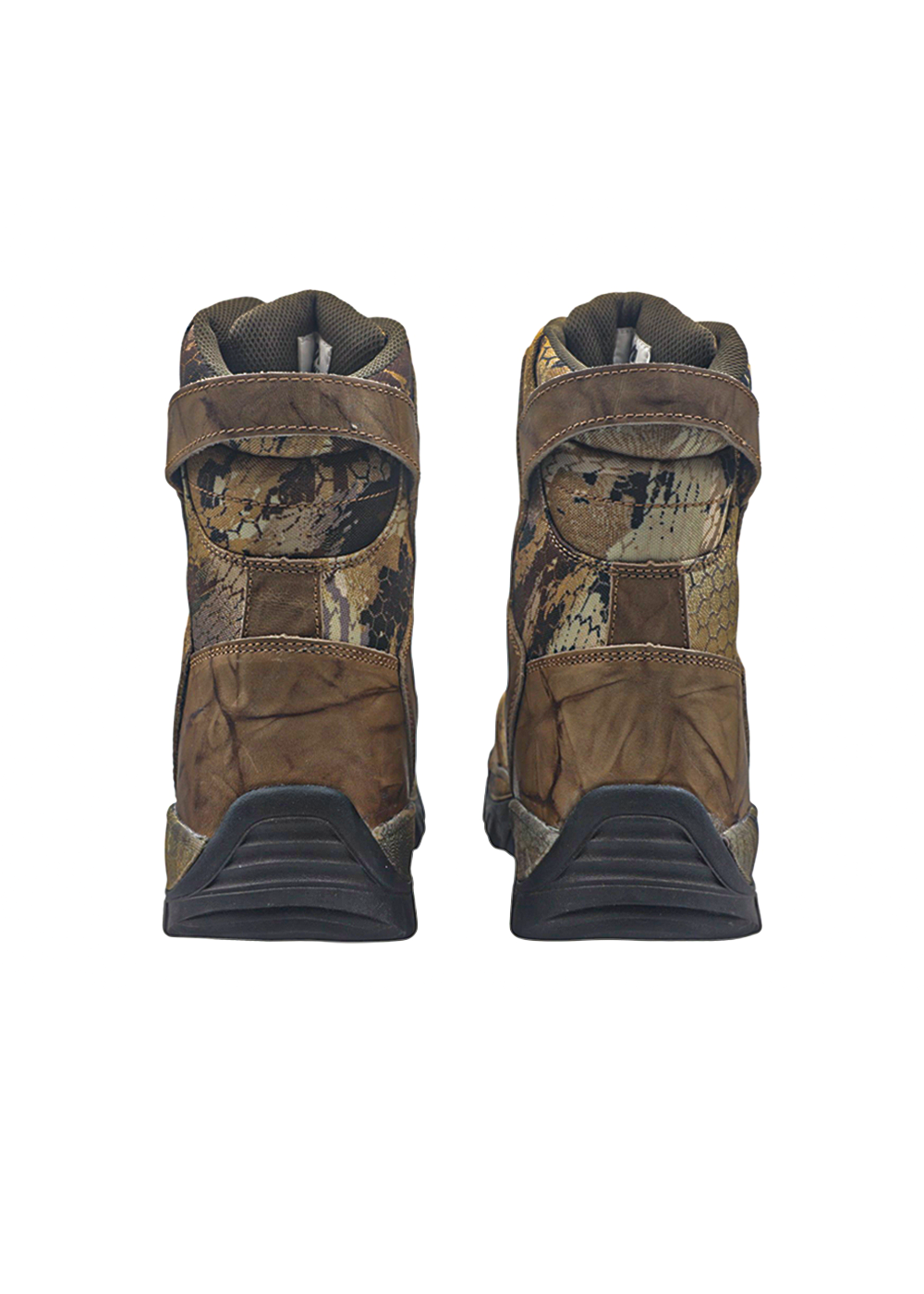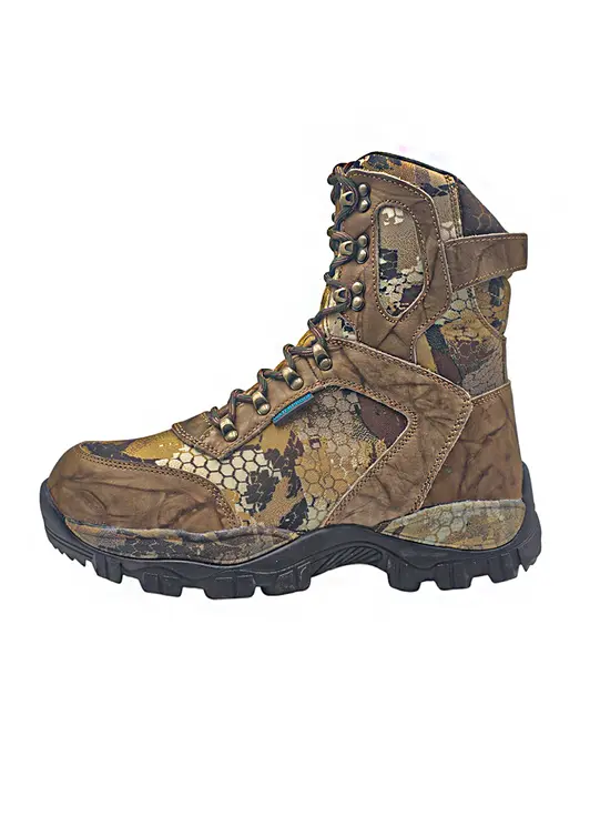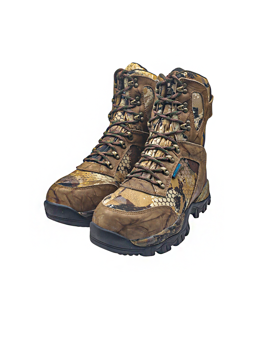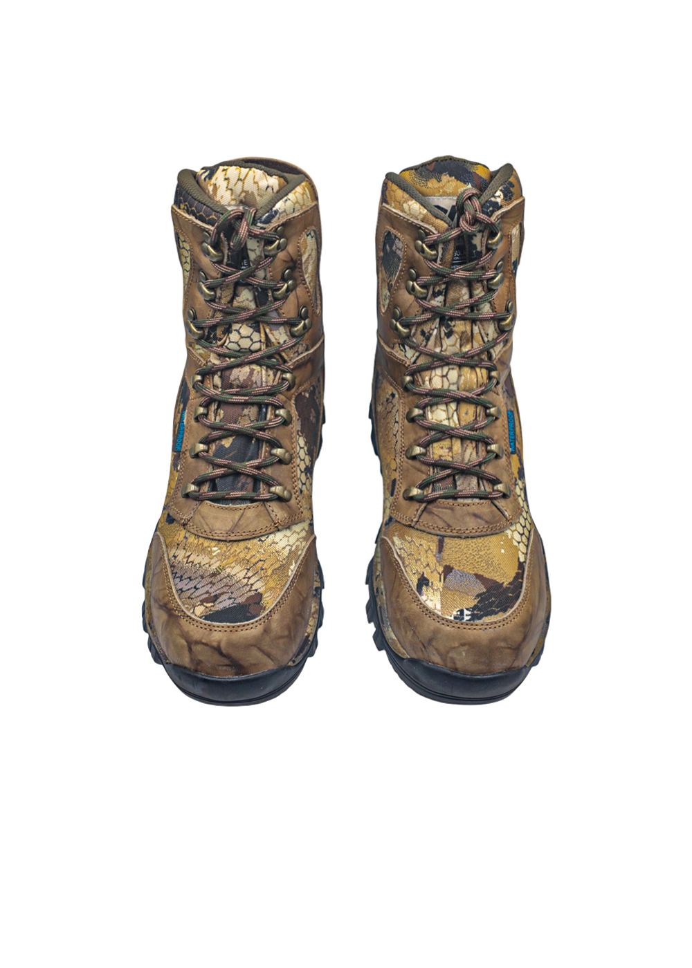 Трекинговые ботинки с высоким берцем и анатомической подошвой разработаны для продолжительной ходьбы весной и поздней осенью по пересеченной местности. Отлично подойдут не только для охоты, но и для повседневной носки или туристических походов. Специальная стелька впитывает влагу от ноги и нейтрализует неприятные запахи. В производстве обуви используется водонепроницаемая мембран, которая выпускает испарение изнутри, но при этом не пропускает влагу снаружи. Ботинки хорошо защищены от попадания влаги внутрь до уровня шнурков, а выше от снега. Ботинки усилены премиальной кожей, с камуфлированной текстурой. Материалы: Нейлон 900D, премиальная кожа, водонепроницаемая мембрана Duck Mania "Silver", подошва резиновая, утеплитель 3М Thinsulate 400 gr, амортизирующая стелька EVA. Температурный режим: в динамике от -10С до 0С, в статике от +0С до +10С.