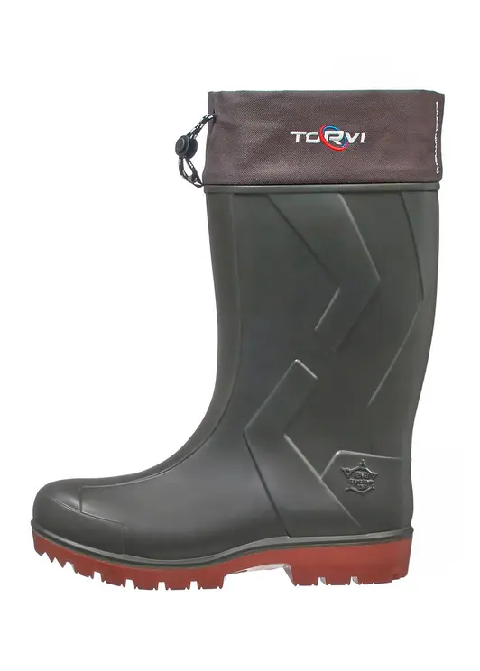 Сапоги TORVI из материала ЭВА с шипованной подошвой из полиуретана (ПУ) и 5-слойным вкладышем предназначены для эксплуатации при температуре до -40°C. Модель в оливковом цвете оснащена глубоким протектором и возможностью дополнительной установки шипов для улучшения сцепления. Конструкция включает цельнолитой верх из ЭВА и прочную подошву ПУ, которая защищает от промерзания и механических повреждений. Вкладыш состоит из спанбонда, фольги, нетканого полотна, полимера и гипоаллергенного трикотажа, что обеспечивает эффективную термоизоляцию. Манжета с фиксатором защищает от попадания снега и влаги, а общий вес составляет около 1720 грамм. Подходят для рыбалки, охоты и активного отдыха в условиях экстремально низких температур.
