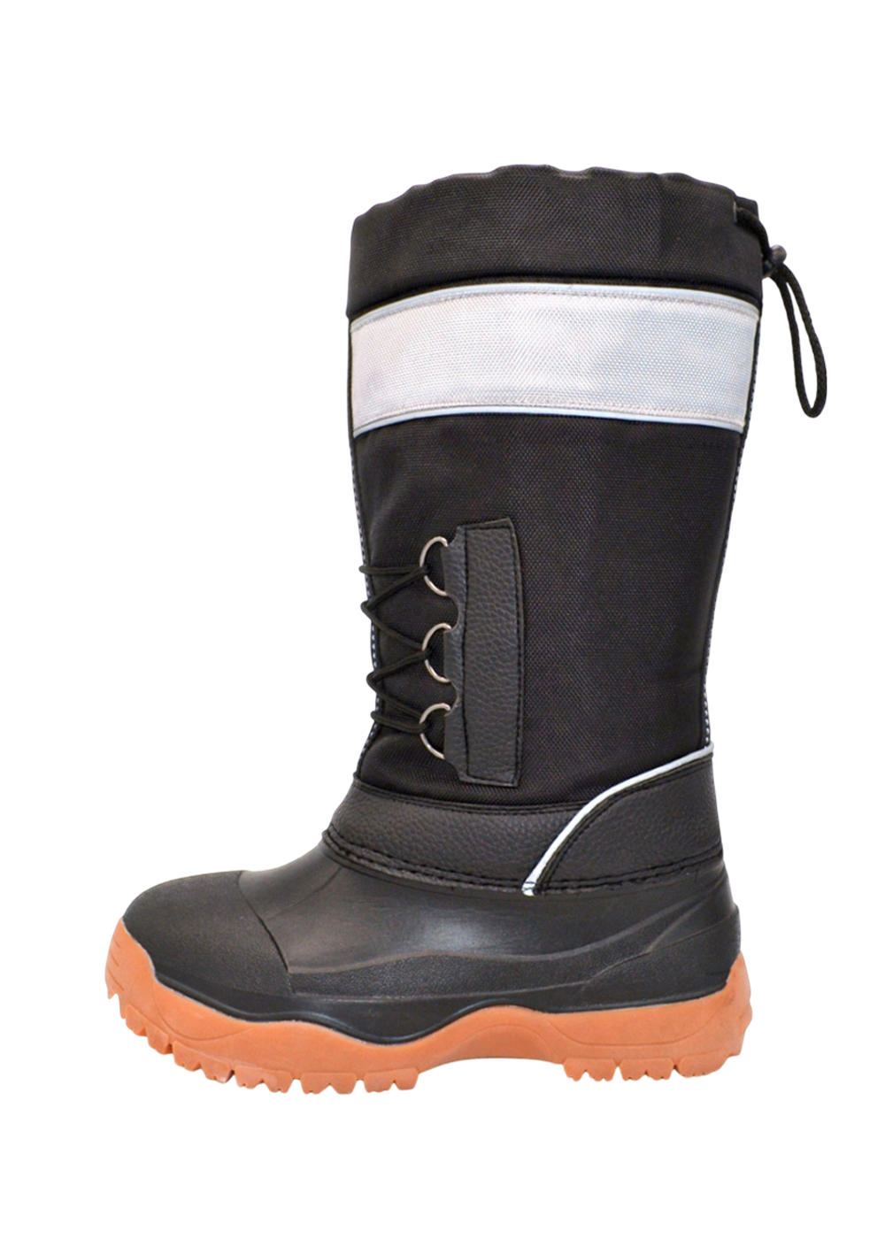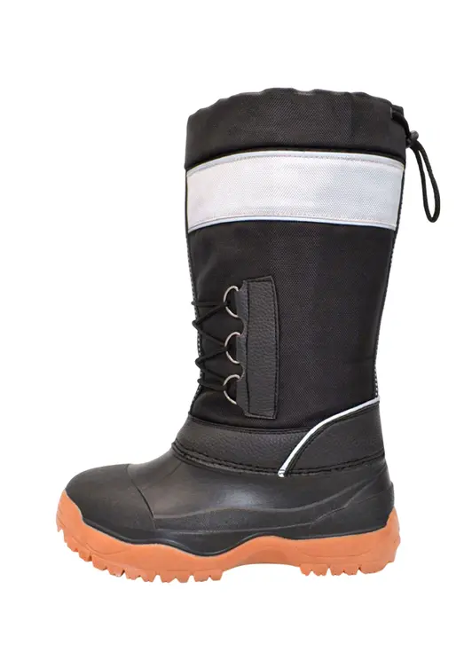 Мужские зимние сапоги ТИТАН(-100) чёрного цвета — экстремально тёплая обувь. Конструкция включает двойную галошу из ЭВА с резиновым нижним слоем, верх выполнен из влагоотталкивающей ткани Oxford с дополнительным нетканым материалом. Модель оснащена съёмным многослойным вкладышем с натуральным мехом (не менее 70% шерсти), регулируемой манжетой на кулиске и удобной шнуровкой выше лодыжки. Сапоги оборудованы светоотражающими элементами для безопасности и подходят для охоты, рыбалки и треккинга в условиях экстремального холода.