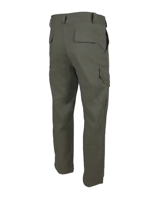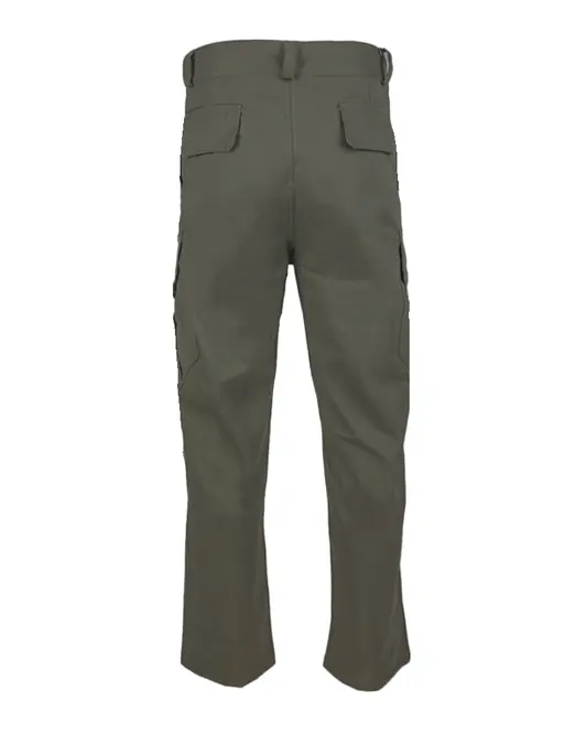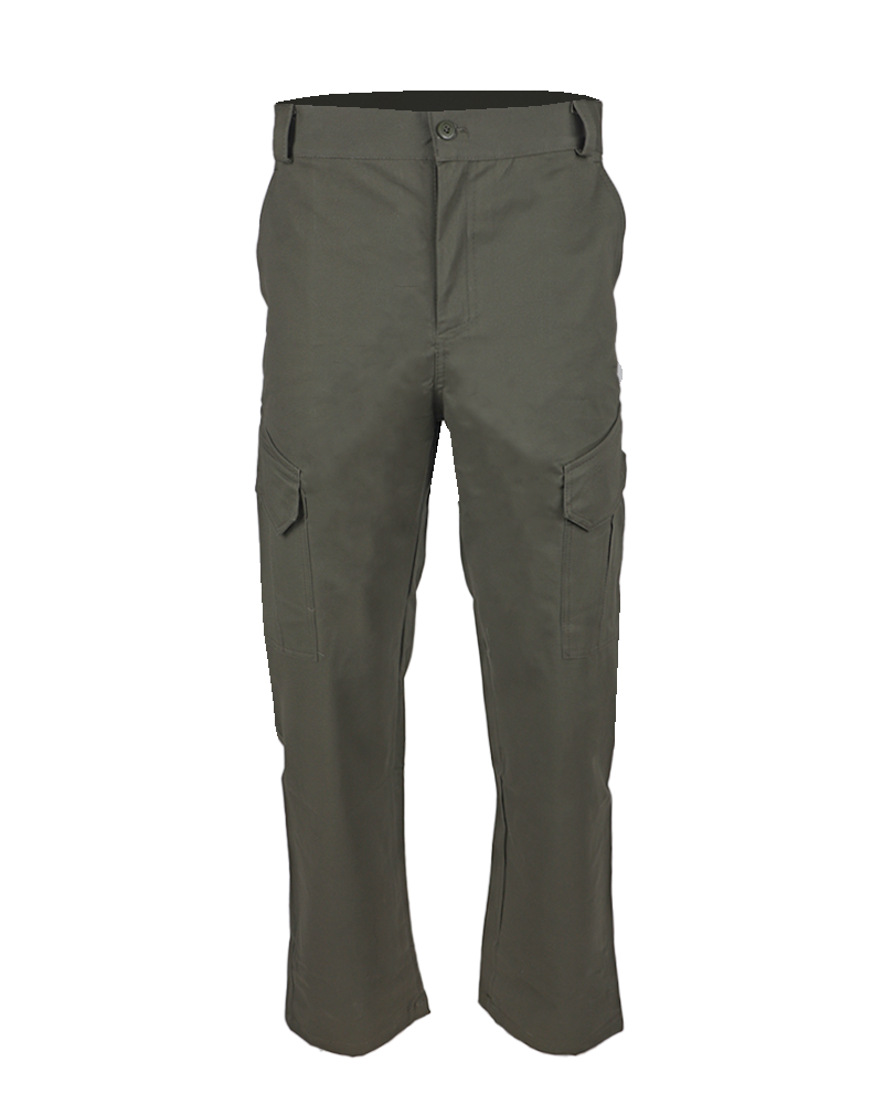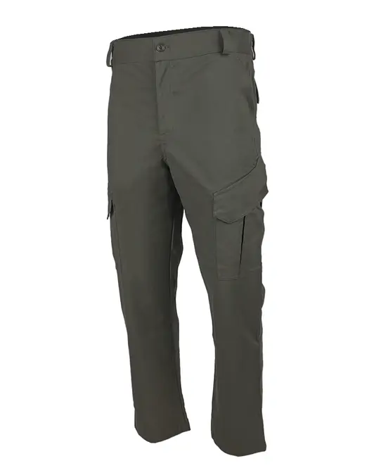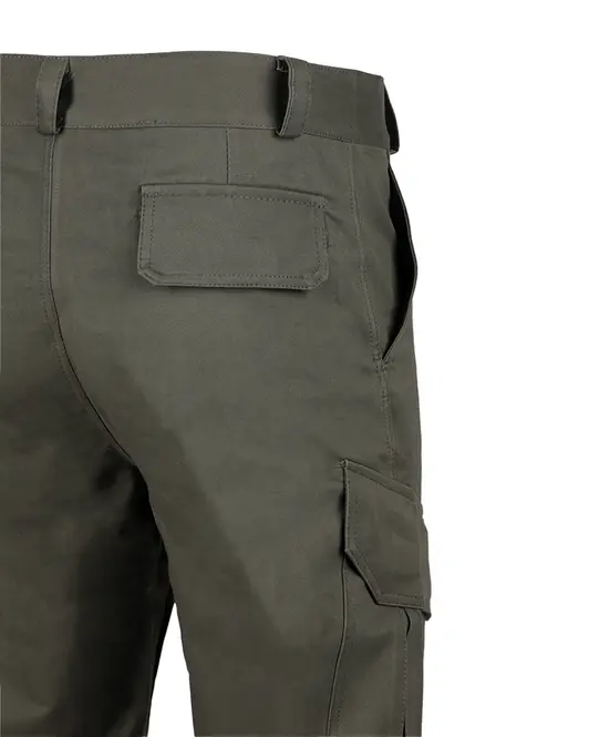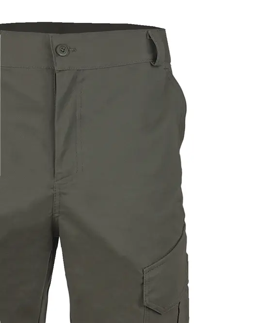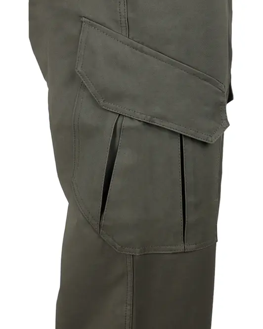 Застёжка пояса на пуговицу, застёжка гульфика на молнию. Два верхних боковых кармана с наклонными входами, два фигурных накладных кармана с клапаном на липучке и со складками для дополнительного объёма, два задних прорезных кармана с клапаном на липучке.