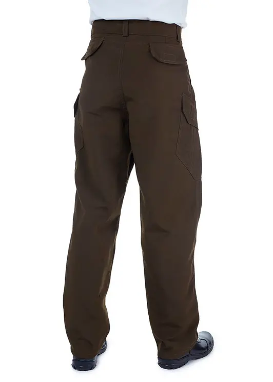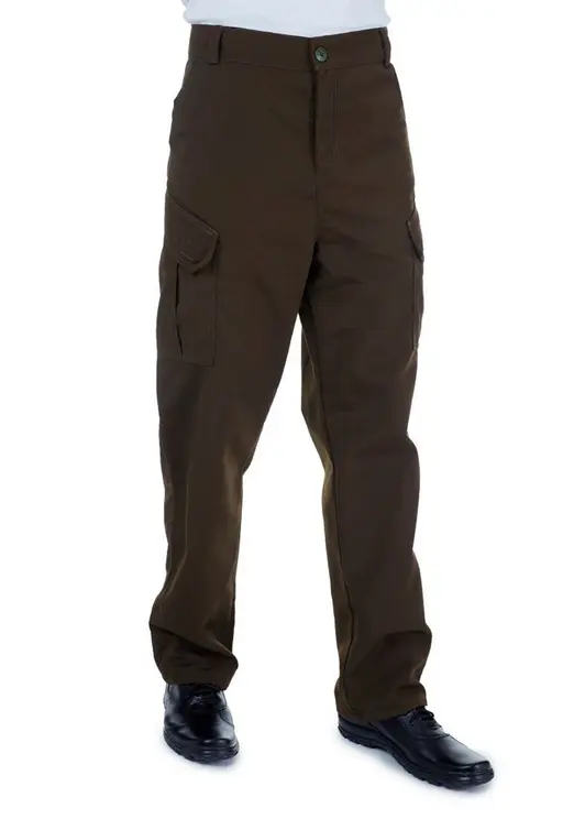 Застёжка пояса на пуговицу, застёжка гульфика на молнию. Два верхних боковых кармана с наклонными входами, два фигурных накладных кармана с клапаном на липучке и со складками для дополнительного объёма, два задних прорезных кармана с клапаном на липучке.