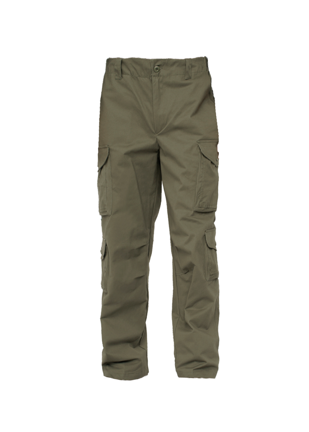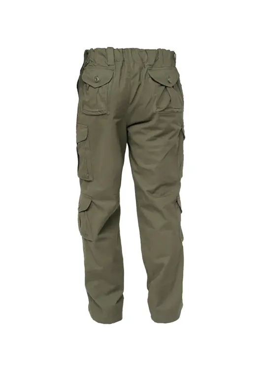 Брюки с боковыми карманами с фигурным входом. Ниже расположены накладные объемные карманы с клапаном, под ними накладные объемные карманы меньщего размера.. По низу ширина брюк регулируется кулисой .Пояс со шлевками и резинков по задней части пояса. На задней половинке брюк расположены накладные карманы с клапаном