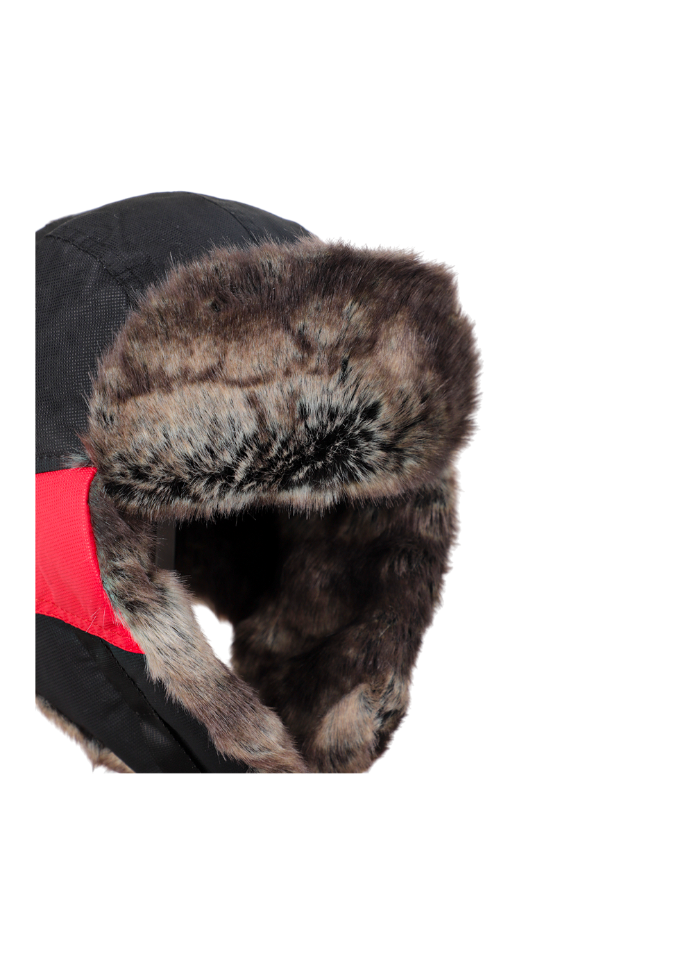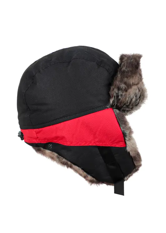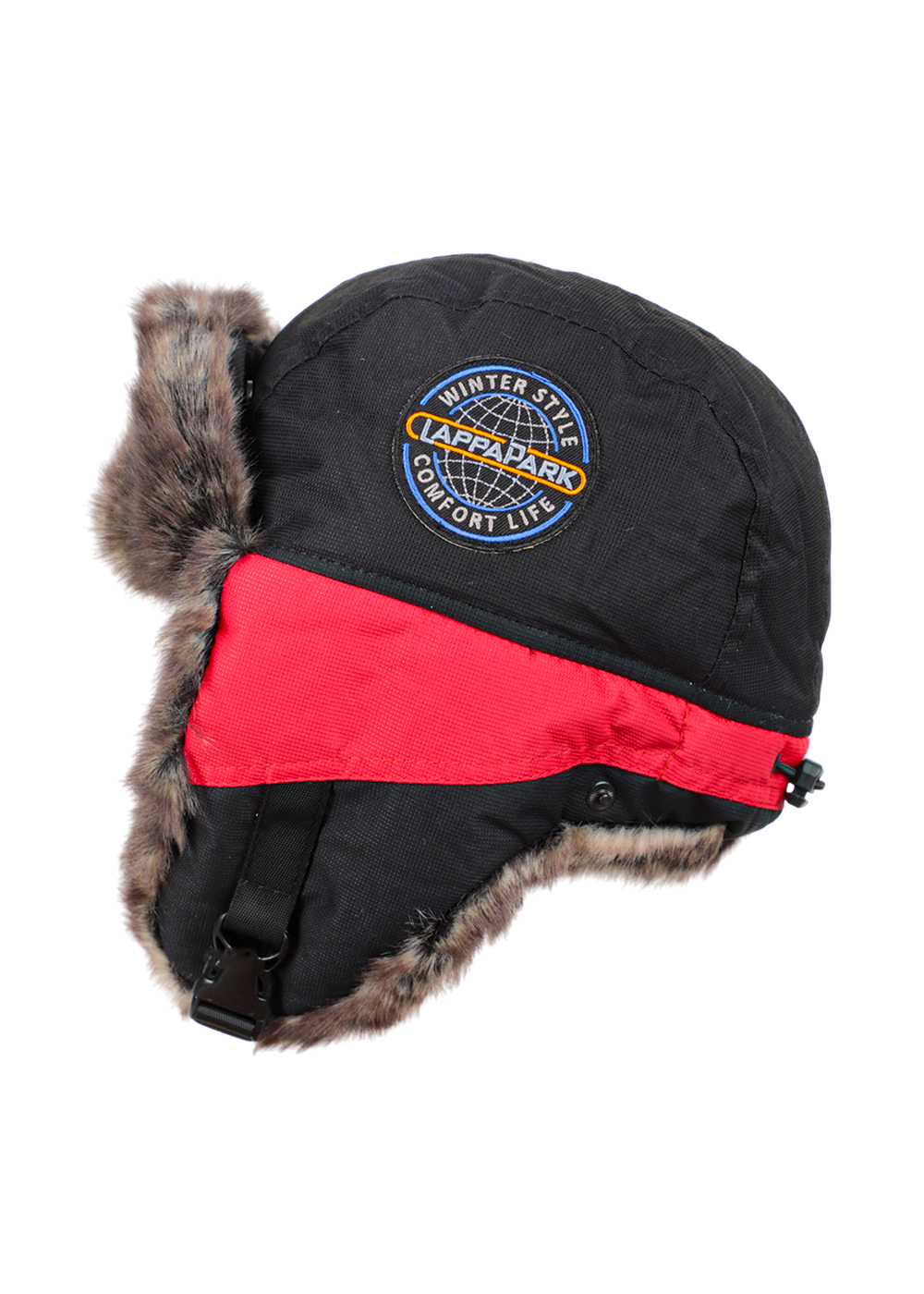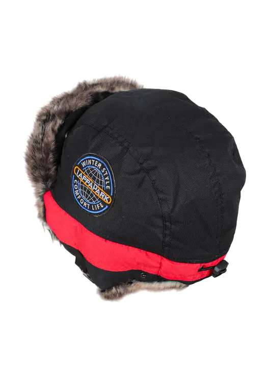 Ушанка Lahti + в черно-красной цветовой гамме с декоративной вставкой украшена отделкой из меха шиншиллы и стильным шевроном. Модель изготовлена из современной мембранной ткани с водоотталкивающими свойствами, дополнена утепленной подкладкой silver protection и внутренним слоем синтепона для оптимальной теплоизоляции. Конструкция включает регулируемый ремешок под подбородком и кнопки для фиксации ушей в поднятом положении, что позволяет адаптировать шапку под различные погодные условия
