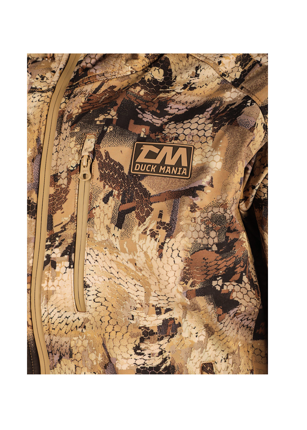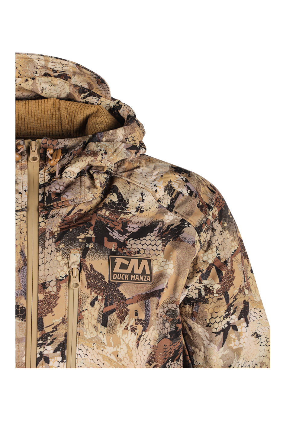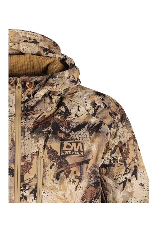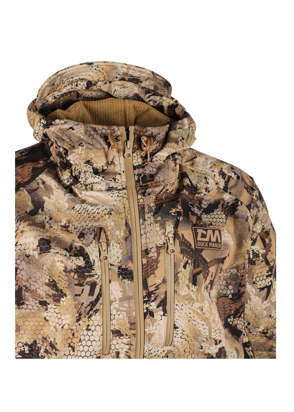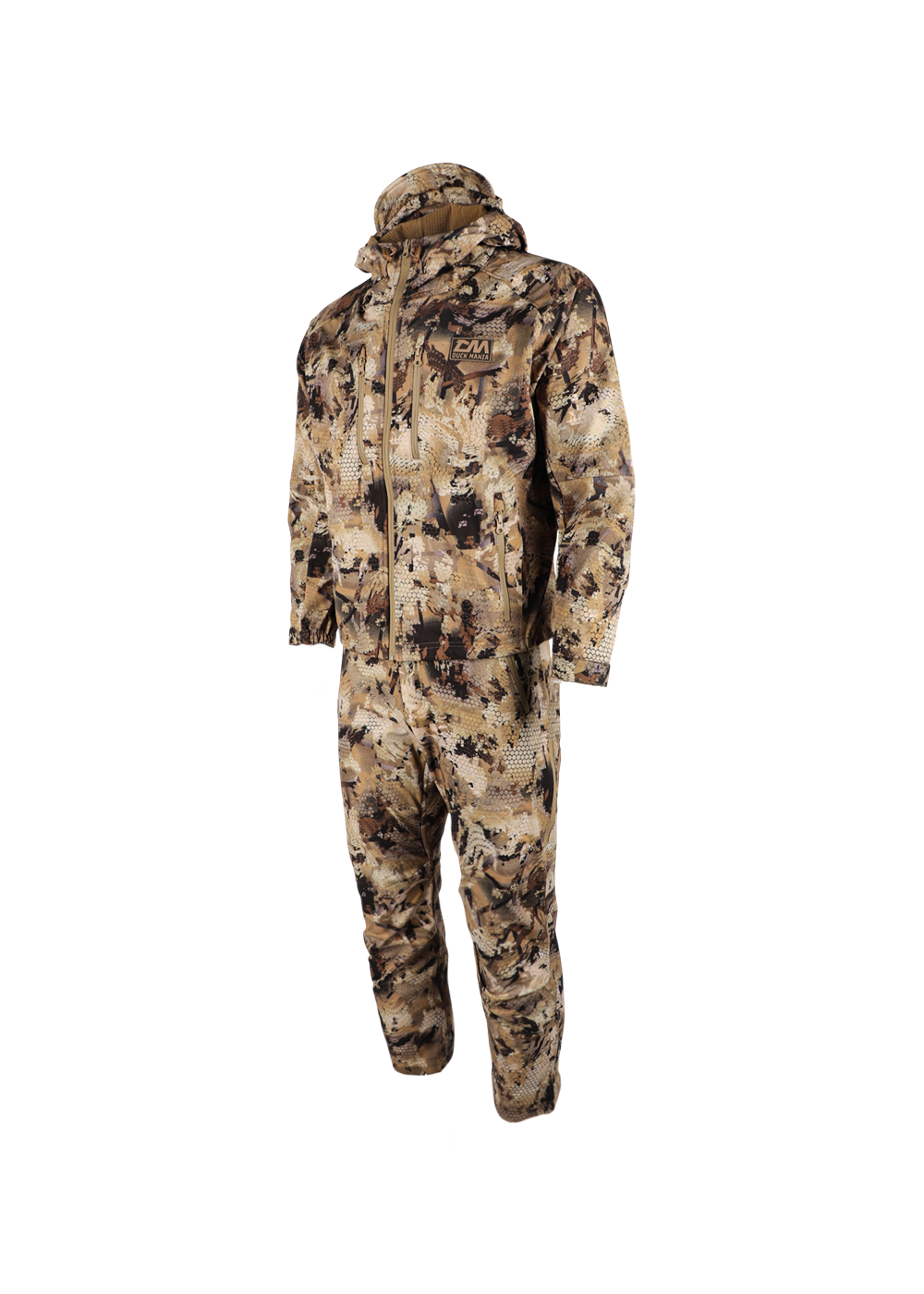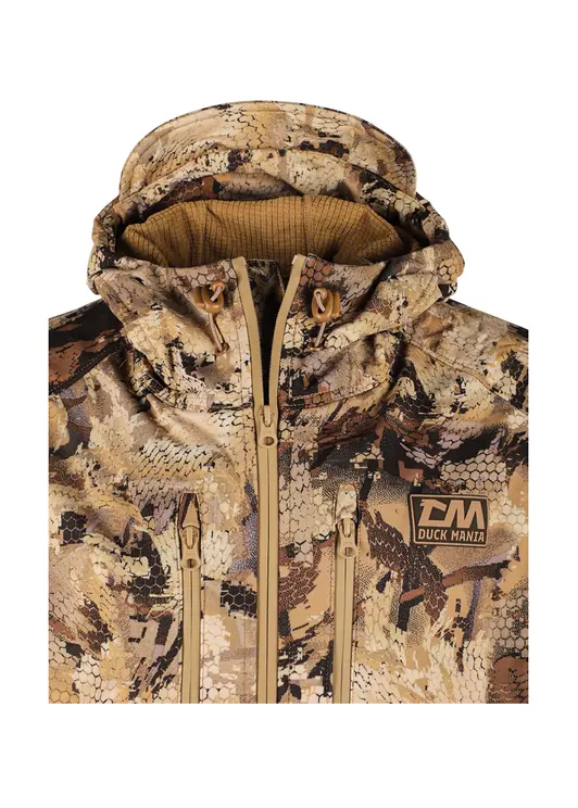 Костюм Duck Mania TIGER PRO C1005-COMB — профессиональная охотничья экипировка в камуфляжном исполнении, изготовленная из трёхслойной мембраны 3L плотностью 10000/10000 с усиленным внешним слоем HardTex и DWR-пропиткой. Комплект включает куртку с рукавами реглан, анатомическим капюшоном и четырьмя влагостойкими карманами, а также полукомбинезон с лямками и защитой поясницы. Внутренний флисовый слой waffle fleece эффективно отводит влагу при высокой активности и сохраняет тепло при низкой. Костюм обеспечивает защиту от ветра и лёгких осадков, температурный режим при активном использовании от -10°C до +10°C, при пассивном — от 0°C до +17°C. Влагостойкие молнии и специальные швы гарантируют надёжную защиту от влаги и долговечность.
