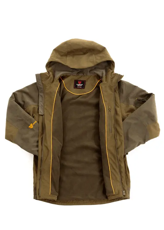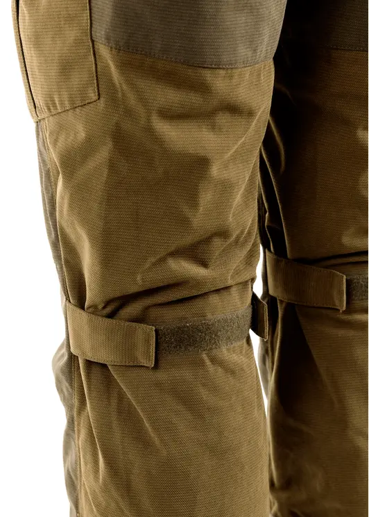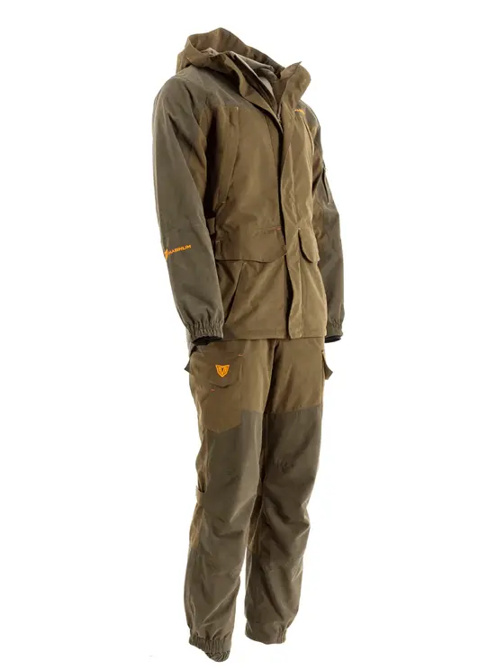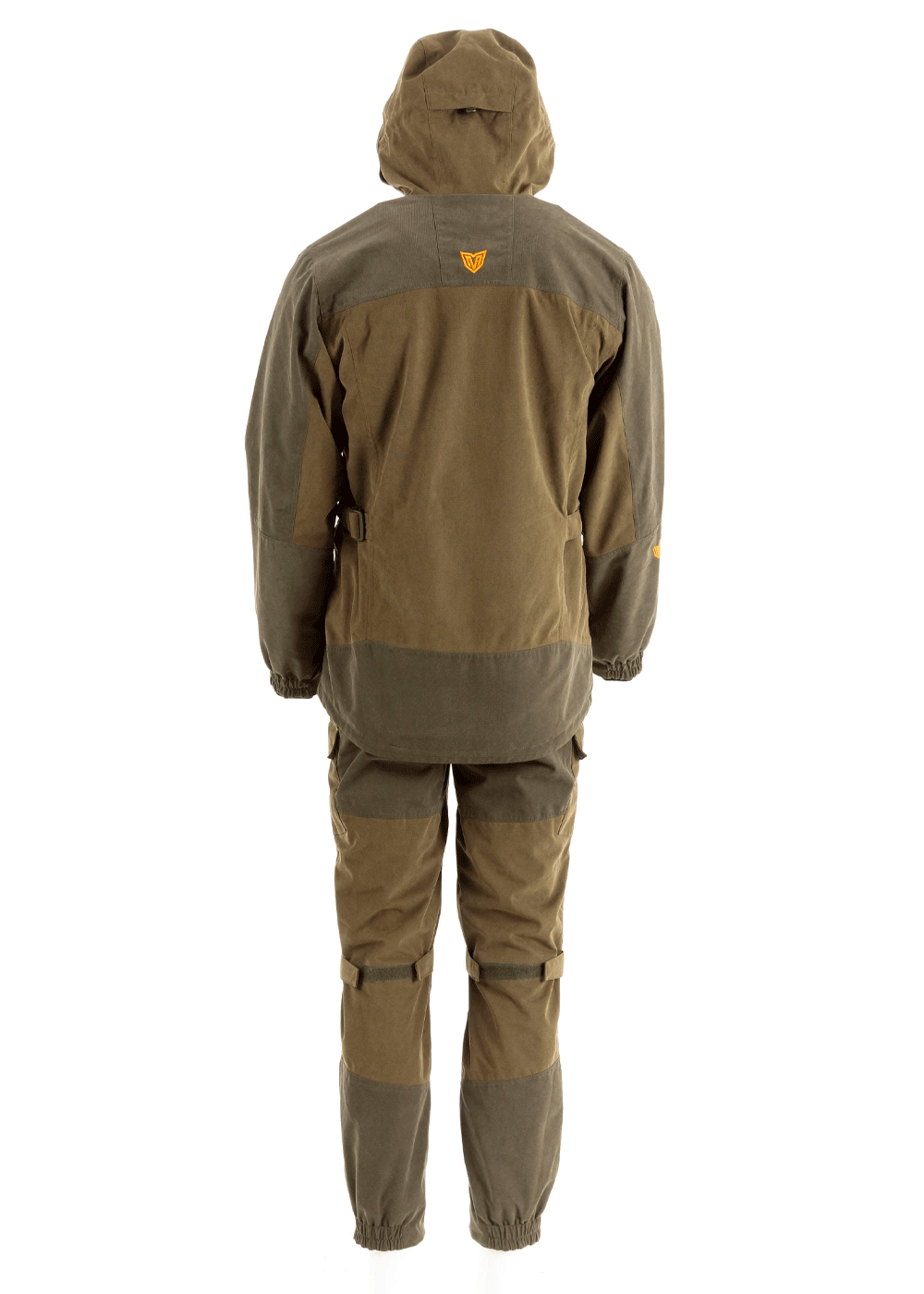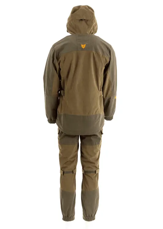Костюм изготовлен из высококачественного трёхслойного мембранного материала, который эффективно защищает от осадков и продувания, при этом отлично отводит влагу от тела. Хаки-камуфляж универсален и хорошо маскирует в различных природных условиях, от леса до открытой местности.