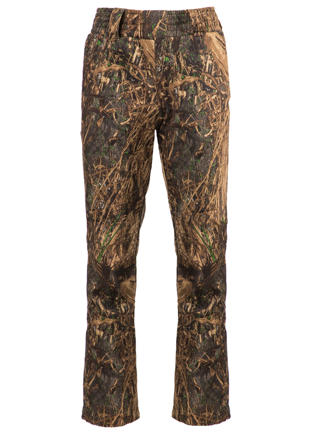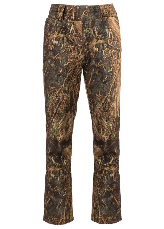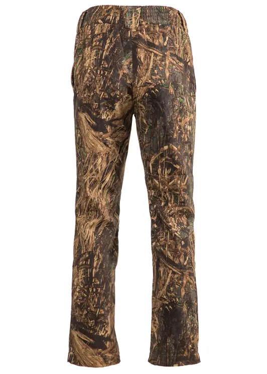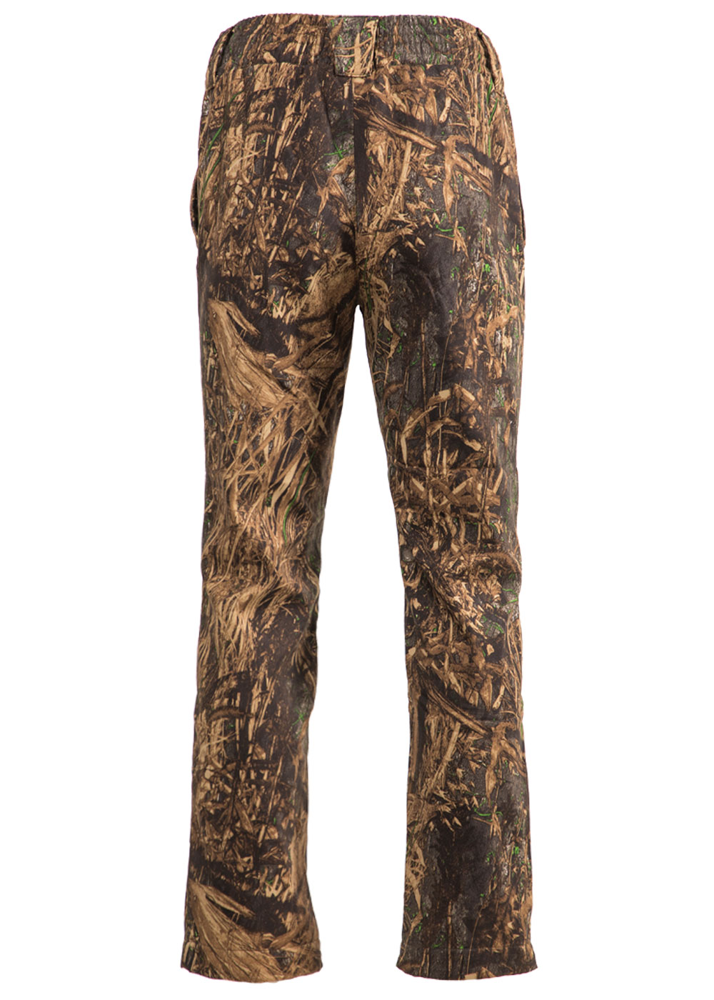 Брюки по низу регулируются утяжками. Пояс брюк на широкой простроченной резинке, дополнен шлевками. Два кармана у пояса без застежки.