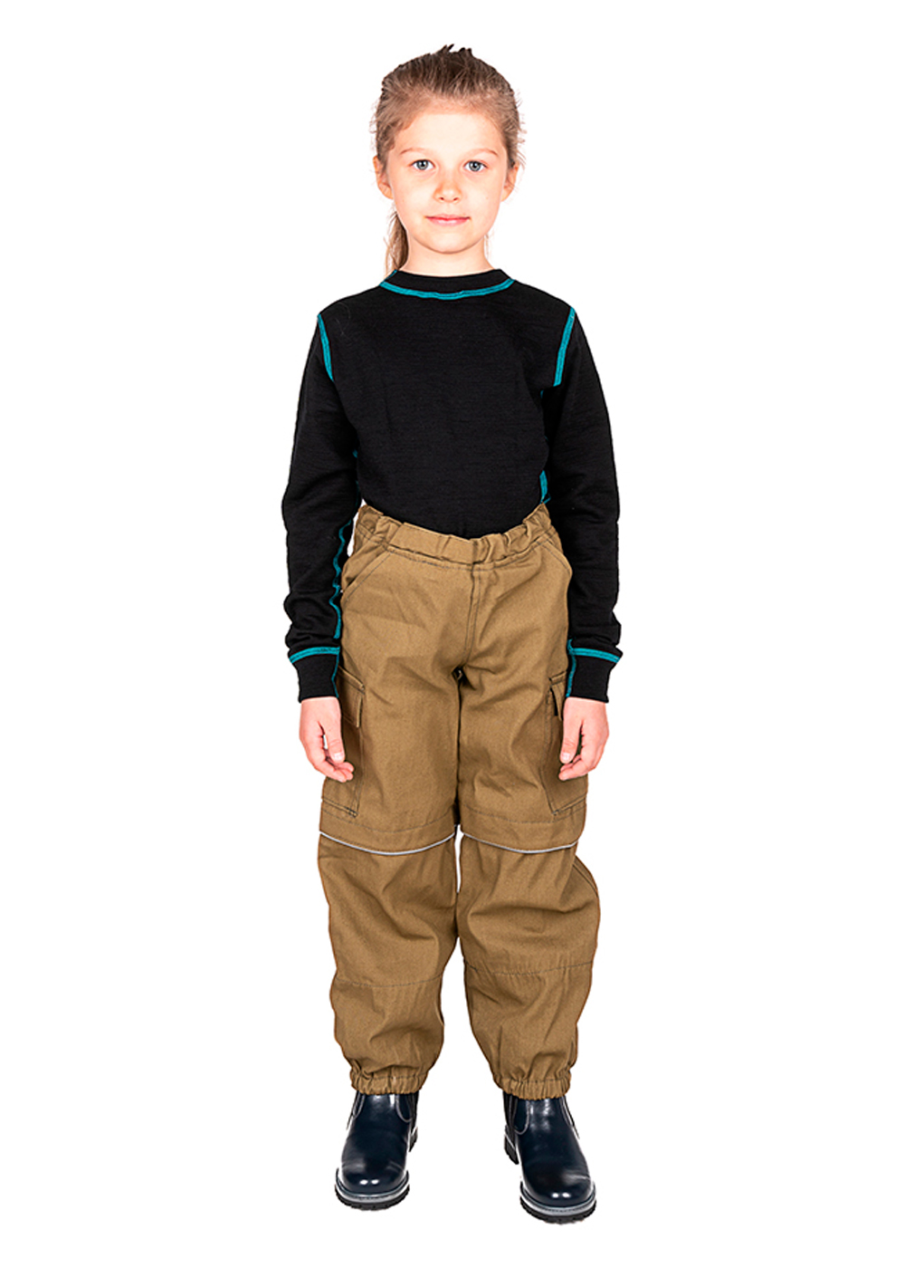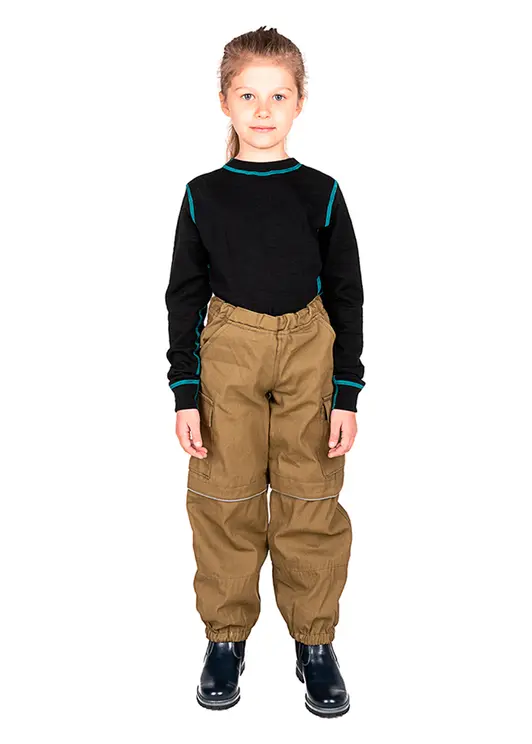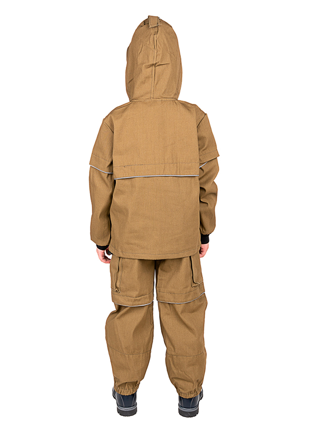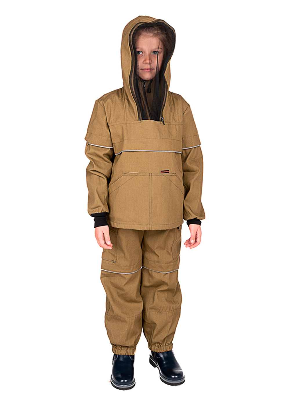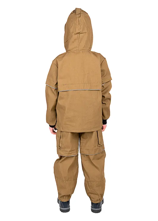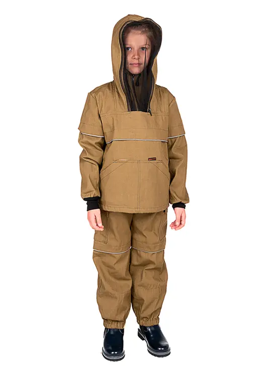 Костюм для детей геологов, охотников, рыболовов, грибников и дачников. Состоит из куртки с "юбкой" и брюк с "пыльниками" в штанинах. Куртка с капюшоном и противомоскитной сеткой, убираемой в потайной нагрудный карман. В костюме предусмотрены клапан "антиклещ" и светоотражающий кант.