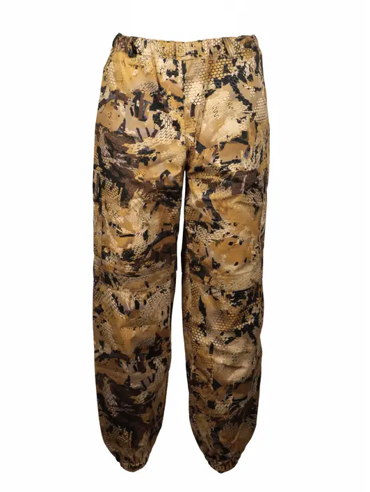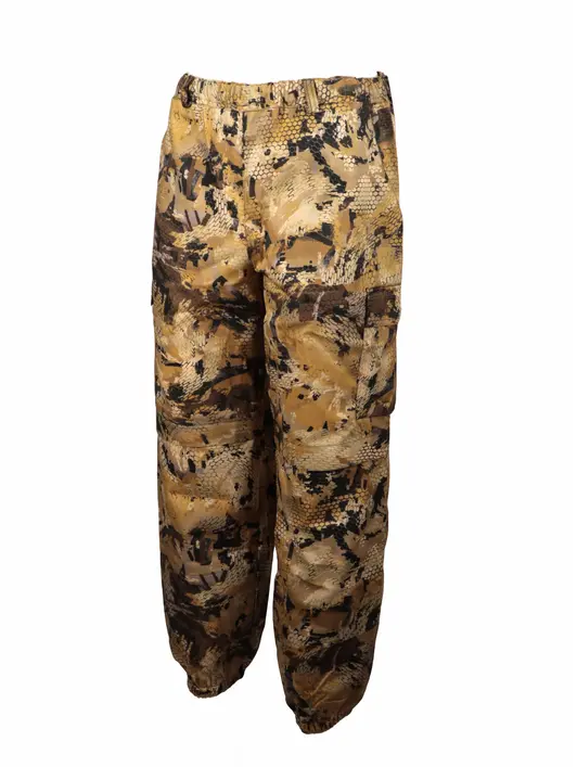 Брюки свободного кроя с поясом на резинке со шнуром и со шлёвками. Два верхних прорезных кармана, два боковых накладных кармана с клапаном. По низу брюк манжеты на резинке.