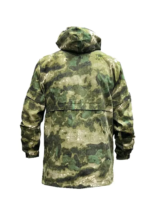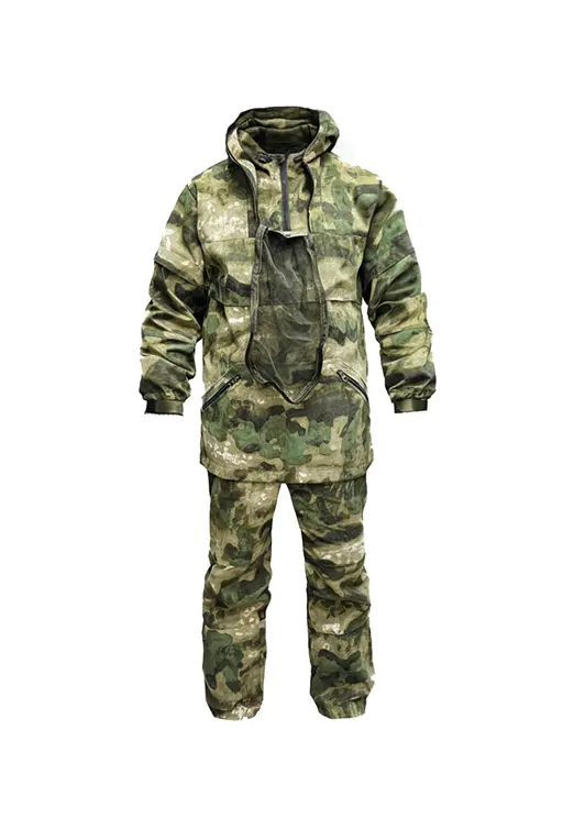 На куртке имеется капюшон вокруг которого пристегивается антимоскитная сетка, которая убирается в нагрудный карман, капюшон утягивается по овалу лица. Куртка анорак, прямая удлинённая с утяжками по низу с двумя врезными карманами на молнии, противоклещевые ловушки на шее, на рукавах и на теле. На рукавах имеется внутренний защитный противоклещевой клапан. Противоклещевая защитная юбка внутри куртки.