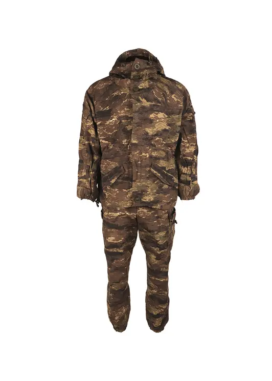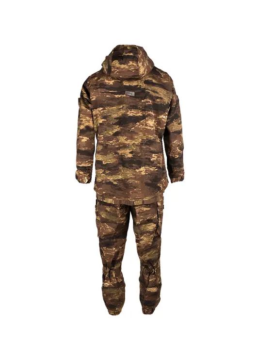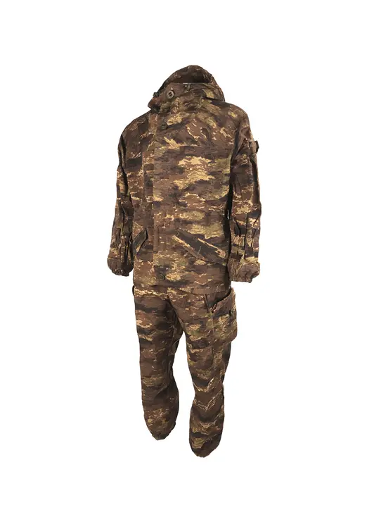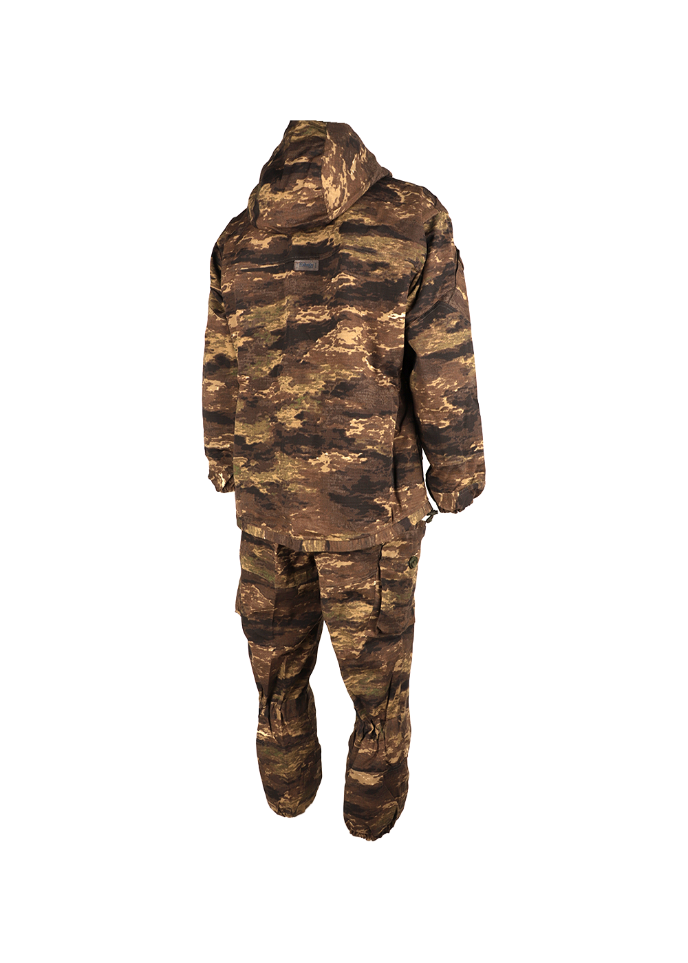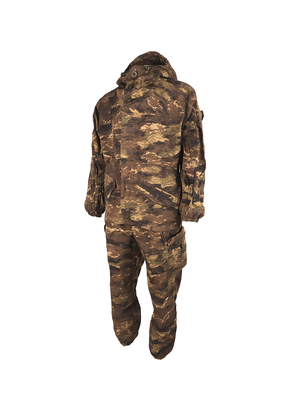 Главные особенности данной модели: крепление пуговиц усилено киперной лентой, капюшон с козырьком, манжеты рукавов и брюк на резинке, усиление на локтях, на коленях и на седалище, пояс на резинке со шлевками, пыльники с завязками, съёмные помочи на пуговицах. Костюм изготовлен из смесовой ткани с плетением рип стоп плотностью 220 г/м².