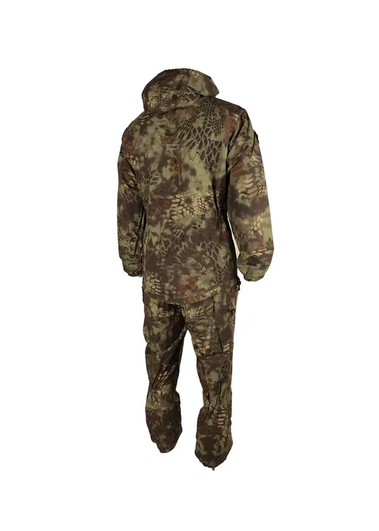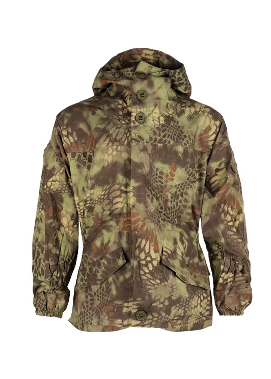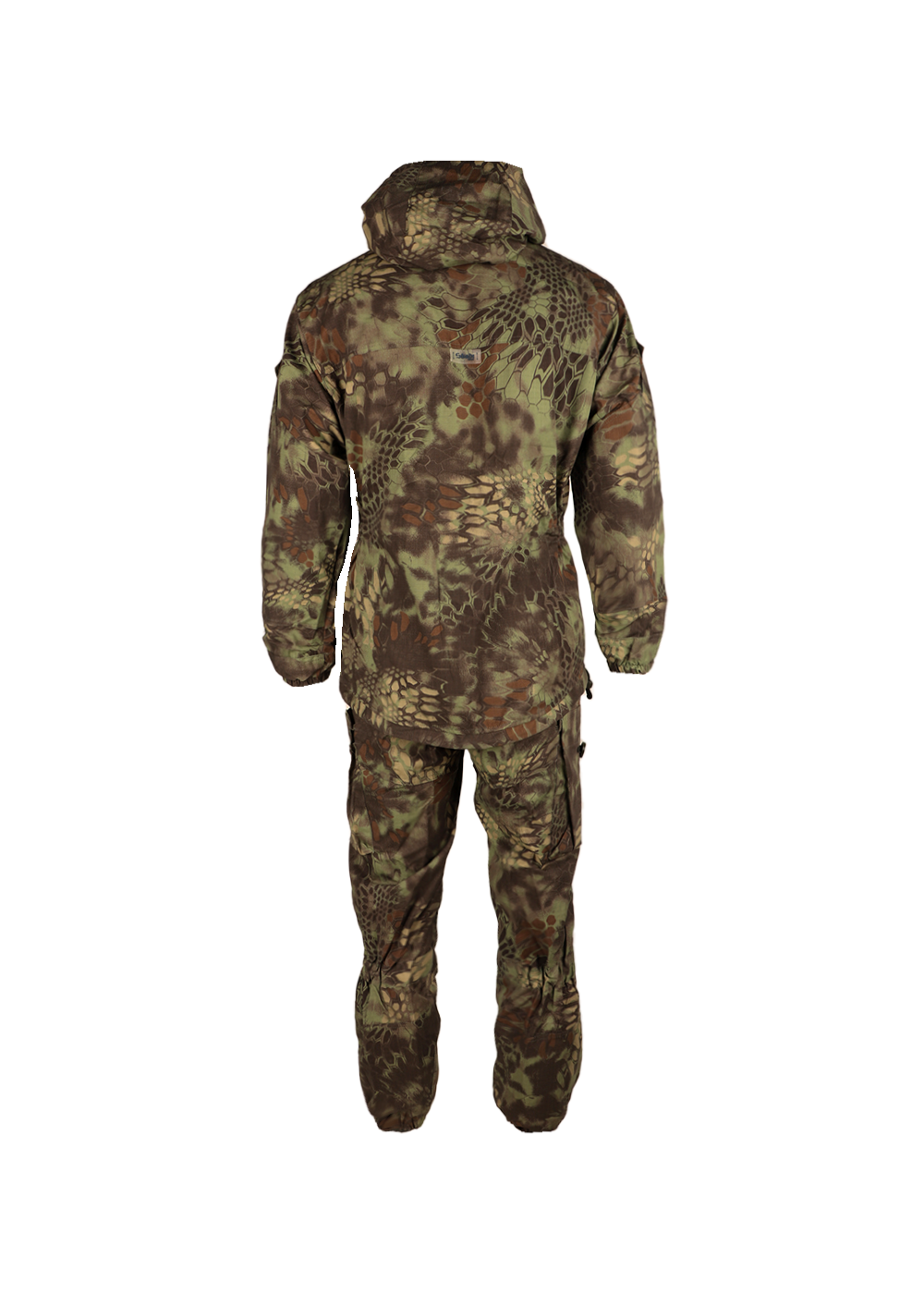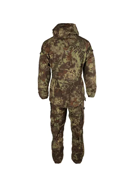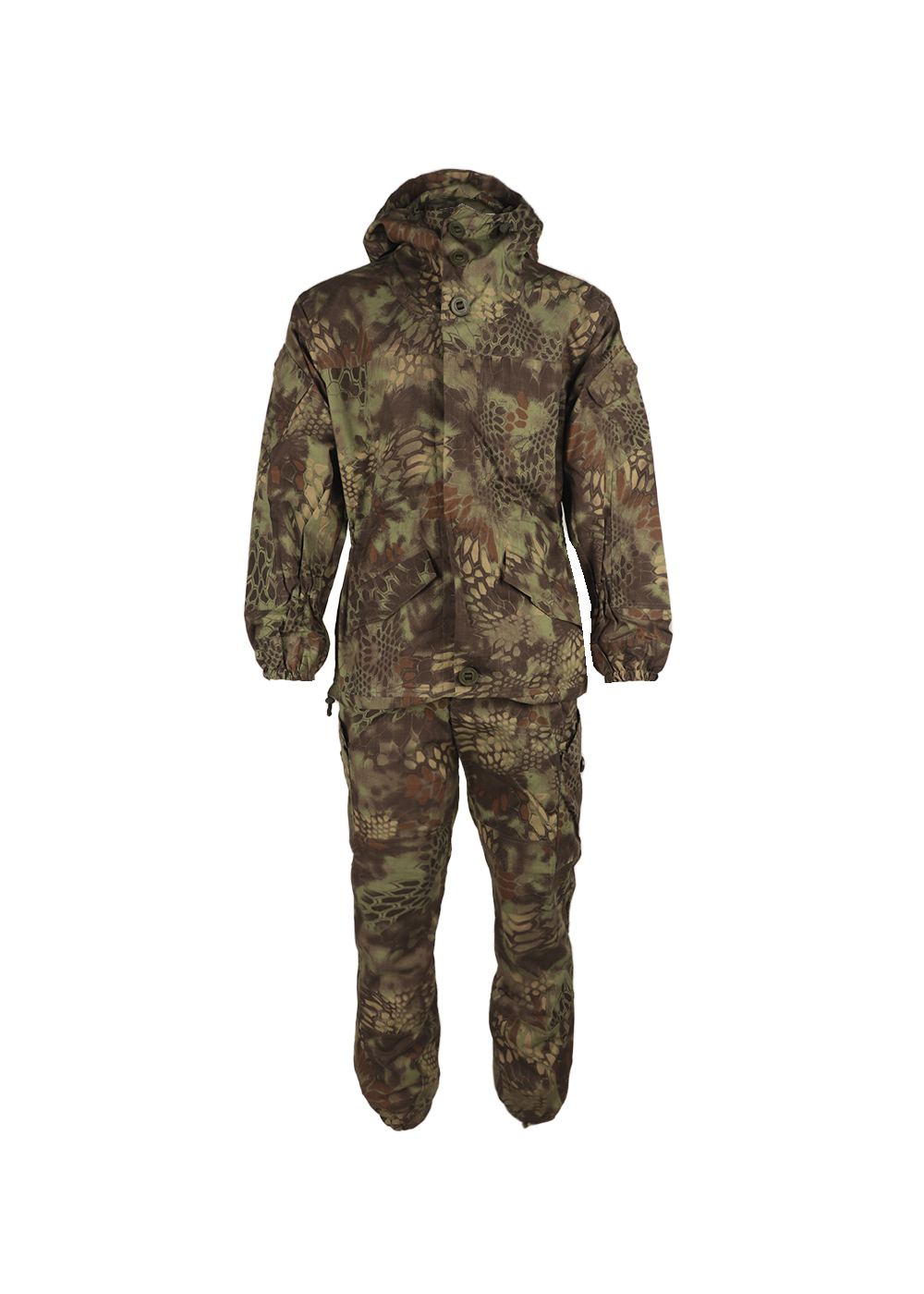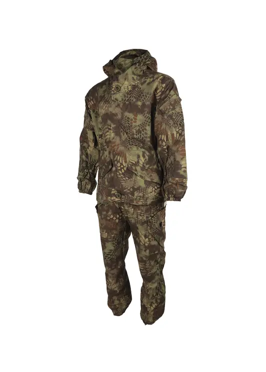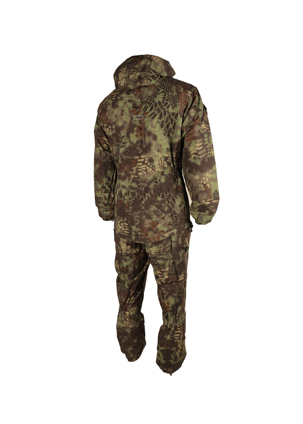 Демисезонный камуфлированный костюм для любителей охоты, рыбалки, туризма. Выполнен из устойчивого к истиранию и механическим повреждениям материала рип-стоп (хлопок 35%, полиэстер 65%), который препятствует влаге, не усаживается при стирке, быстро сохнет, не выгорает на солнце, не загорается при попадании искр. Флисовая подкладка костюма позволяет комфортно себя чувствовать при температуре до -5 градусов. Куртка с высоким горлом, застегивается по центру на потайные пуговицы. Капюшон-шлем плотно прилегает к голове, имеет кулиску вокруг головы и затяжку на затылке, что хорошо защищает от ветра. На плечах и внизу куртки накладные карманы с клапанами на пуговицах. Запястья собраны на резинку. Один внутренний левый карман на пуговице. Брюки прямого свободного кроя. Гульфик на молнии и пуговице, пояс высокий на резинке. По бокам брюк на бедрах накладные карманы с клапанами на пуговице. Задние половинки брюк посажены под коленом на резинку. Низ брючин также собран на резинку.