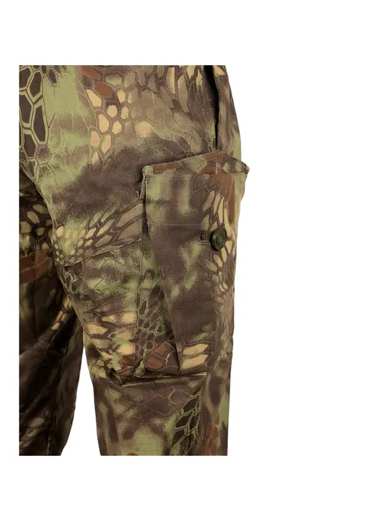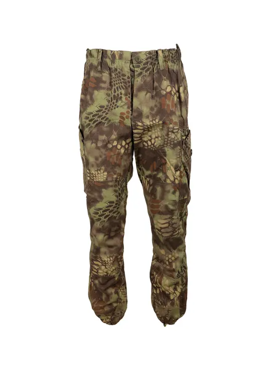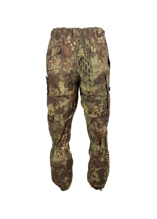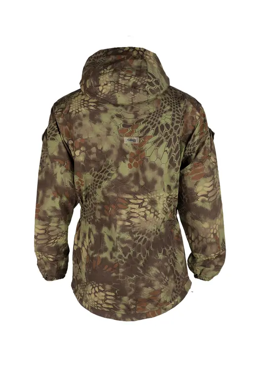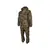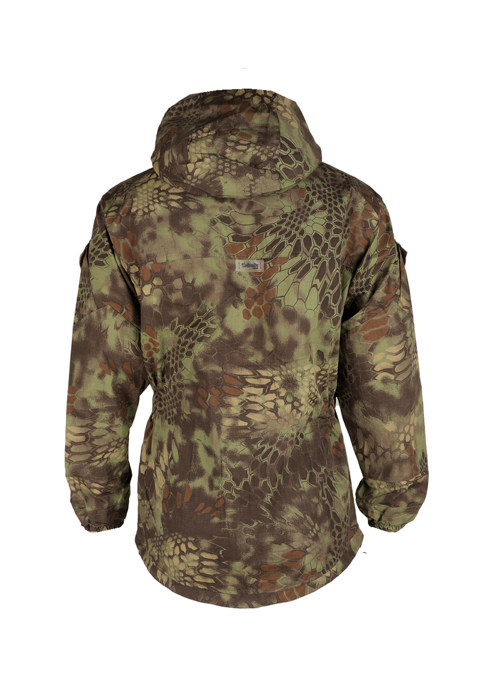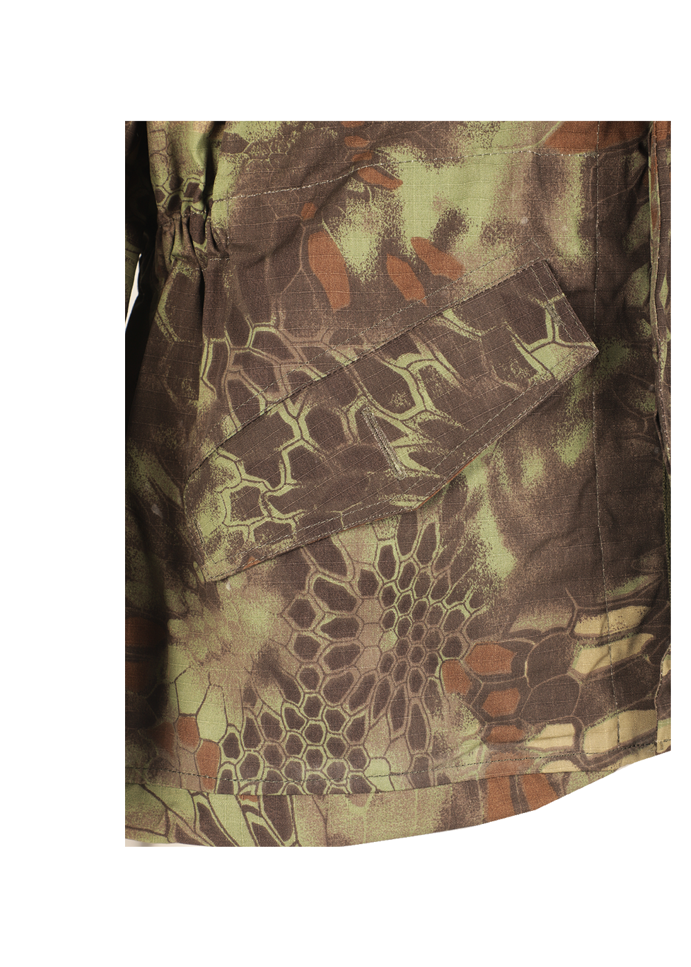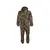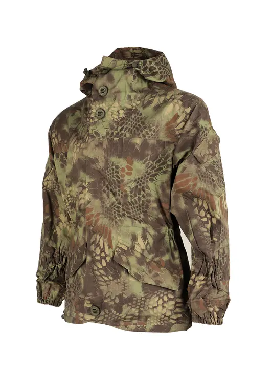 Демисезонный камуфлированный костюм для любителей охоты, рыбалки, туризма. Выполнен из устойчивого к истиранию и механическим повреждениям материала рип-стоп (хлопок 35%, полиэстер 65%), который препятствует влаге, не усаживается при стирке, быстро сохнет, не выгорает на солнце, не загорается при попадании искр. Флисовая подкладка костюма позволяет комфортно себя чувствовать при температуре до -5 градусов. Куртка с высоким горлом, застегивается по центру на потайные пуговицы. Капюшон-шлем плотно прилегает к голове, имеет кулиску вокруг головы и затяжку на затылке, что хорошо защищает от ветра. На плечах и внизу куртки накладные карманы с клапанами на пуговицах. Запястья собраны на резинку. Один внутренний левый карман на пуговице. Брюки прямого свободного кроя. Гульфик на молнии и пуговице, пояс высокий на резинке. По бокам брюк на бедрах накладные карманы с клапанами на пуговице. Задние половинки брюк посажены под коленом на резинку. Низ брючин также собран на резинку.