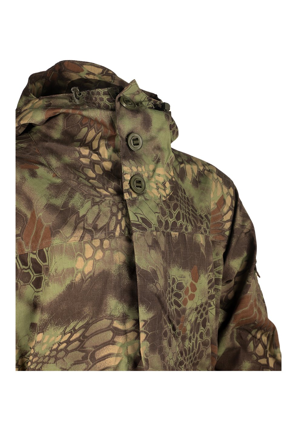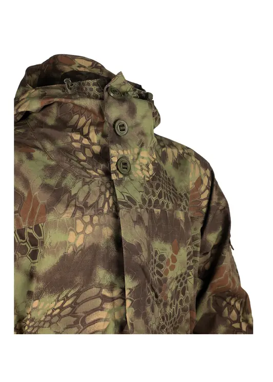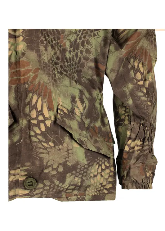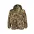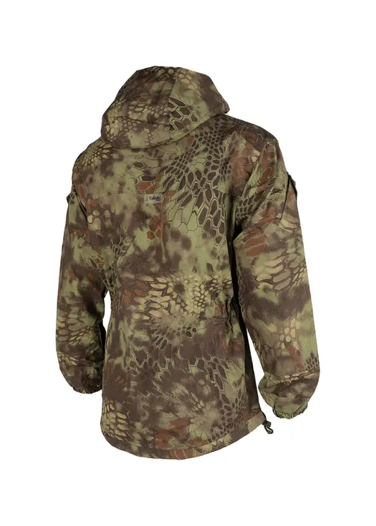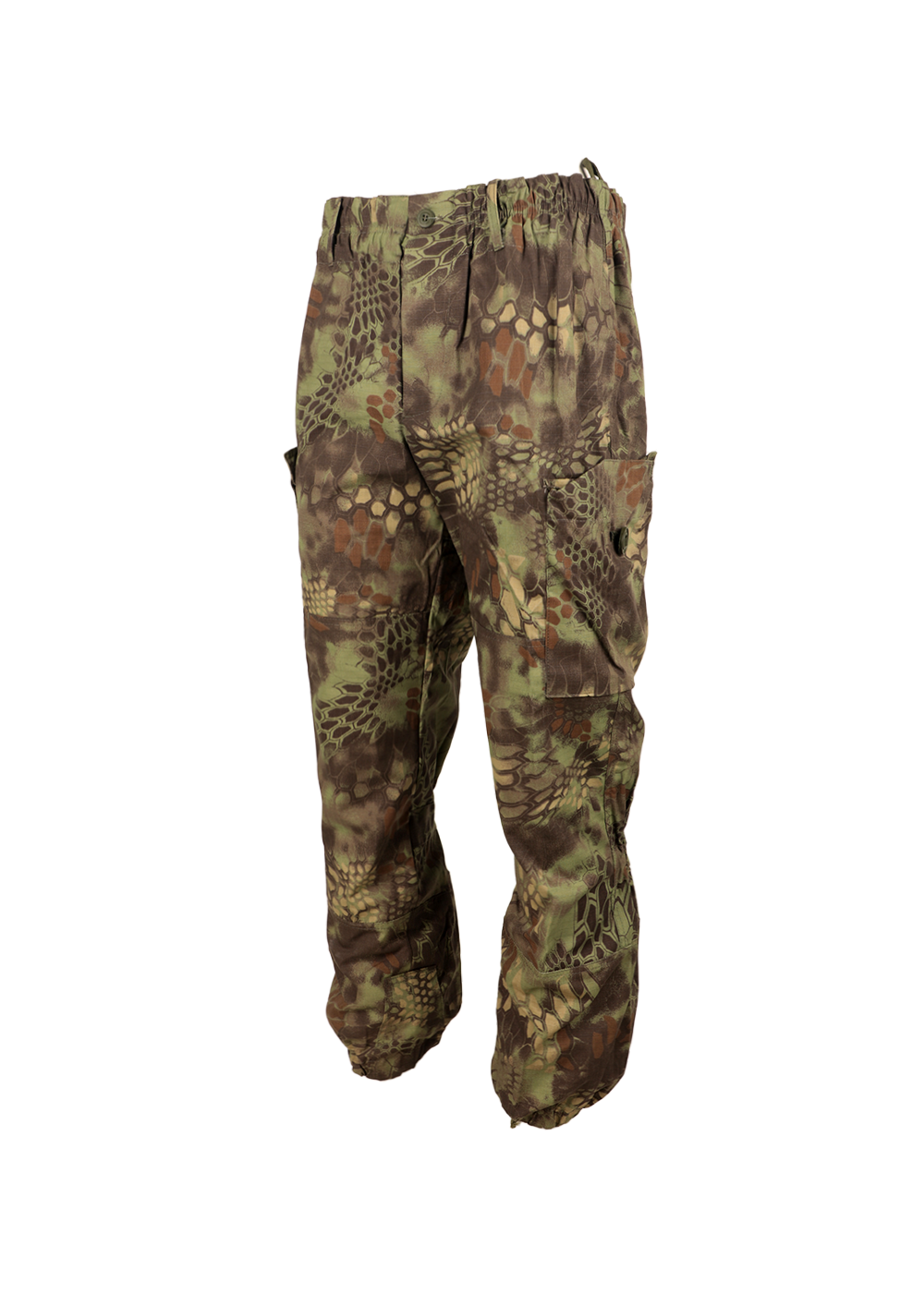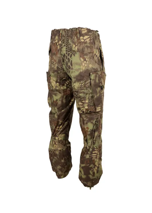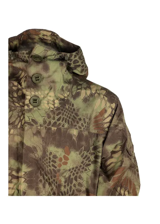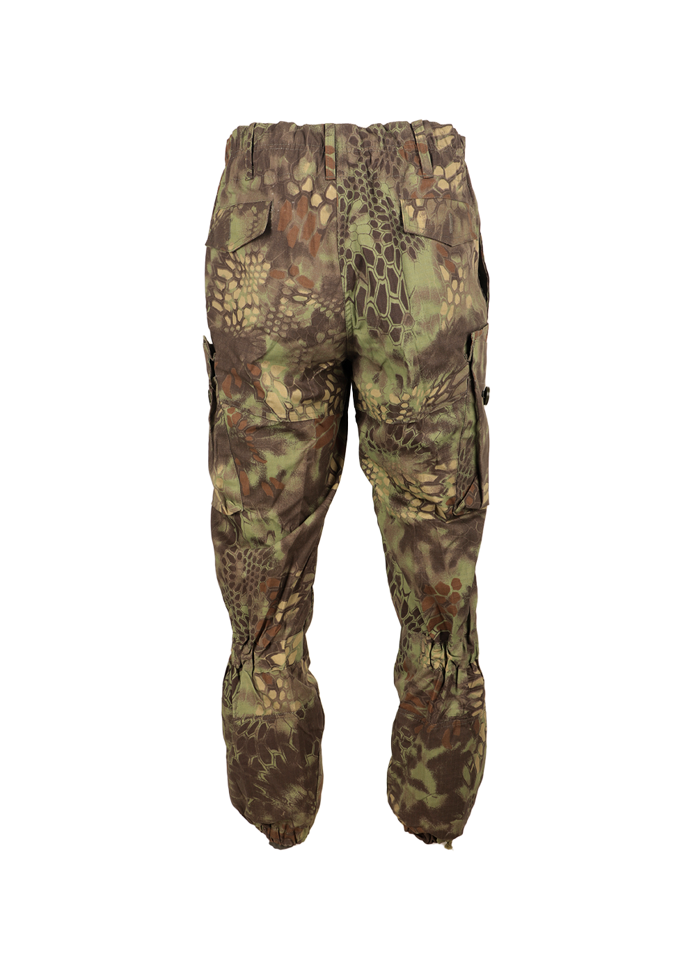 Демисезонный камуфлированный костюм для любителей охоты, рыбалки, туризма. Выполнен из устойчивого к истиранию и механическим повреждениям материала рип-стоп (хлопок 35%, полиэстер 65%), который препятствует влаге, не усаживается при стирке, быстро сохнет, не выгорает на солнце, не загорается при попадании искр. Флисовая подкладка костюма позволяет комфортно себя чувствовать при температуре до -5 градусов. Куртка с высоким горлом, застегивается по центру на потайные пуговицы. Капюшон-шлем плотно прилегает к голове, имеет кулиску вокруг головы и затяжку на затылке, что хорошо защищает от ветра. На плечах и внизу куртки накладные карманы с клапанами на пуговицах. Запястья собраны на резинку. Один внутренний левый карман на пуговице. Брюки прямого свободного кроя. Гульфик на молнии и пуговице, пояс высокий на резинке. По бокам брюк на бедрах накладные карманы с клапанами на пуговице. Задние половинки брюк посажены под коленом на резинку. Низ брючин также собран на резинку.