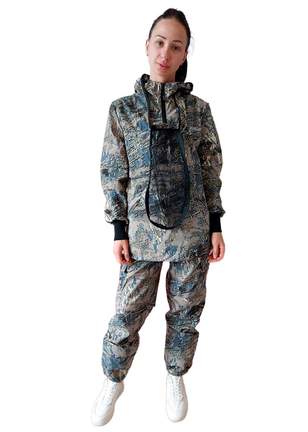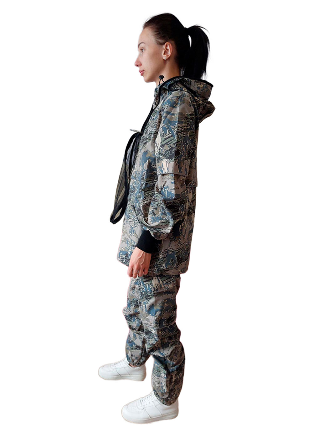 Летний женский костюм Антигнус Люкс с ловушками для клещей состоит из куртки и штанов. Приточный капюшон регулируется под размер головы при помощи шнурков-стяжек и липучки. Капюшон оснащён противомоскитной сеткой, которая крепится на молнию. При желании её можно снять и убрать в потайной нагрудный потайной карман.