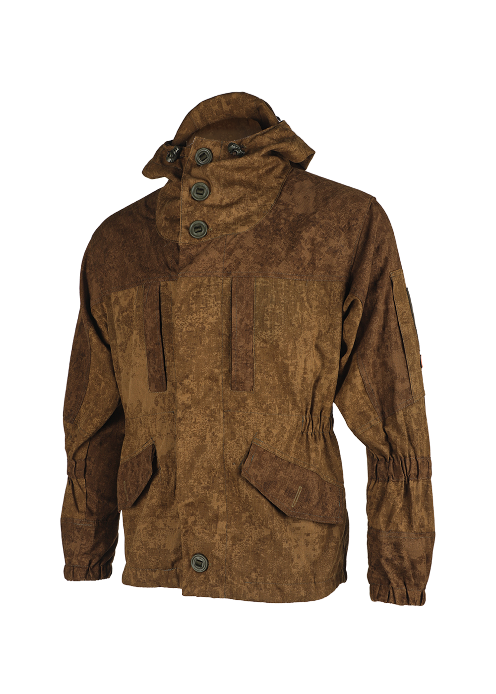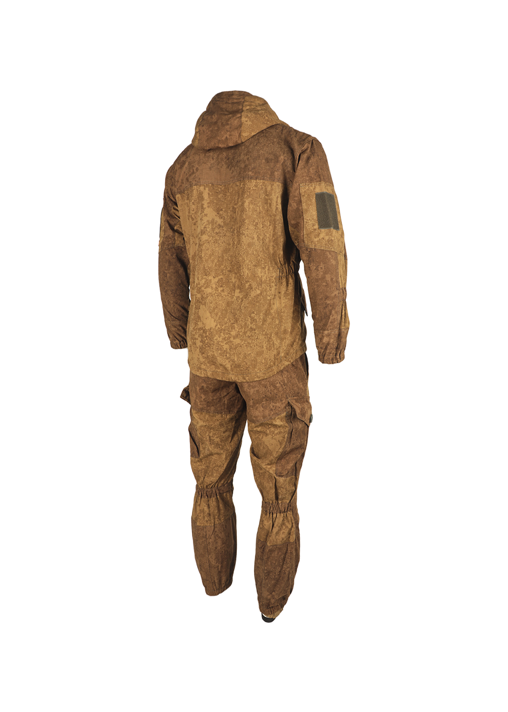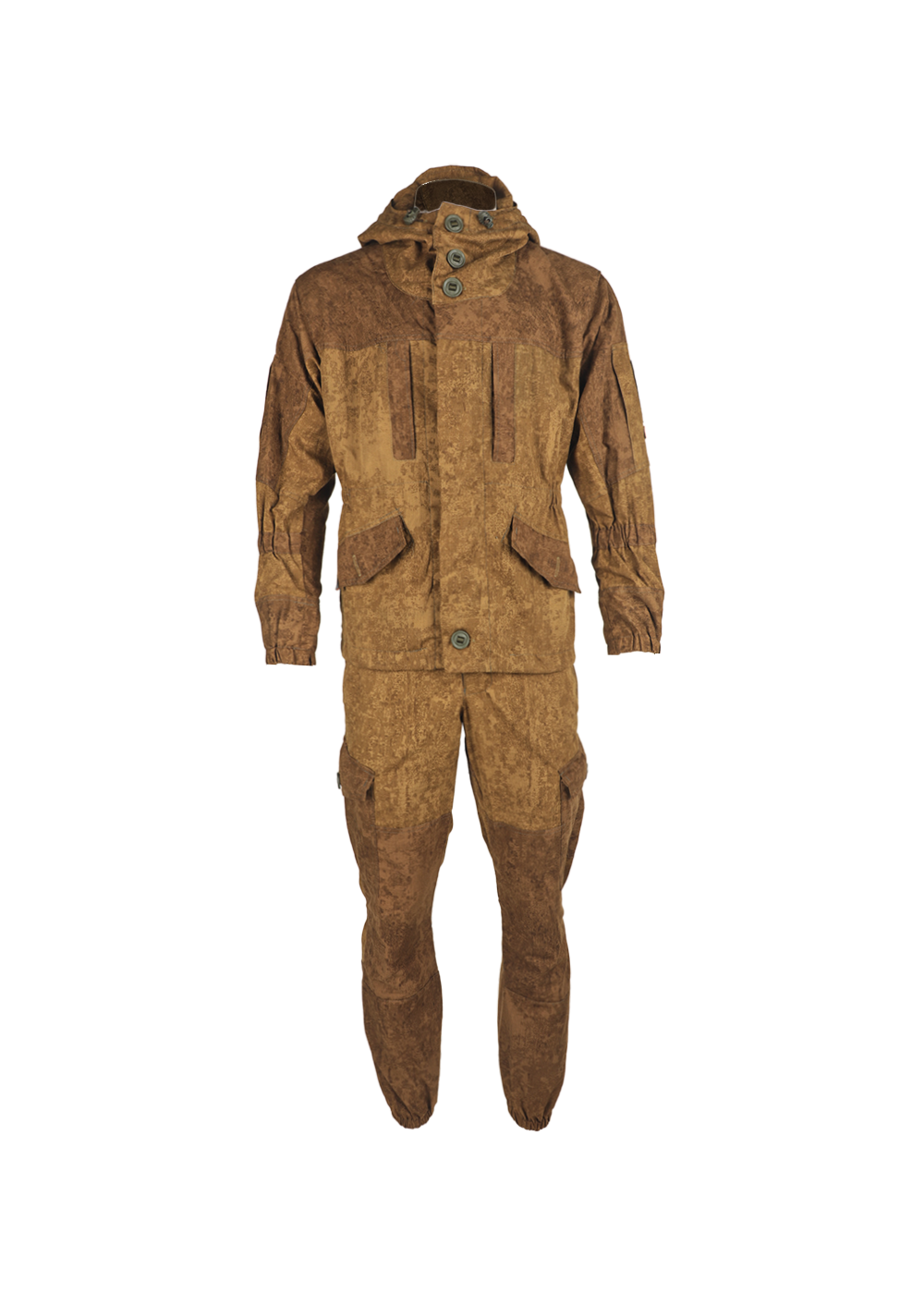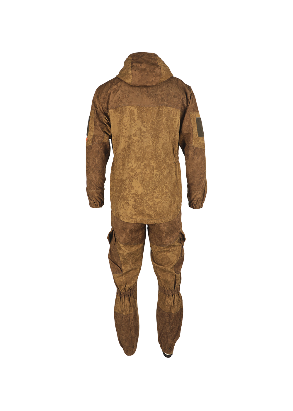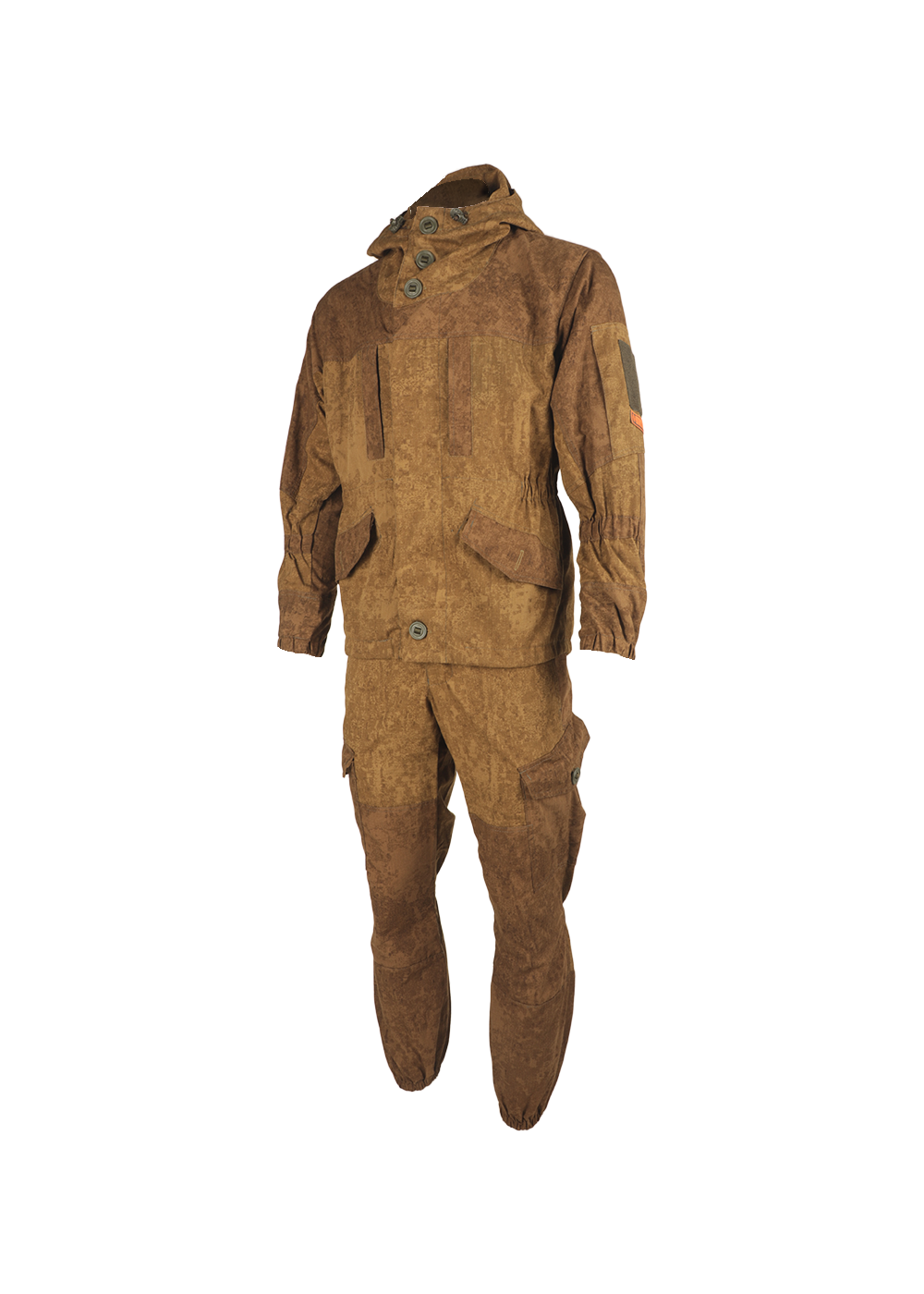 Костюм летний «Горка-V2» коричневого цвета с пиксельным рисунком состоит из куртки и брюк. Куртка оснащена регулируемым капюшоном с козырьком, двумя вертикальными карманами на груди, двумя карманами с клапанами на пуговицах на каждом рукаве и широкими липучками в области плеча для крепления шевронов. Манжеты рукавов стягиваются резинкой, а сама куртка утягивается по низу. Усиление предусмотрено на плечах, локтях и по низу рукава.Брюки имеют широкий пояс на резинке со шлёвками под ремень, гульфик с застёжкой на молнию, два прорезных кармана сбоку, два боковых накладных полуобъёмных кармана с клапаном на пуговице и один прорезной карман сзади на пуговице. Брюки также стягиваются резинкой внизу и имеют усиление в седалищной части и в области колена.