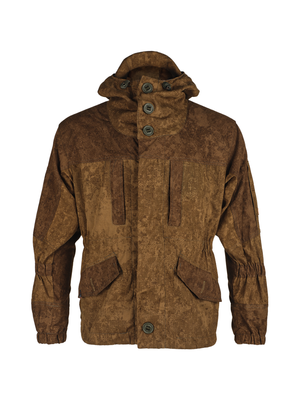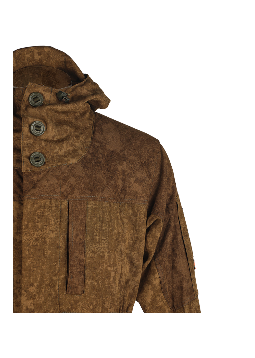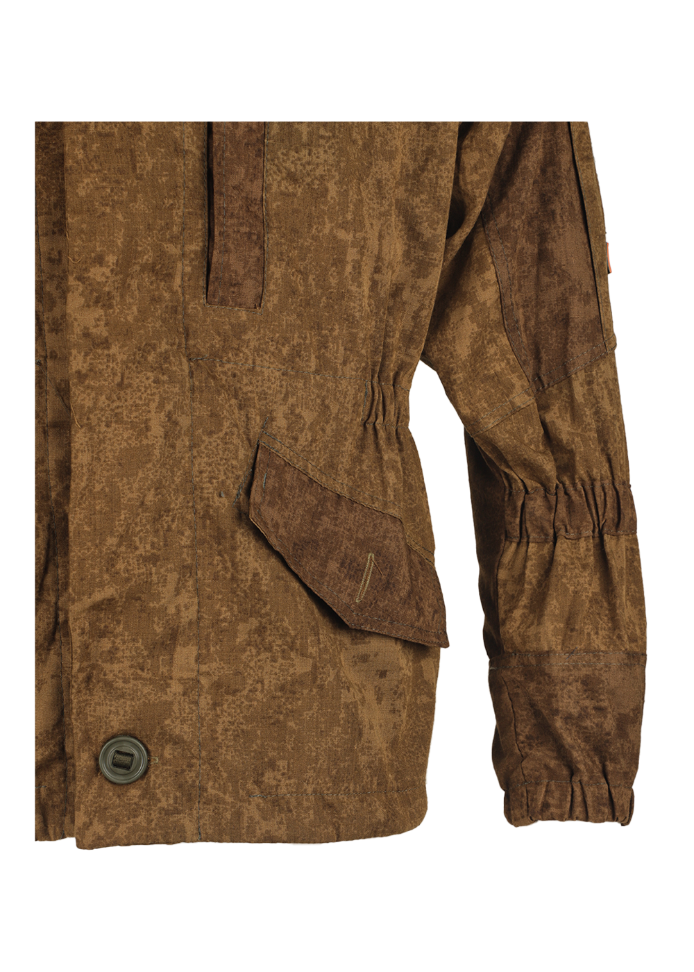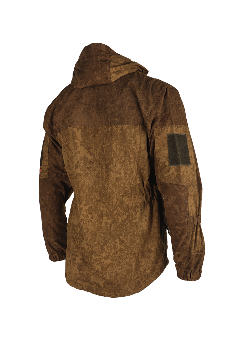 Костюм летний «Горка-V2» коричневого цвета с пиксельным рисунком состоит из куртки и брюк. Куртка оснащена регулируемым капюшоном с козырьком, двумя вертикальными карманами на груди, двумя карманами с клапанами на пуговицах на каждом рукаве и широкими липучками в области плеча для крепления шевронов. Манжеты рукавов стягиваются резинкой, а сама куртка утягивается по низу. Усиление предусмотрено на плечах, локтях и по низу рукава.Брюки имеют широкий пояс на резинке со шлёвками под ремень, гульфик с застёжкой на молнию, два прорезных кармана сбоку, два боковых накладных полуобъёмных кармана с клапаном на пуговице и один прорезной карман сзади на пуговице. Брюки также стягиваются резинкой внизу и имеют усиление в седалищной части и в области колена.