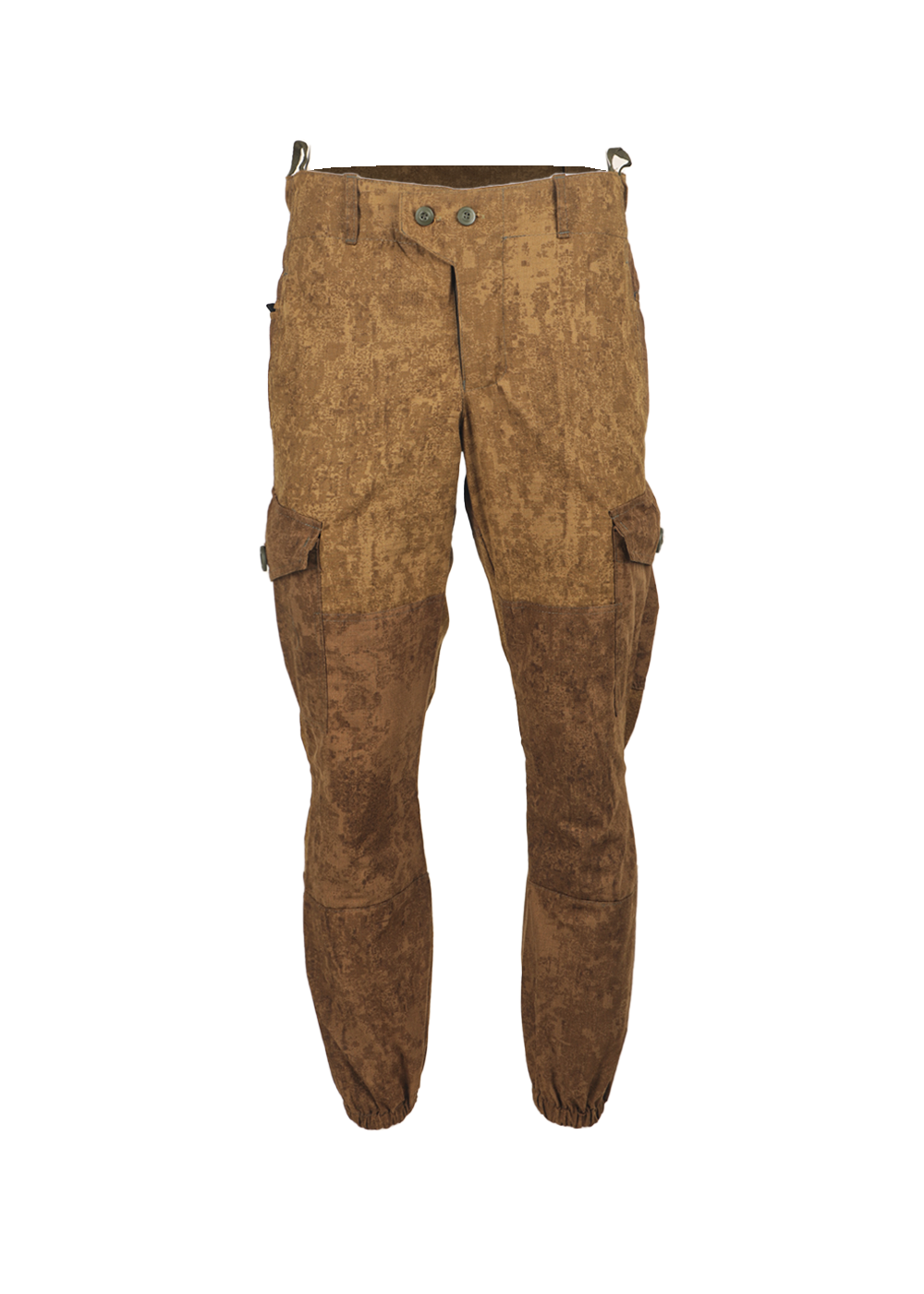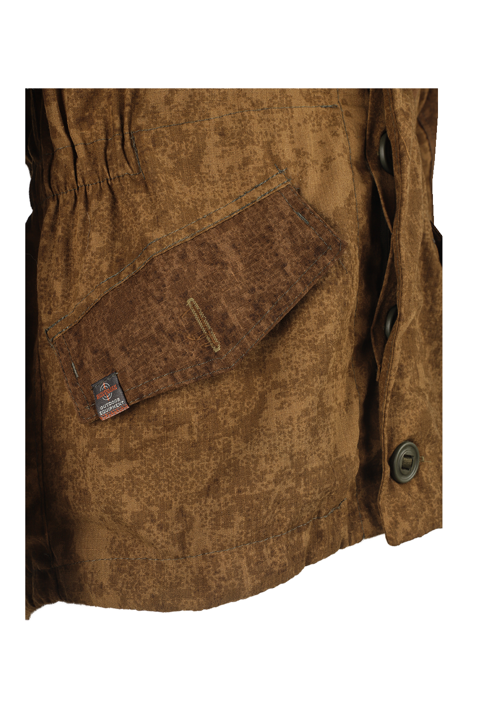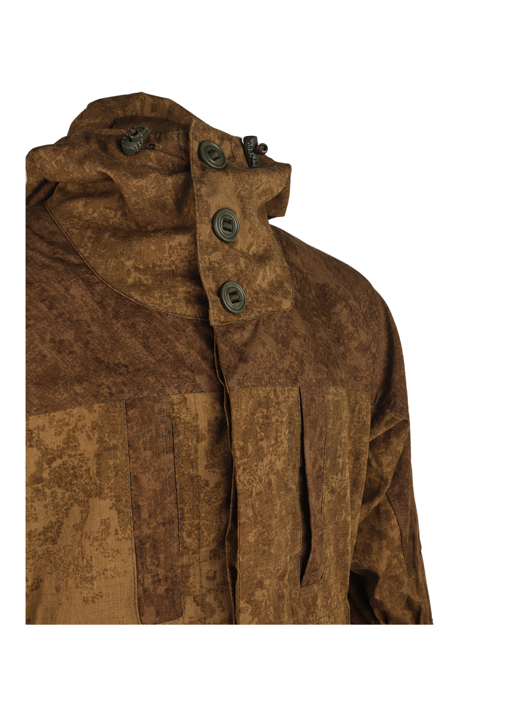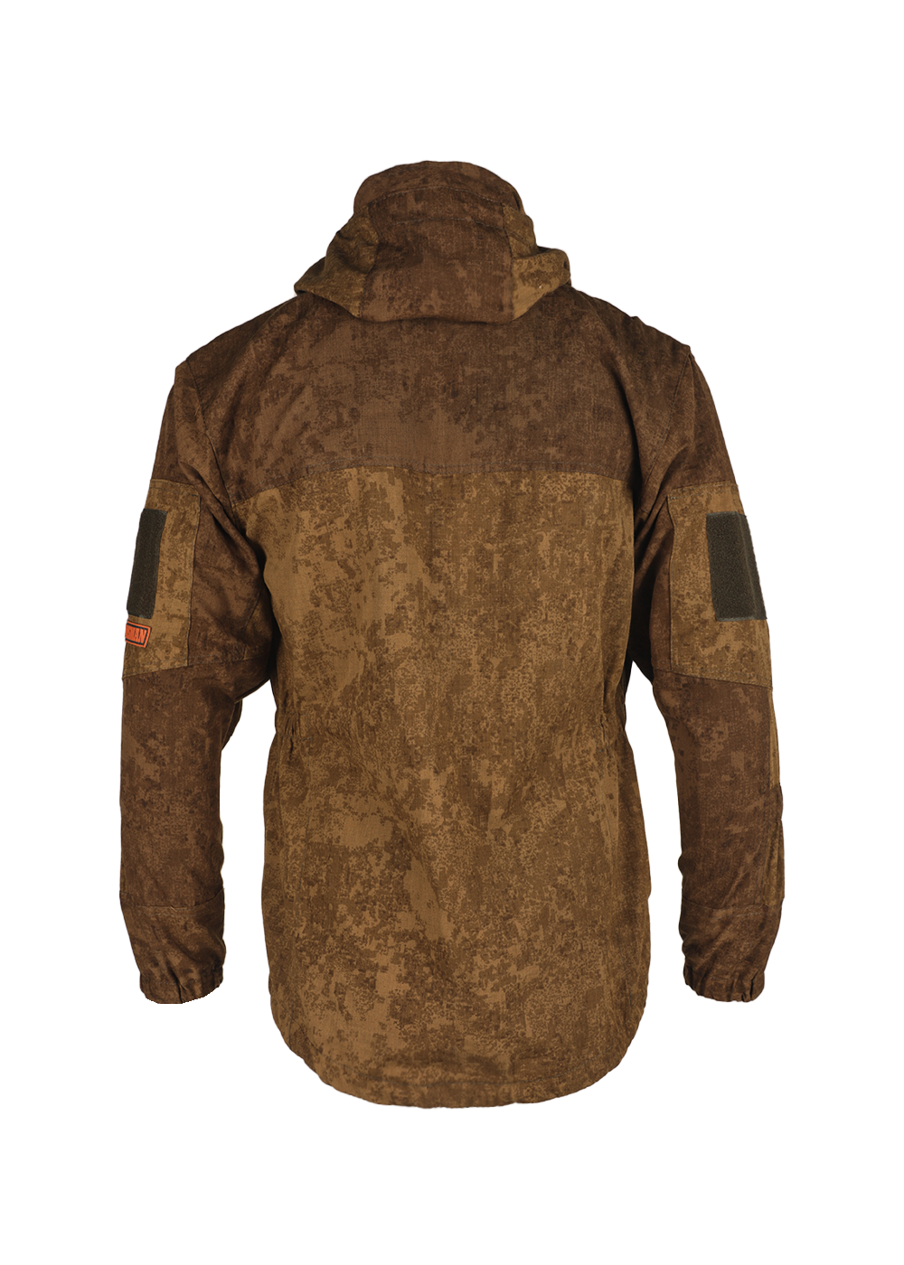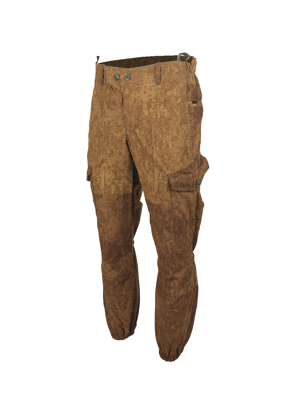 Костюм летний «Горка-V2» коричневого цвета с пиксельным рисунком состоит из куртки и брюк. Куртка оснащена регулируемым капюшоном с козырьком, двумя вертикальными карманами на груди, двумя карманами с клапанами на пуговицах на каждом рукаве и широкими липучками в области плеча для крепления шевронов. Манжеты рукавов стягиваются резинкой, а сама куртка утягивается по низу. Усиление предусмотрено на плечах, локтях и по низу рукава.Брюки имеют широкий пояс на резинке со шлёвками под ремень, гульфик с застёжкой на молнию, два прорезных кармана сбоку, два боковых накладных полуобъёмных кармана с клапаном на пуговице и один прорезной карман сзади на пуговице. Брюки также стягиваются резинкой внизу и имеют усиление в седалищной части и в области колена.