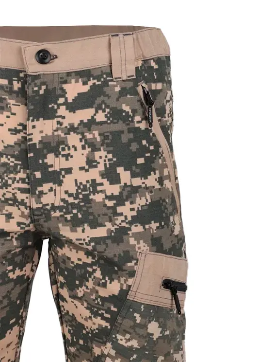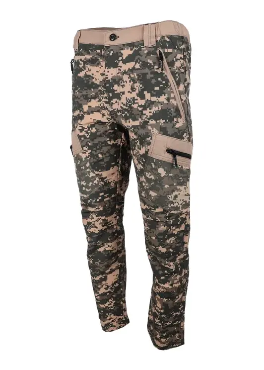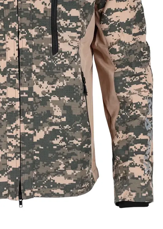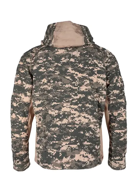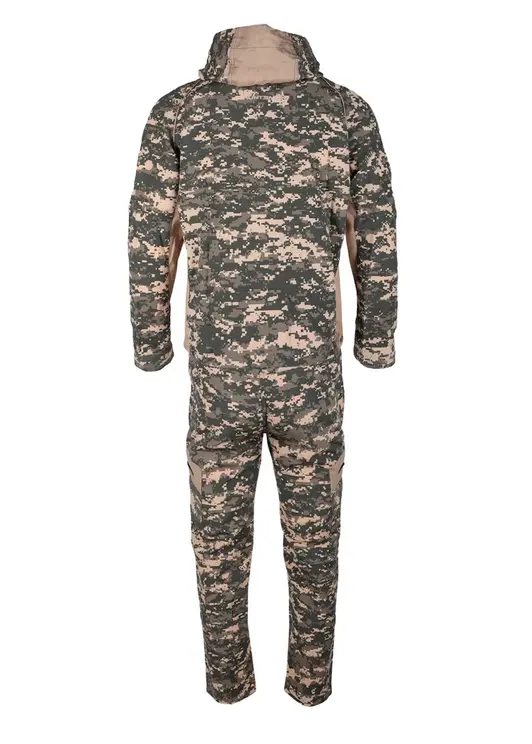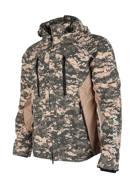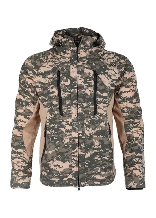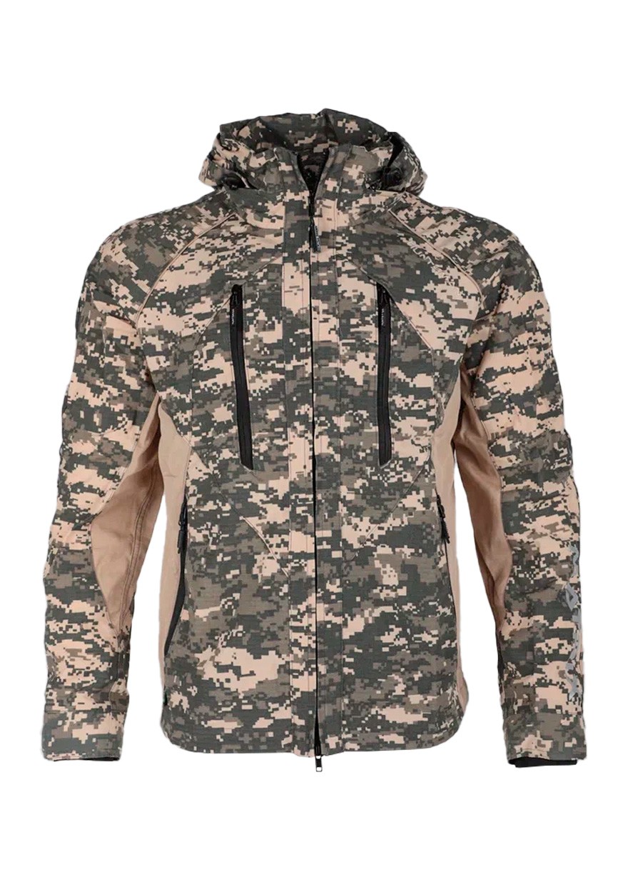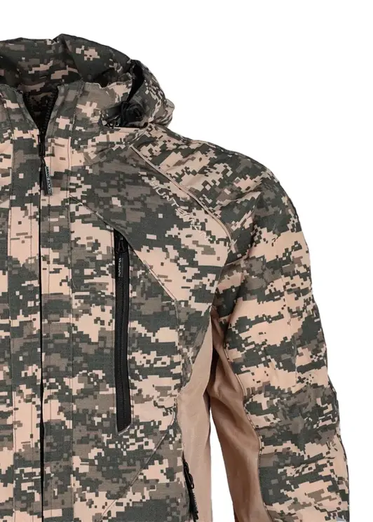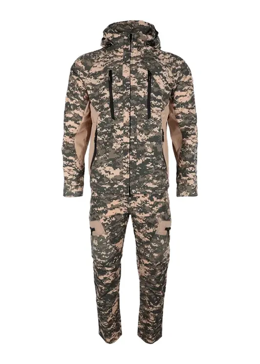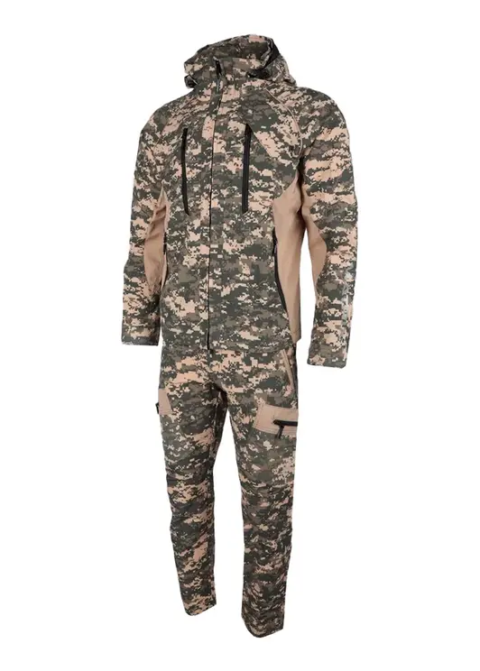 Куртка прямого силуэта, с центральной застежкой на двухзамковую молнию. Капюшон убирается в карман на молнии на воротнике-стойке. 4 прорезных кармана на молнии. Ширина капюшона по лицевому краю и ширина по низу регулируется с помощью резинки и фиксаторов. Рукав-реглан с внутренней эластичной манжетой. Брюки на резинке по бокам и шлевками под ремень, с карманами на молнии: 2 боковых и 2 на бедрах.