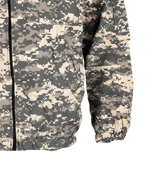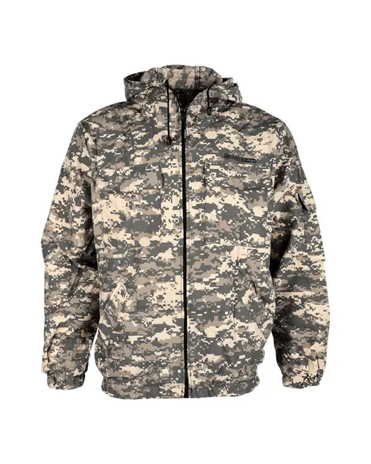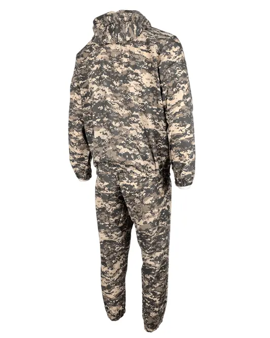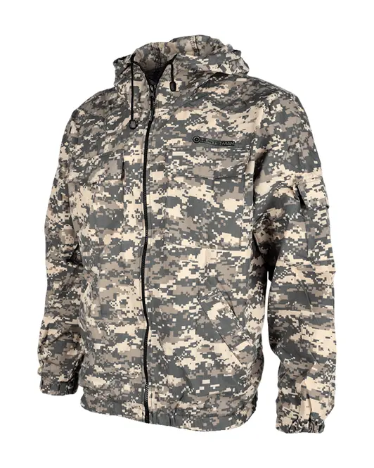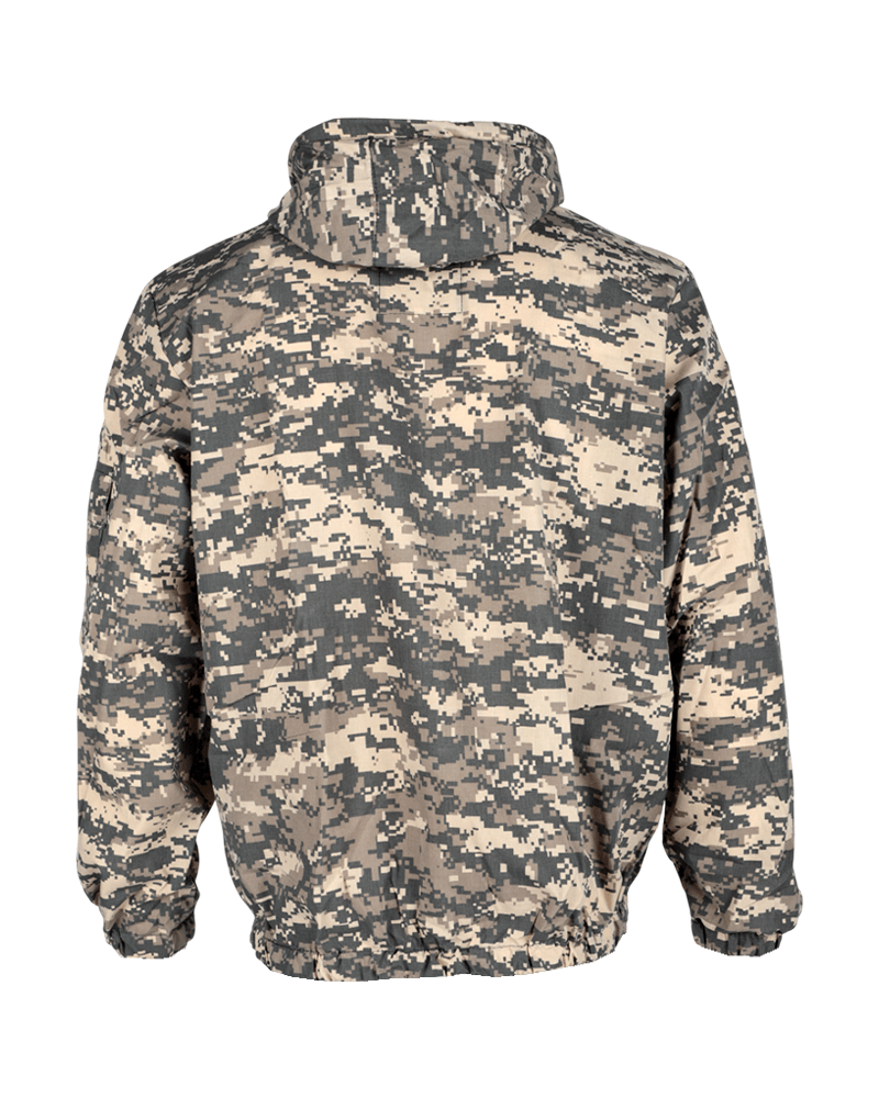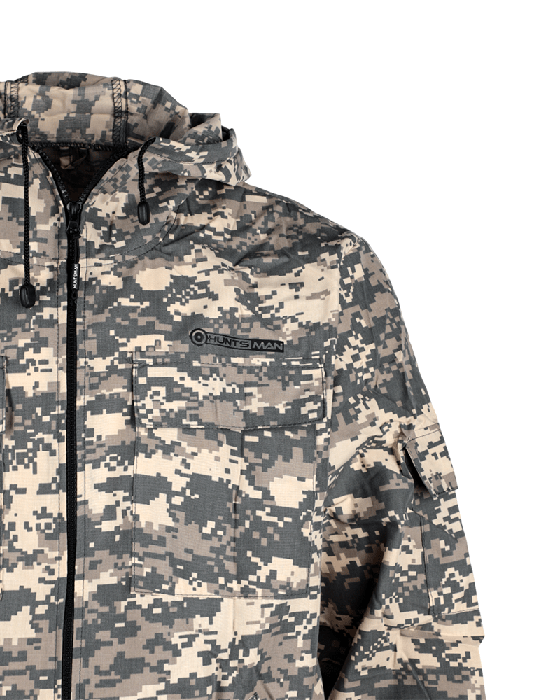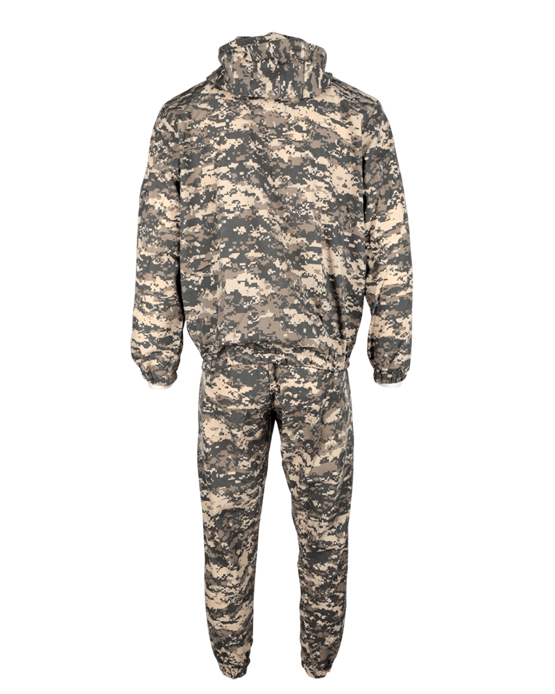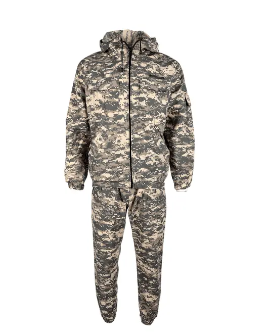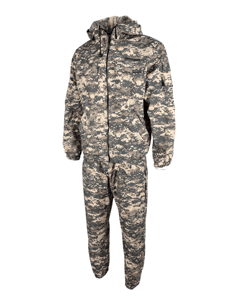 Куртка на молнии с капюшоном с утяжками и москитной сеткой. Низ куртки и рукава на резинке, трикотажные манжеты.Два накладных кармана с клапаном в области груди, два нижних боковых прорезных кармана на молнии. На левом рукаве накладной карман с клапаном. Брюки свободного кроя на резинке по поясу и низу брюк, 2 кармана на молнии.