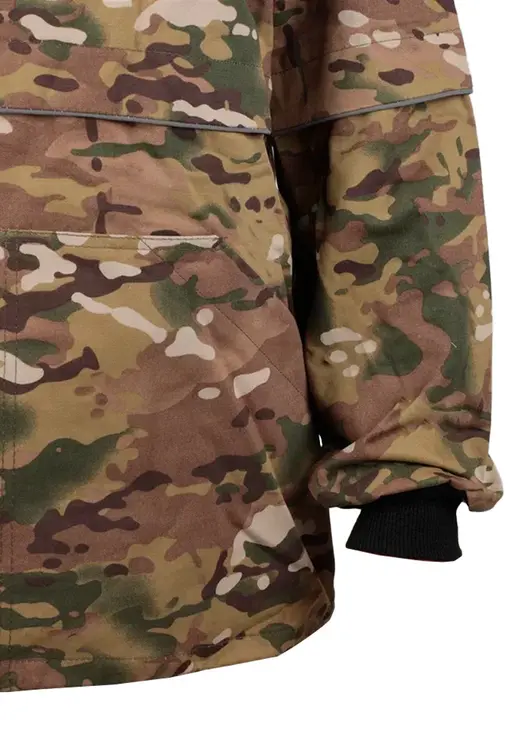 - Большой нагрудный карман, трикотажные манжеты на рукавах и утяжка по низу куртки