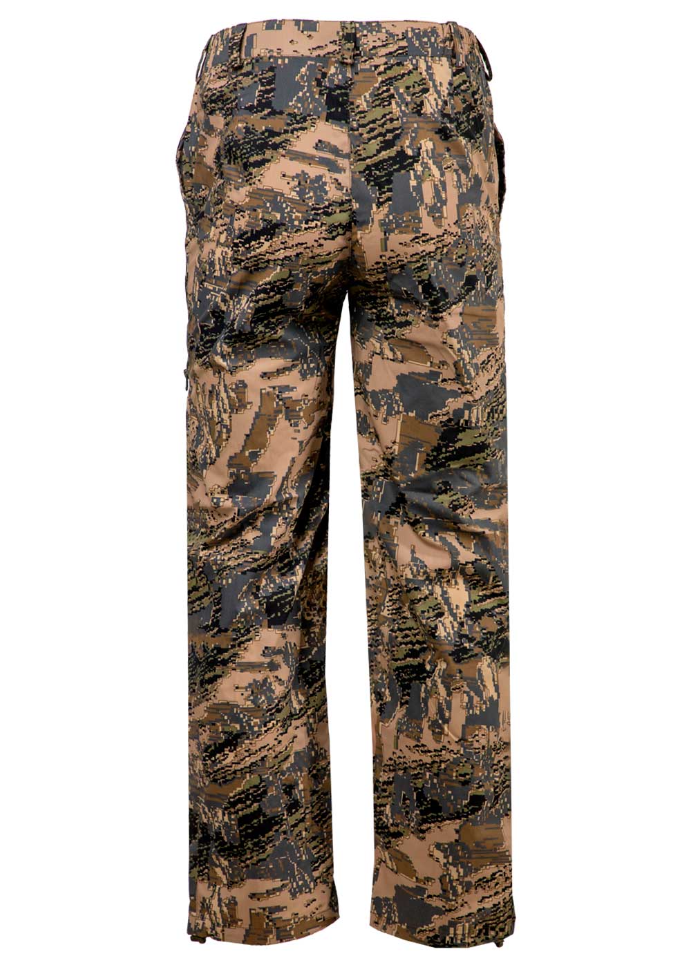 Брюки костюма оснащены четырьмя карманами: два прорезных на бёдрах и два нижних боковых с тракторной молнией. Гульфик застёгивается на молнию с кнопкой. Пояс брюк имеет шлёвки для ремня.