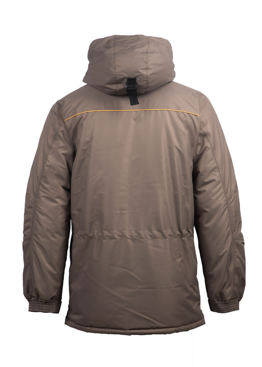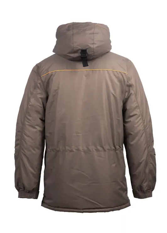 Удлиненная куртка закрывается на двухзамковую молнию и двойную ветрозащитную планку. Объем по талии регулируется внутренней кулиской. Низ куртки можно увеличить по бокам за счет вставок на молнии и с комфортом рыбачить в положении сидя. Высокий воротник утеплен флисом. Капюшон с козырьком пристегивается к куртке молнией, регулируется по краю лица и по объему головы. Двухшовные анатомической формы рукава на манжете с регулировкой. Вентиляционные карманы области подмышек.