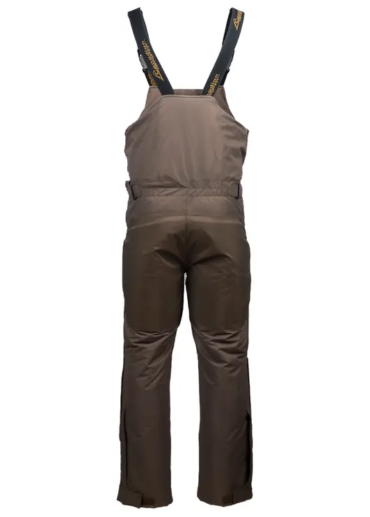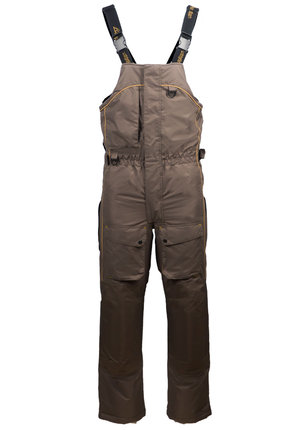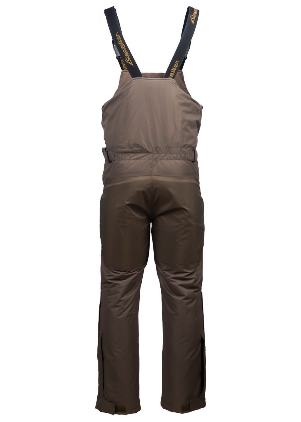 Высокие брюки-полукомбинезон застегиваются на двухзамковую молнию с ветрозащитной планкой. Нагрудный карман и два кармана у пояса с застежкой-молнией. Регулируемые эластичные бретели. Широкий пояс частично собран на резинку, дополнен шлевками. Снегозащитные манжеты со стопорной резинкой. Низ брюк можно увеличить за счет вставок по бокам на молниях и планках с липучками. В области колен и в области сидения изолоновые вставки.