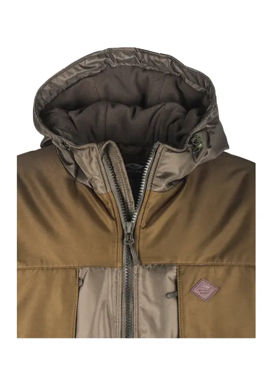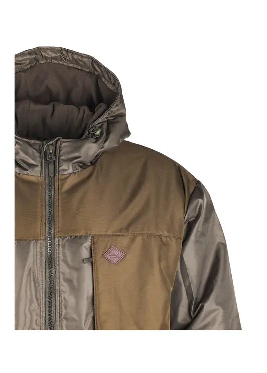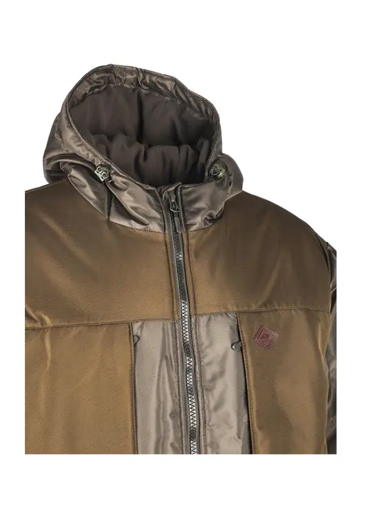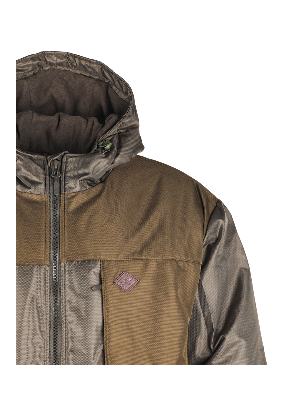 Зимний костюм «Егерь» в цвете олива изготовлен из прочной мембранной ткани «Кошачий глаз» с показателями водонепроницаемости и паропроницаемости 10000/10000. Модель рассчитана на экстремальные температуры до -45°C, включает утеплённую куртку с утяжкой по низу и высокий полукомбинезон. Куртка оснащена съёмным капюшоном, четырьмя вместительными карманами с утеплением из флиса, внутренней ветрозащитной планкой и кулисой для регулировки по талии. Полукомбинезон оборудован эластичными вставками в области пройм, регулируемыми помочами и двумя утеплёнными карманами. Современный утеплитель Эколофт и водоотталкивающая пропитка обеспечивают надёжную защиту от холода и влаги при активном использовании в зимних условиях.