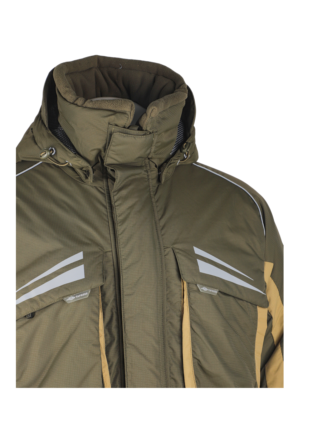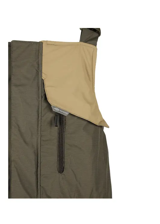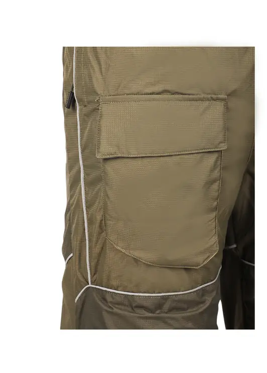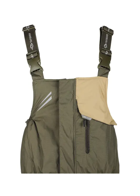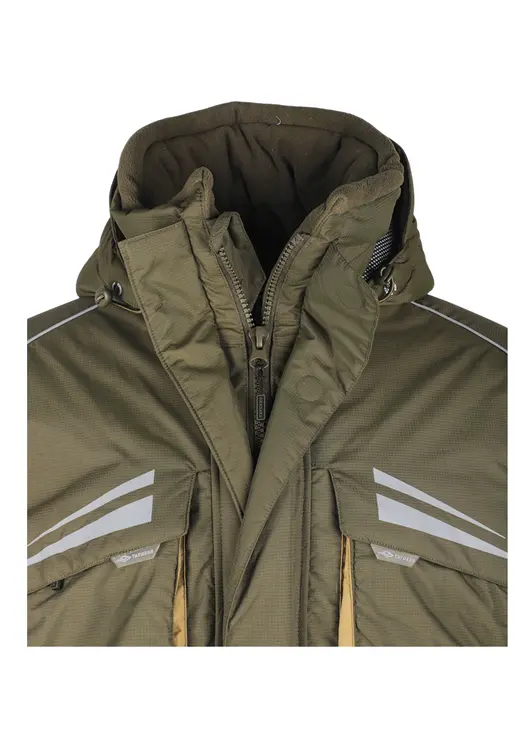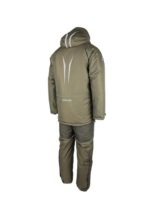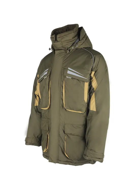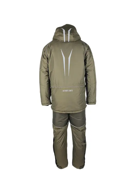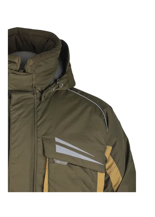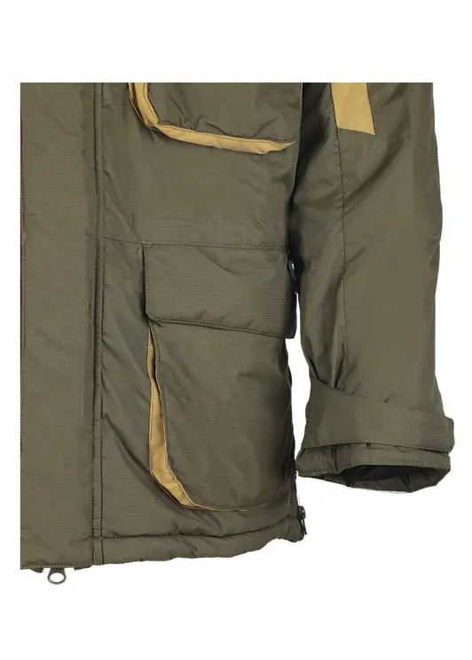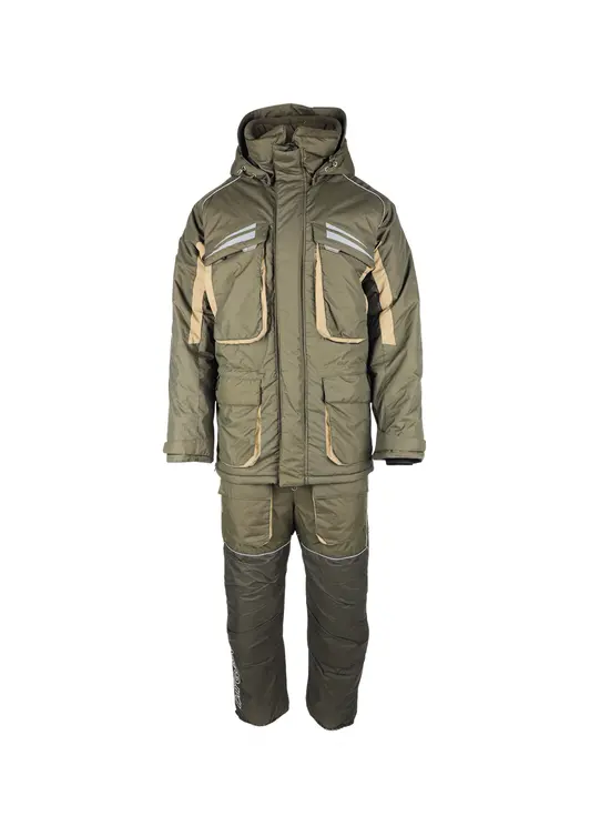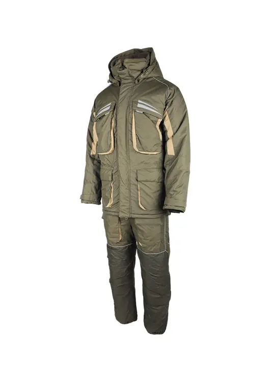 Зимний костюм «Камчатка» в цвете хаки изготовлен из современной мембранной ткани Таслан (100% нейлон) с показателями водонепроницаемости 10000/10000 мм вод. ст. Прочный материал дополнен усиленными вставками «кошачий глаз» в зонах повышенной нагрузки. Утеплитель «Русский север» в сочетании с термоподкладом обеспечивает защиту от холода до -45°C. Модель включает куртку с капюшоном и брюки-полукомбинезон. Куртка оснащена вместительными карманами, двойной ветрозащитной планкой и регулируемым капюшоном с козырьком. Брюки имеют регулируемые лямки, противосугробные манжеты и изолоновые вставки. Костюм оборудован неопреновыми манжетами, светоотражающими элементами и ветрозащитной юбкой, комплектуется магнитной застёжкой и специальной сумкой для хранения.