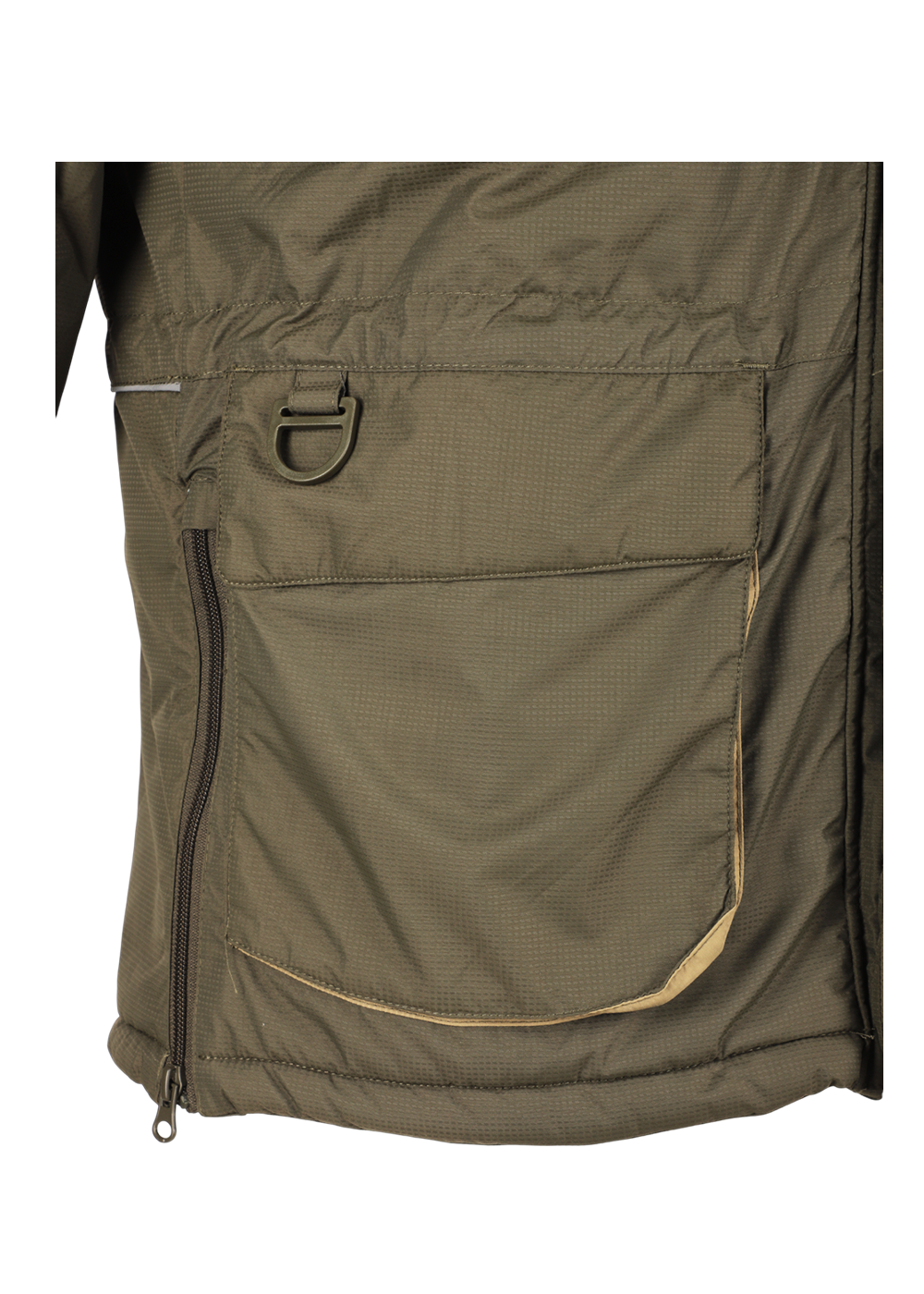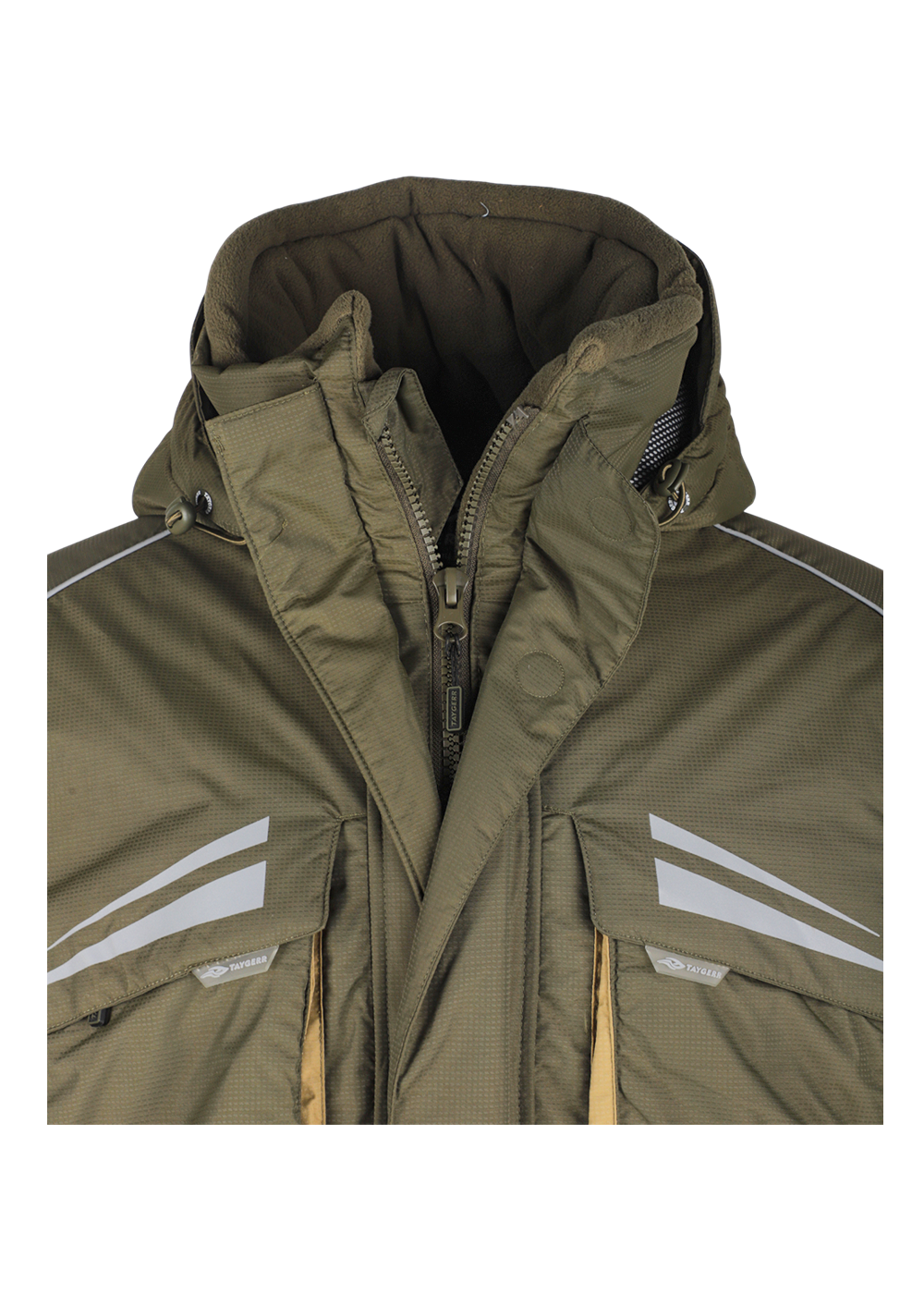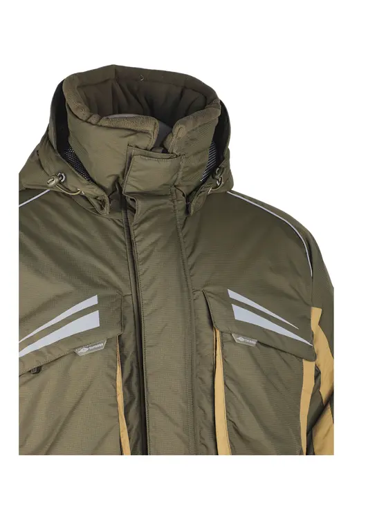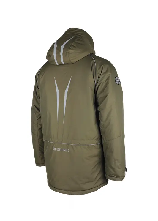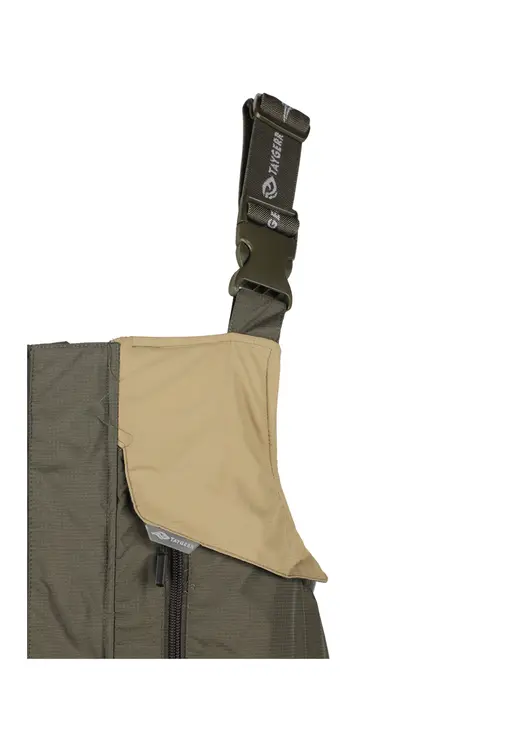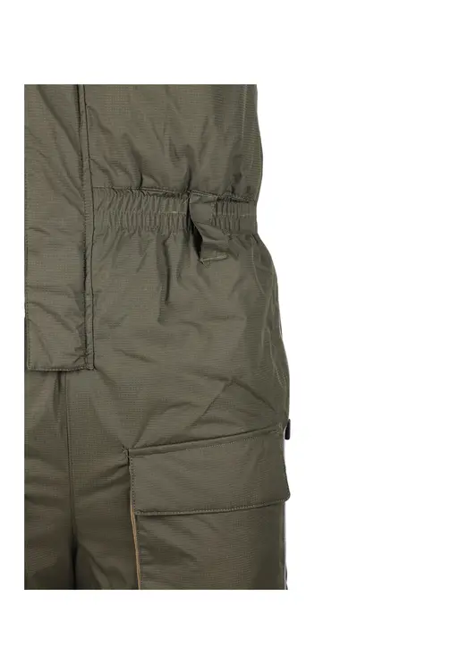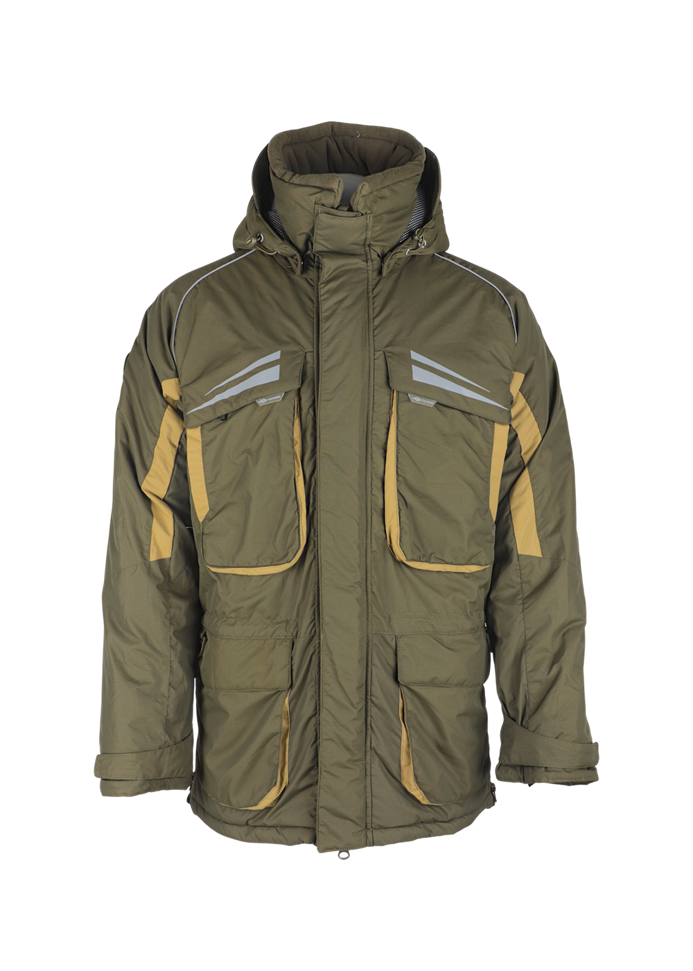 Зимний костюм «Камчатка» в цвете хаки изготовлен из современной мембранной ткани Таслан (100% нейлон) с показателями водонепроницаемости 10000/10000 мм вод. ст. Прочный материал дополнен усиленными вставками «кошачий глаз» в зонах повышенной нагрузки. Утеплитель «Русский север» в сочетании с термоподкладом обеспечивает защиту от холода до -45°C. Модель включает куртку с капюшоном и брюки-полукомбинезон. Куртка оснащена вместительными карманами, двойной ветрозащитной планкой и регулируемым капюшоном с козырьком. Брюки имеют регулируемые лямки, противосугробные манжеты и изолоновые вставки. Костюм оборудован неопреновыми манжетами, светоотражающими элементами и ветрозащитной юбкой, комплектуется магнитной застёжкой и специальной сумкой для хранения.