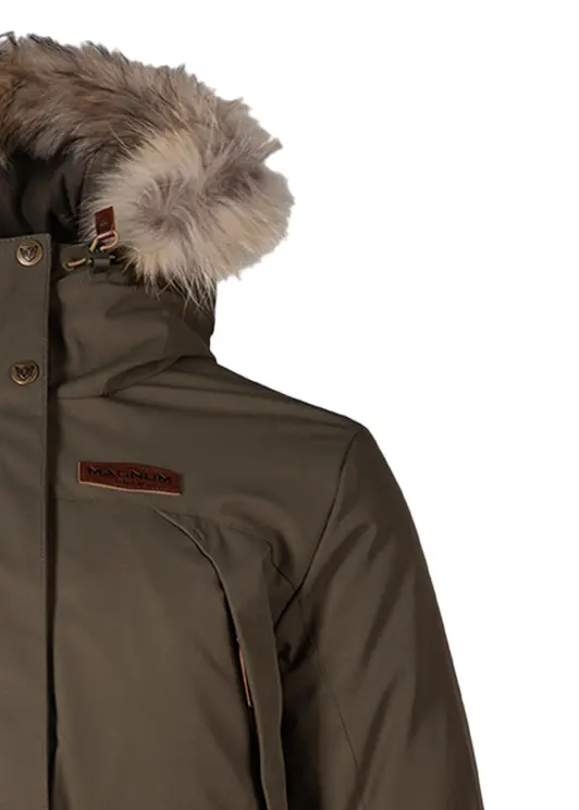 Костюм KARELIA - зимний костюм в линейке Magnum Gear. Основная концепция - действительно теплый зимний костюм, при этом выполненный с учетом женской анатомии. Костюм изготовлен из мягкой и тактильно приятной ткани Twill с современной мембраной MAGNUM BOREY. Мембрана обеспечивает защиту от ветра и осадков, при этом позволяет отвести излишнюю влагу от тела. За теплоизоляцию отвечает модульный утеплитель WARMSET, не имеющий аналогов на рынке России по ключевым параметрам. Фирменные теплые карманы для согрева рук. Магнитная фурнитура. Съемная опушка капюшона из натурального меха енота.