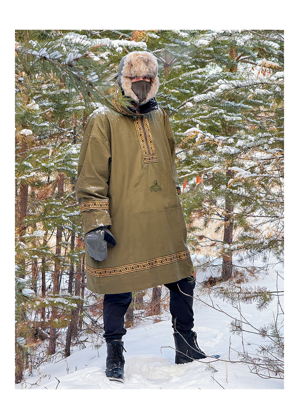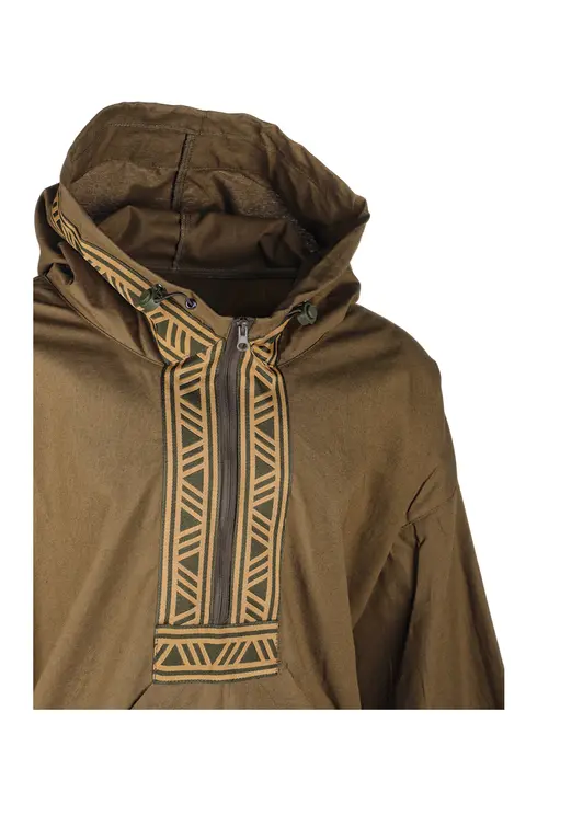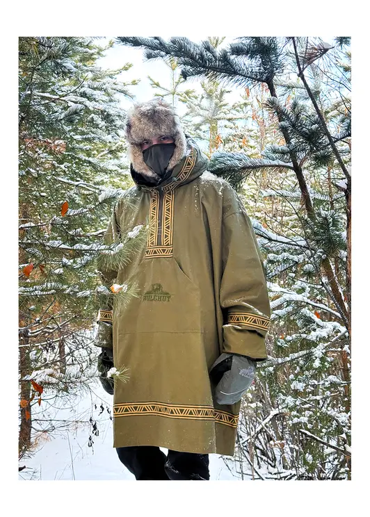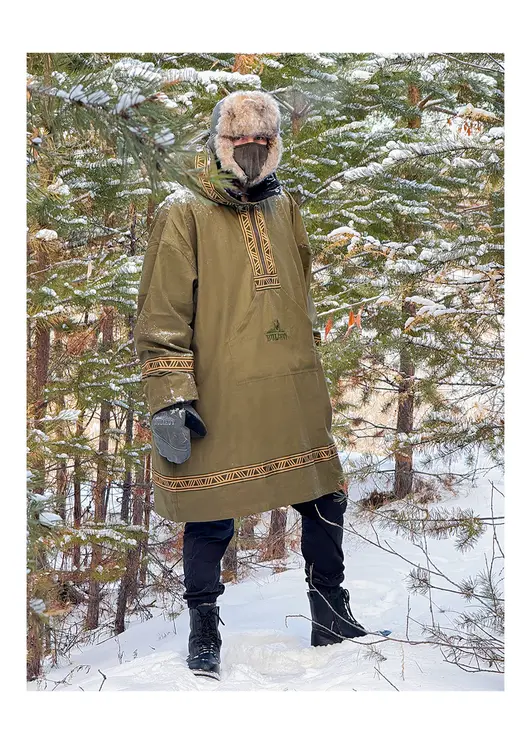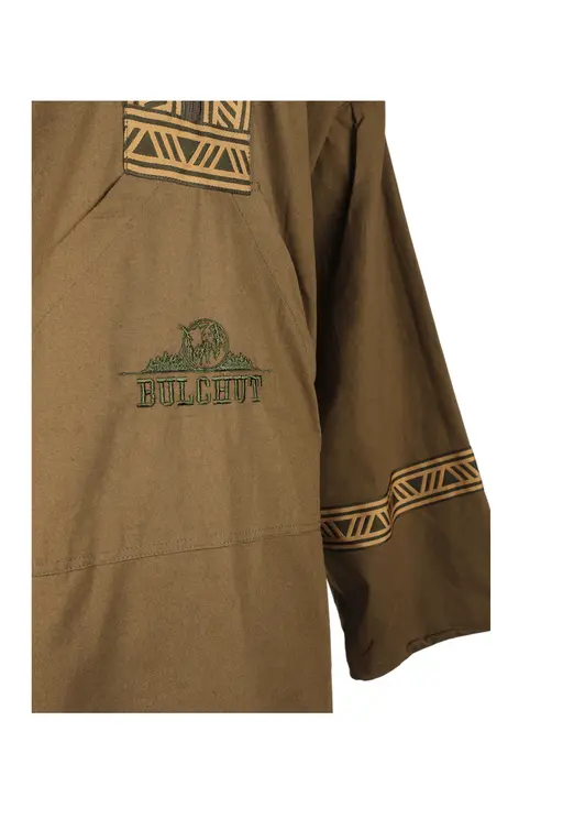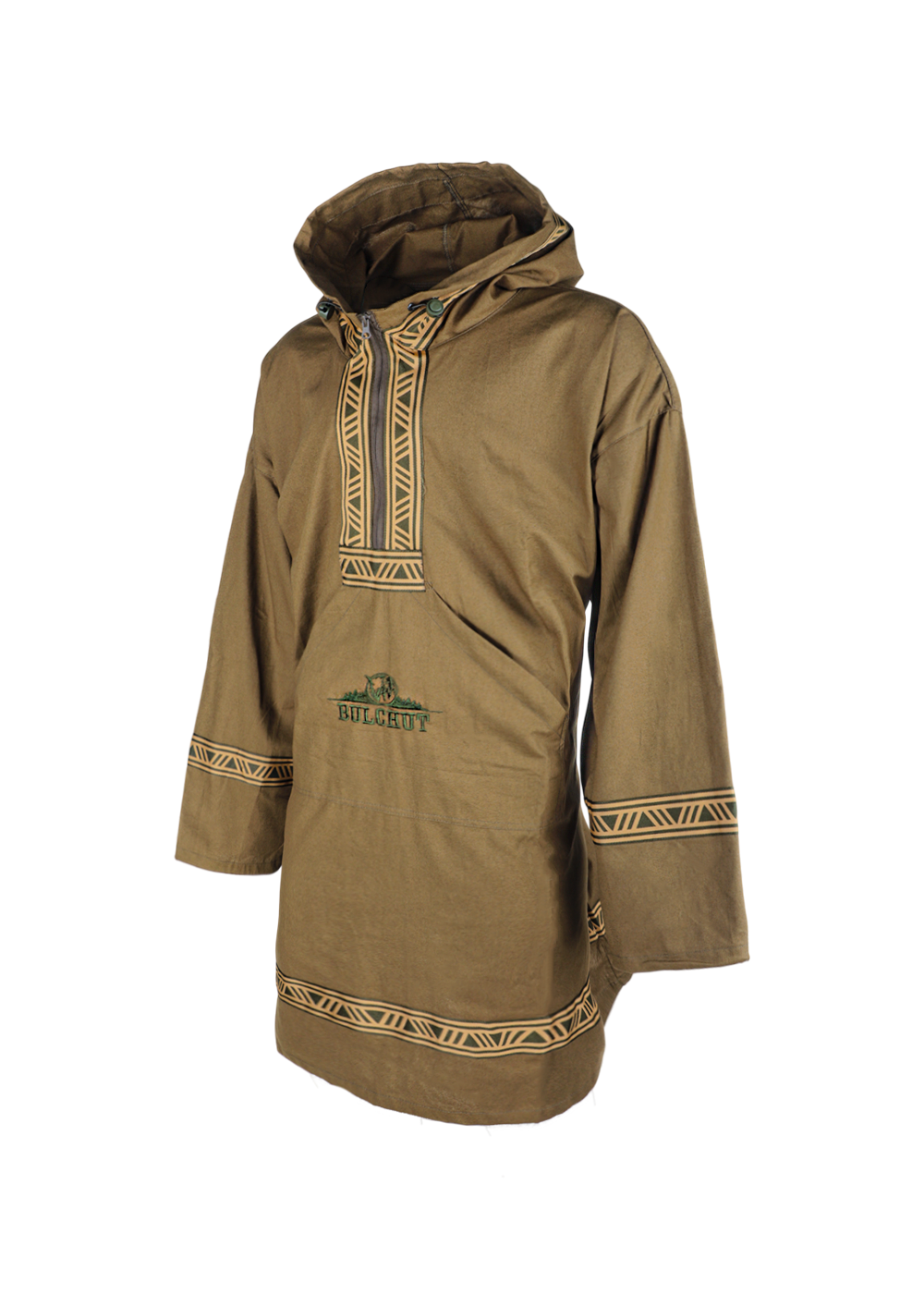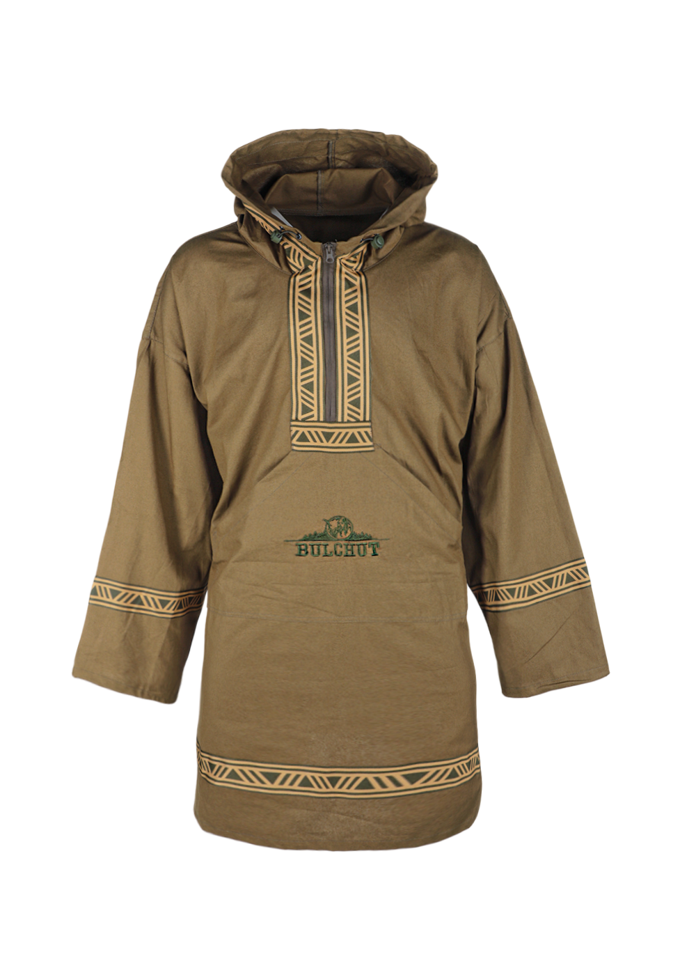 Анорак Камлейка Bulchut в цвете хаки представляет собой практичную верхнюю одежду, созданную по традиционной технологии с современными усовершенствованиями. Модель выполнена из прочной палаточной ткани, обеспечивающей надежную защиту от ветра и осадков.