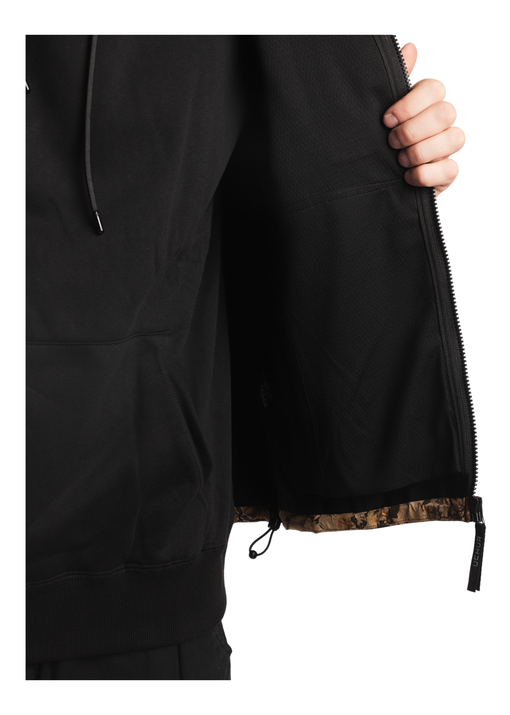 - Капюшон регулируется по объёму эластичными шнурами;