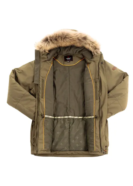 Мужская зимняя парка для холодной погоды из популярной ткани Исландия. Ткань отличается мягкостью, бесшумностью, отсутствием блеска. За счет обработки оригинальным составом TEFLON ткань отталкивает воду и легко очищается от загрязнений. Качественная мембрана обеспечивает защиту от ветра и осадков, при этом отводит излишнюю влагу от тела. Топовый утеплитель нового поколения WARMSET обеспечивает отличную теплоизоляцию. Фирменные теплые карманы. Магнитная фурнитура. Съемная опушка из натурального меха енота.
