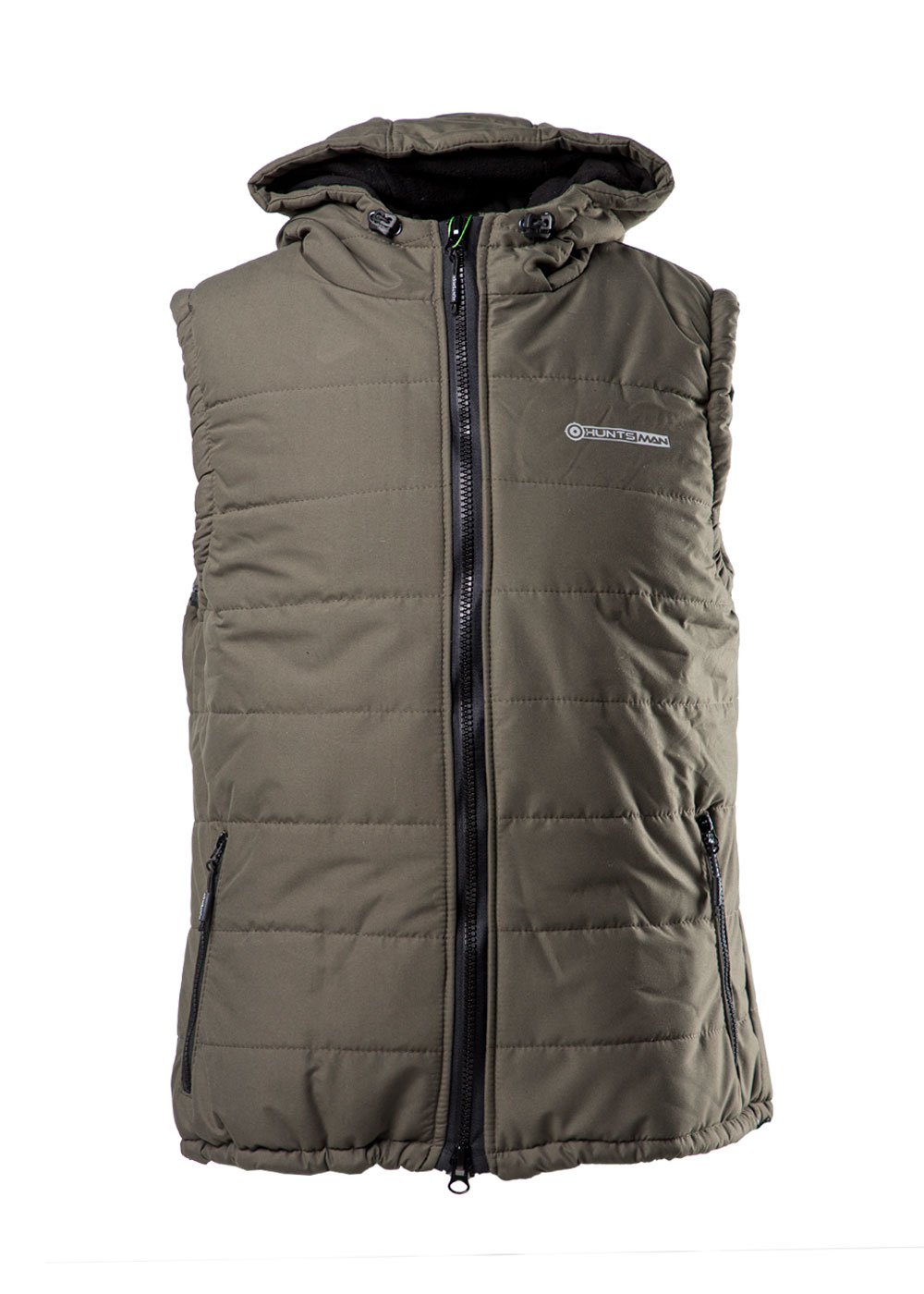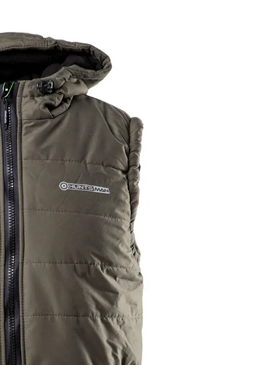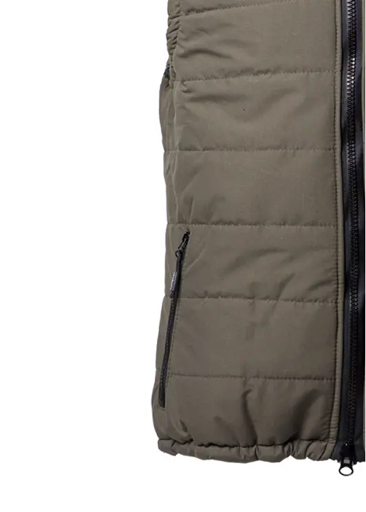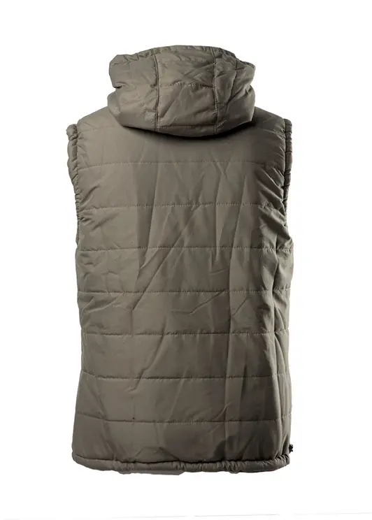 Жилет утеплённый, простёганый, с капюшоном, с центральной застёжкой на молнии, с нижними прорезными карманами на молнии. Ширина капюшона по лицевому краю и ширина по низу регулируется с помощью резинки и фиксаторов.