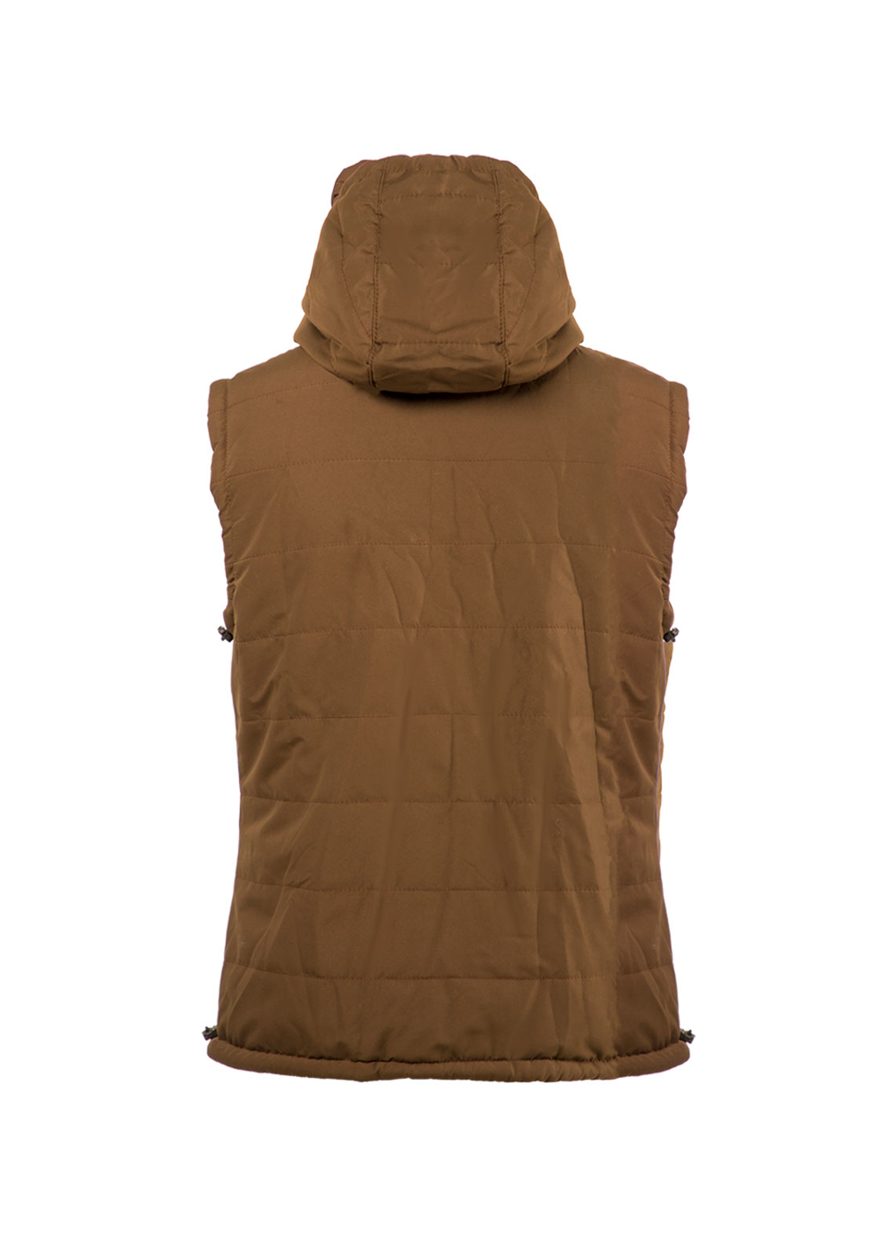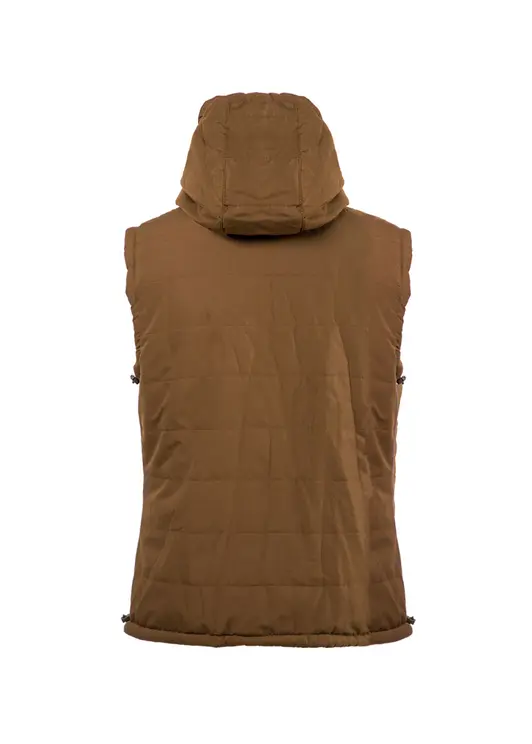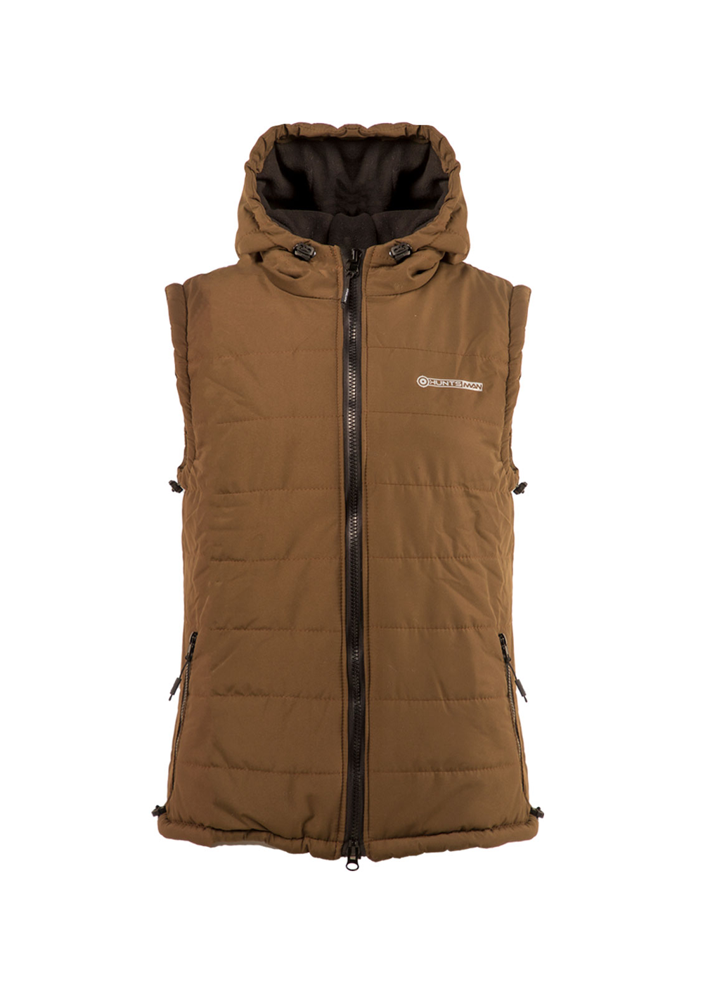 Жилет демисезонный Huntsman Фристайл выполнен из ткани «Канада» коричневого цвета. Он утеплён материалом Radotex и имеет подкладку из Polarfleece плотностью 130 г/м². Жилет застёгивается на центральную молнию и имеет нижние прорезные карманы, также на молнии. Капюшон регулируется по ширине и глубине с помощью резинок и фиксаторов.