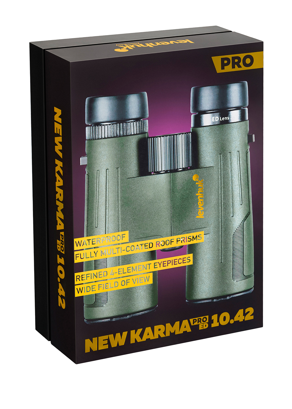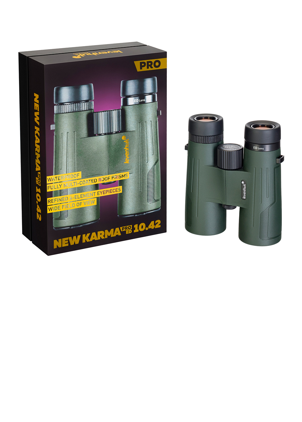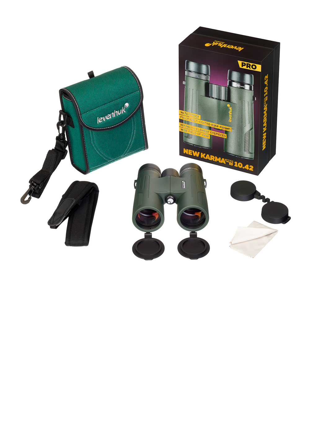 Бинокль Levenhuk New Karma PRO ED 10x42 – отличный выбор для путешественников, охотников, любителей природы и активного туризма, охранников и спасателей. На этот прибор можно положиться в любых условиях наблюдений: в городе и на природе, при ярком солнечном свете и в сумерках, при спокойной и бушующей погоде. Бинокль не боится тумана, дождя, снега и даже прямого воздействия воды, например, при падении в водоем или лужу; ему не повредят пыль, песок и грязь – все благодаря всесторонней герметизации корпуса, соответствующей стандарту IP67. Внутри прибор заполнен азотом, который помогает предотвратить попадание влаги извне, препятствует образованию конденсата и защищает элементы конструкции от коррозии, окисления, размножения грибков и т. д. Бинокль Levenhuk New Karma PRO ED 10x42 гарантирует формирование неизменно четкого, яркого и реалистичного изображения окружающего мира – в этом ему помогает продуманная оптическая схема, построенная на компактных roof-призмах, элементы которой изготовлены из многократно просветленного стекла BaK-4, и линз из ED-стекла, которые тоже имеют многослойное просветляющее покрытие. Стоит отметить также и конструкцию окуляров и объективов: они состоят из 4 элементов в 3 группах и 3 элементов в 2 группах соответственно, что добавляет видимой картинке «живости».