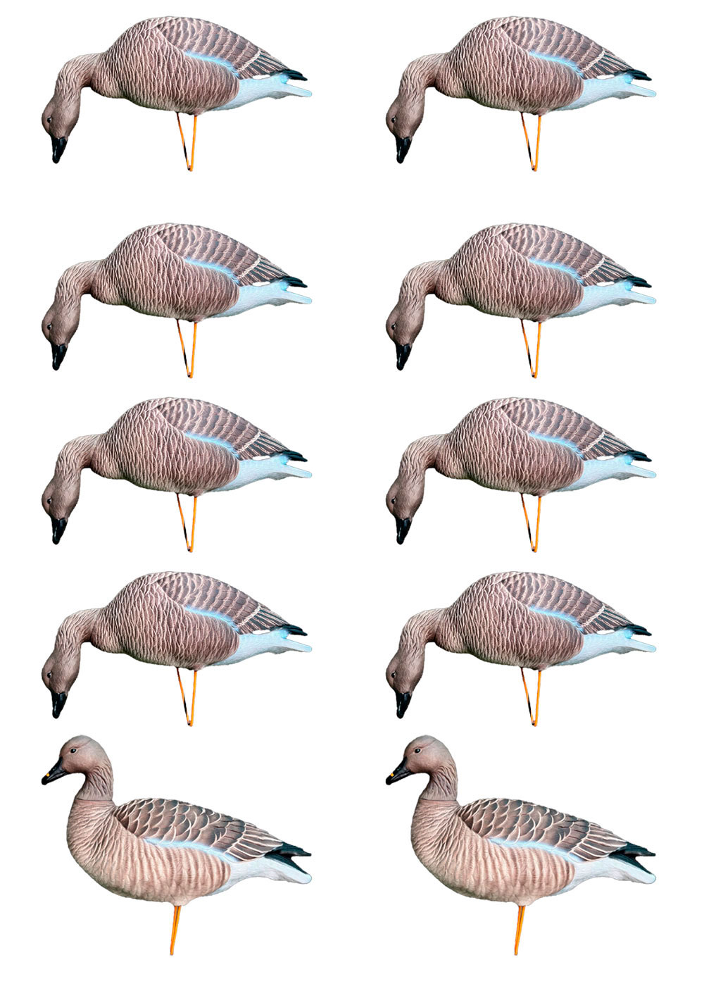 Полевые чучела гуся гуменника Oscar Decoys Elite 3D Bean Goose, мягкий пластик, 10 шт. (8 кормящихся + 2 спокойных), арт. EGG10 Полужесткий сминаемый пластик, который легко принимает и хорошо держит форму чучела. Устанавливаются на поле или болото в местах пролета и кормежки гуменников. Чучела устанавливаются в землю на стеклопластиковую стойку с фиксатором и заостренным концом. Рельефная 3D поверхность имитирует перо птицы, матовая покраска с детальной прорисовкой пера и характерных видовых признаков. Вес одного чучела без стойки 320-350 грамм. Длина кормящегося муляжа - 61 см, спокойного - 53 см. Комплект состоит из 10 чучел: 8 кормящихся и 2 спокойных.