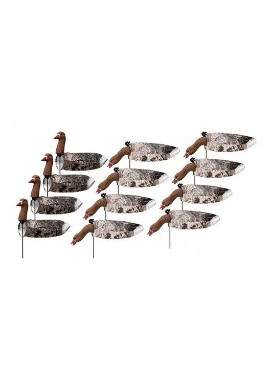 Чучела для охоты ветровые флюгера Flock Decoys гусь белолобый. В комплект входит 12 штук приманок- 4 штуки в сторожевой позе- 8 штук в кормящейся позе. Чучела поставляются в разобранном виде, в комплект входит подробная инструкция по сборке. Ветровые флюгера белолобого гуся от Flock Decoys отлично зарекомендовали себя среди охотников. Главная особенность приманок - легкий вес, реалистичность, компакность, мобильность и простота установки. Преимущество данных гусей является не только вес, но и уникальный материал изготовления. Пакет, визуально изображающий тушку приманки, изготовлен из нетканого материала Tyvek произведенной компанией DuPont. Этот материал состоит из волокон полиэтилена высокой плотности, сочетает в себе такие характеристики, как прочность, водостойкость и стойкость к механическим воздействиям. Благодаря уникальной конструкции приманка сохраняет объемный вид даже при отсутствии ветра. Это позволяет в кратчайшие сроки расставлять и собирать приманки в полевых условиях. Все приманки окрашены антибликовым, матовым покрытием по специальной технологии, не блестят на солнце и не подвержены ультрафиолетовому излучению. Этот комплект чучел отлично зарекомендовал себя среди охотников благодаря своей эффективности и удобству в использовании.