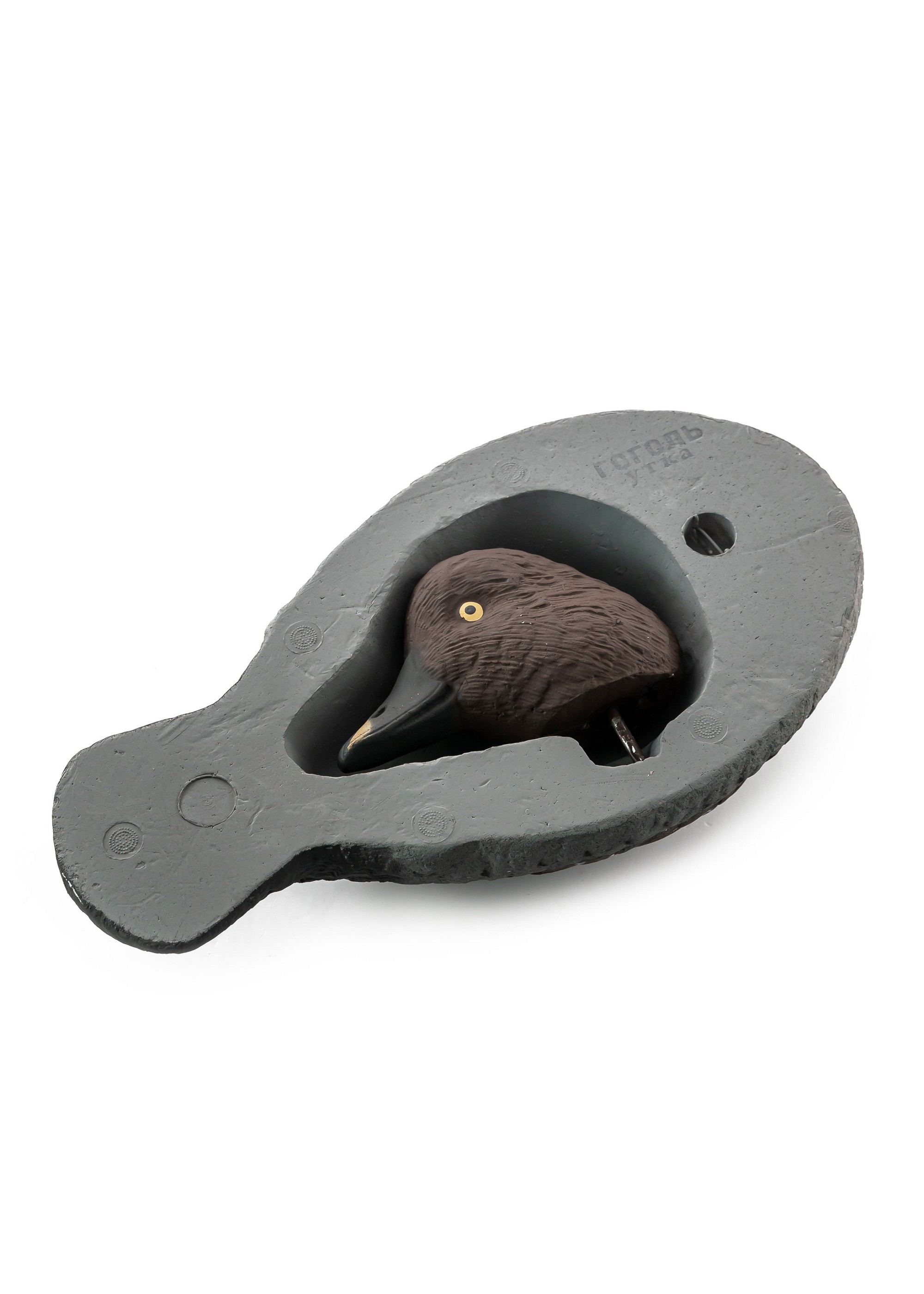 Чучело гоголя предназначено для приманивания летящих и сидящих уток. Рельефная поверхность. Высокая реалистичность. Легкое и компактное чучело. Голова съемная, крепится к туловищу (вкручивается). В нижней части туловища чучела предусмотрена специальная ниша для укладки съемной головы при транспортировке, что делает данные чучела более компактными. В нижней части чучела предусмотрено крепление для подвязки веревки (шнура).