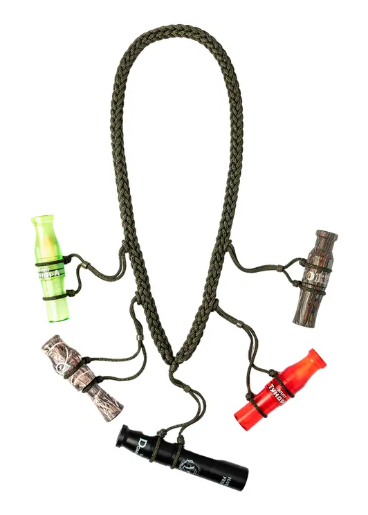 Практичный, удобный подвес на 5 духовых манков. Подвес состоит из двух частей: неопренового Неопрен ремешка и плетеного шнурка с креплениями для манков в виде удавки. Для подвеса 4 манков предусмотрено две петли. Одиночная петля предусмотрена для подвеса духового манка с одной точкой крепления. Конструкция узла исключает самопроизвольное расслабление удавки, что исключает возможность потери манка во время охоты.